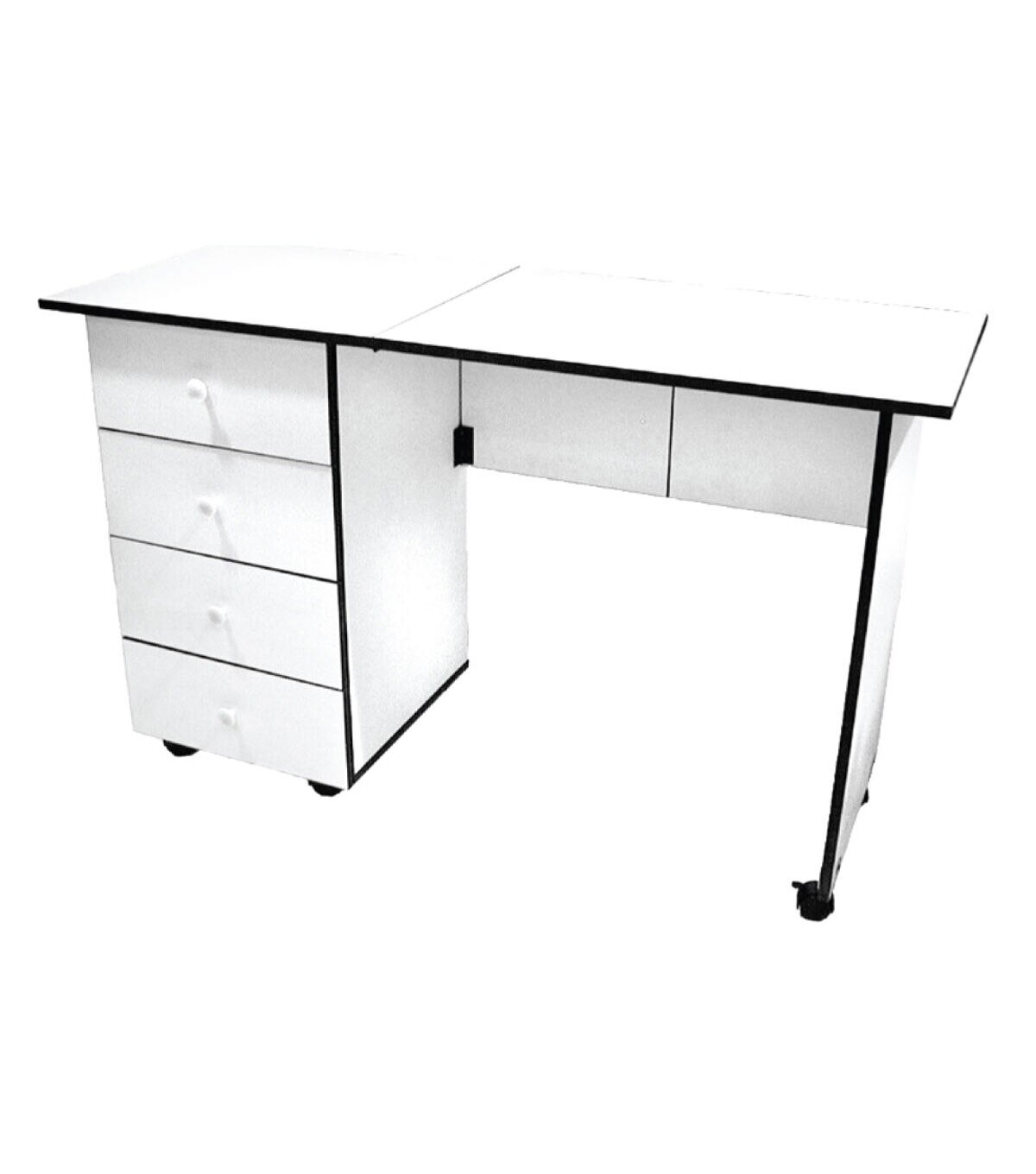 The Sew Essentials Sew & Stitch Table is a complete storage solution for your needlework, sewing, quilting and crafting projects. Crafted from sturdy walnut wood, this table has a smooth and spacious working surface. Equipped with five drawers, you can use them for organizing your craft supplies. For added convenience, it can be easily folded for easy storage. Thanks to the locking casters, you can move it from one room to another. This sew and stitch table needs to be assembled.