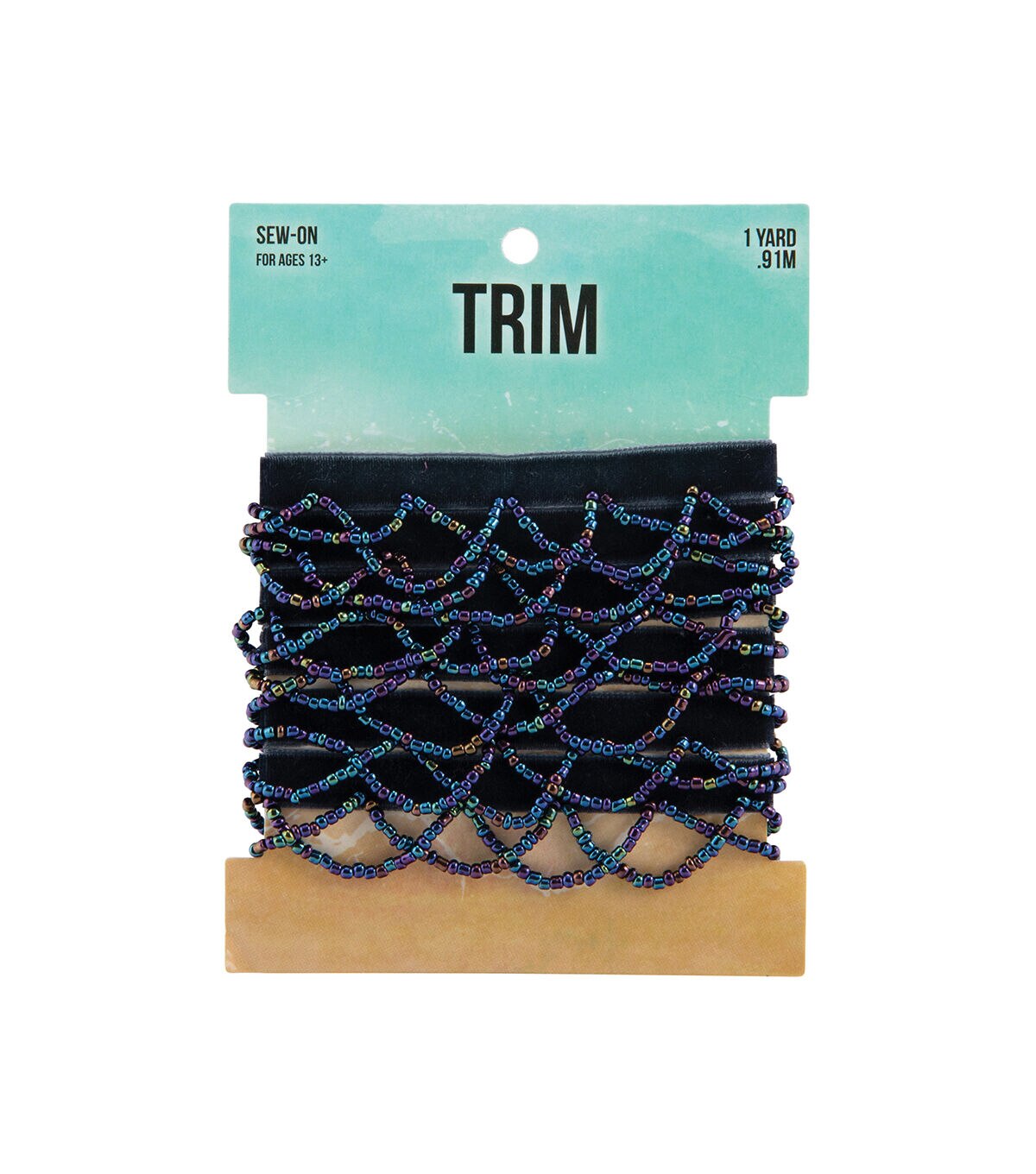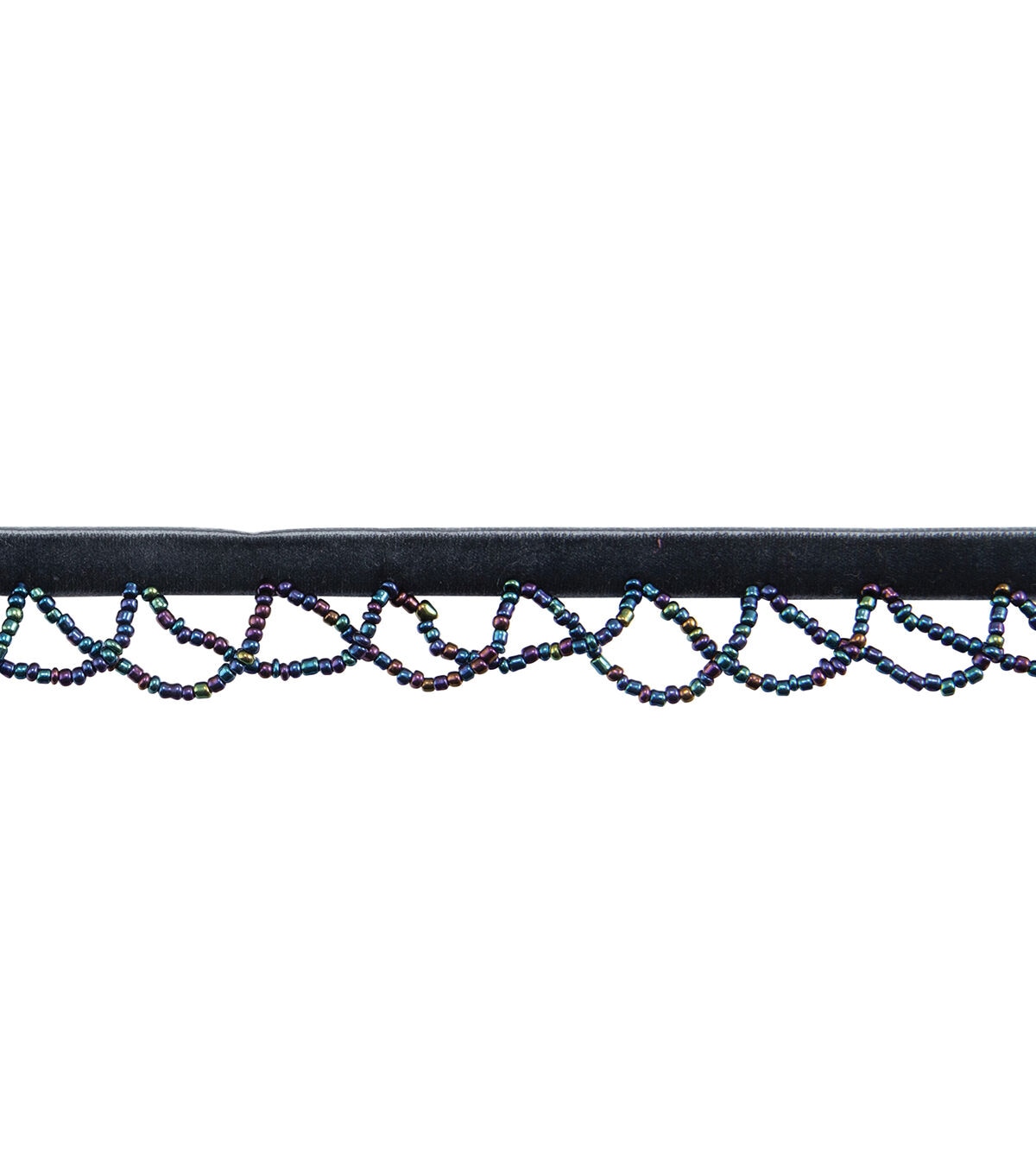 Add style and visual charm to your sewing projects with the Sew-on Mermaid Oil Slick Beaded Scallop Trim. This sew-on trim is designed with a velvet ribbon and adorned with oil slick beads in the hues of purple, green and blue in a scallop pattern.