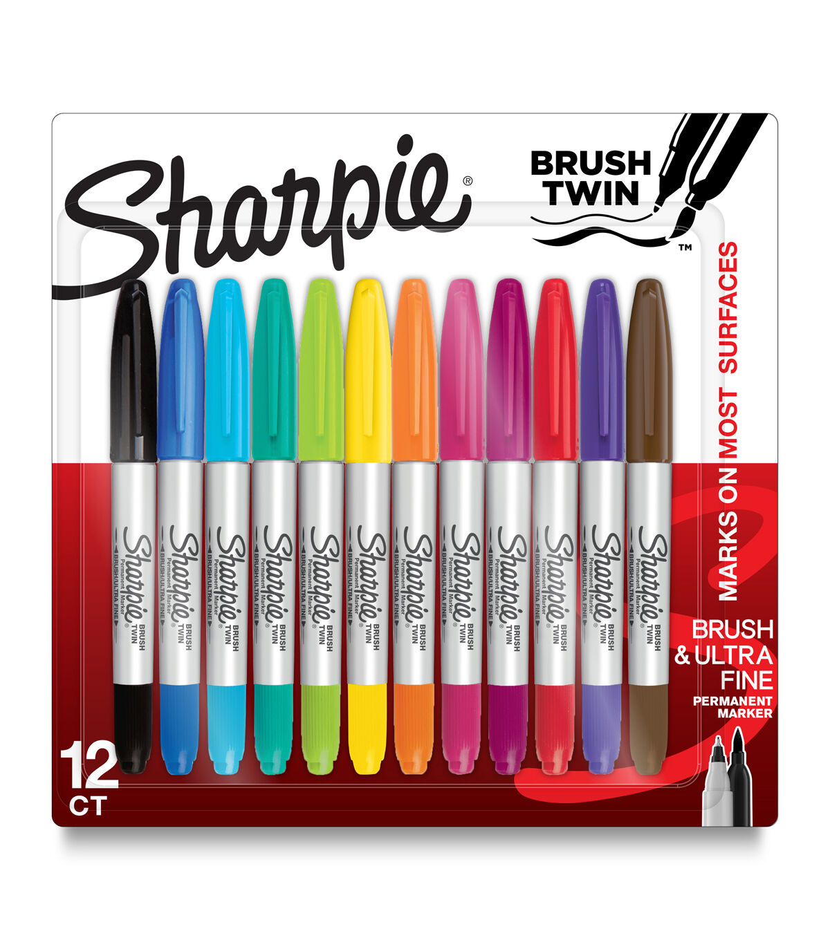 Perfect for broad strokes or fine detailing, the Sharpie Assorted Twin Brush Permanent Markers are a must-have in your art supplies. This pack comprises 12 permanent markers that are designed with a flexible brush tip on one side and an ultra-fine tip on the other. The brush tip creates lines that vary from thick to thin in one stroke, while the fine tip is great for adding fine details to papercrafting creations.