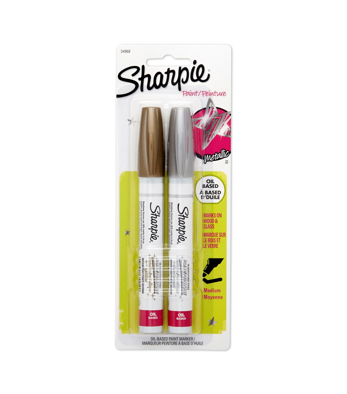 Explore your creative skills with the Sharpie Medium Point Metallic Paint Markers-Gold & Silver, which are AP certified and xylene free. Use these permanent, oil based, valve action paint markers to add opaque and glossy designs or sentiments on light and dark surfaces. Great for metal, pottery, wood, rubber, glass, plastic, stone and more, they are quick drying, and are also fading, abrasion and water resistant.
