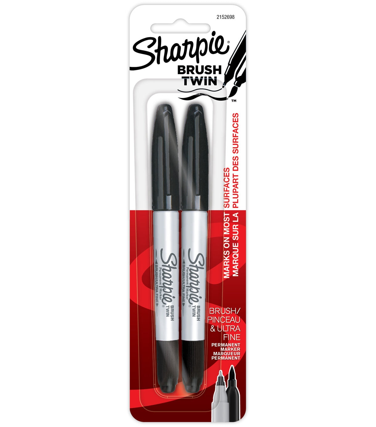 Use the Sharpie Black Twin Brush Permanent Markers to express yourself in creative ways. This pack includes two permanent markers. One of the markers comes with a bold fine tip while the other marker is designed with a chisel tip to add fine details to artwork. You can use them on surfaces such as paper, plastic, metal and wood. The ink dries quickly and is resistant to water and fading.