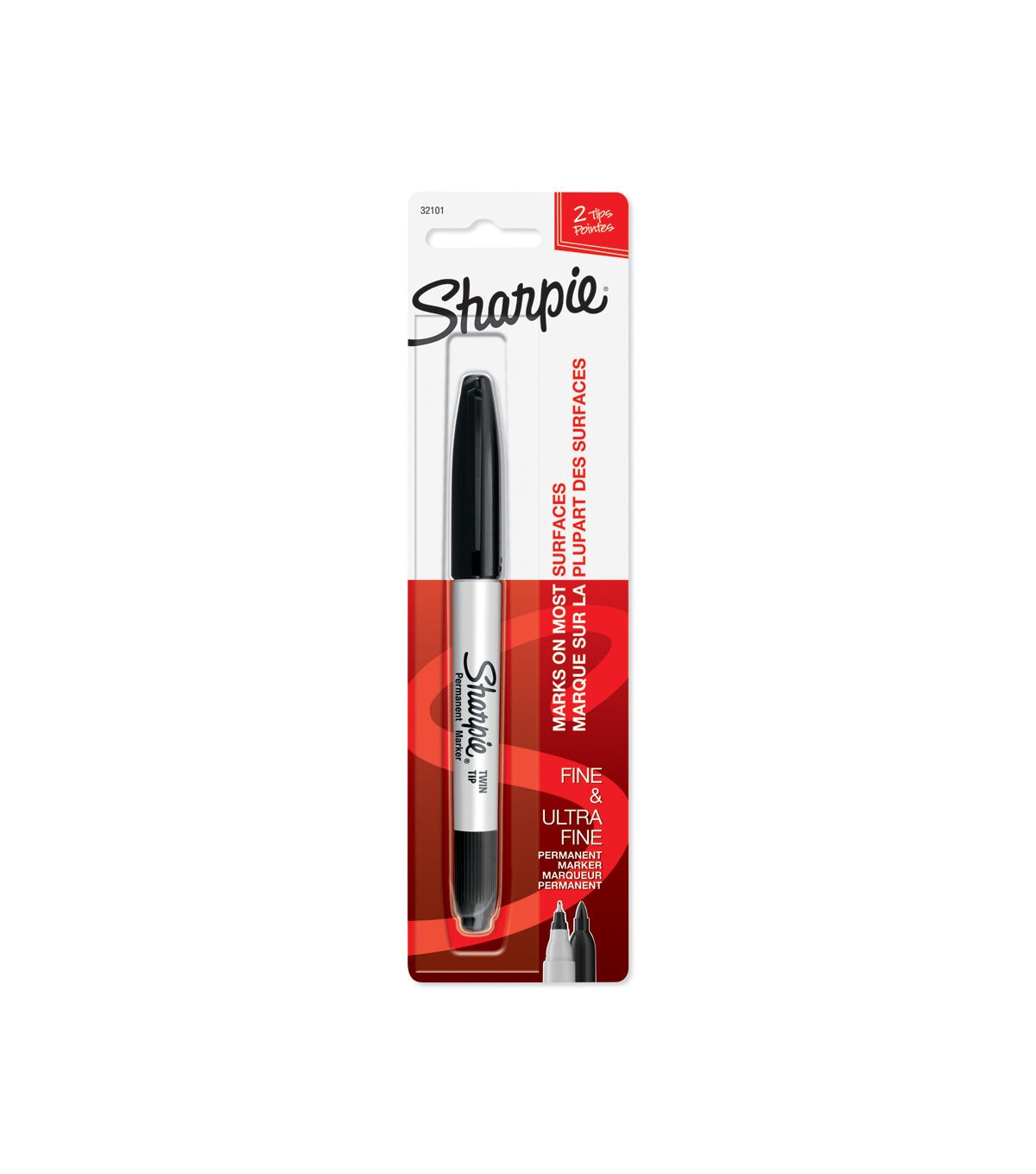 Sharpie Permanent Marker: Twin Tip. Need we say more? Sharpies have been one of the most popular permanent markers ever made. These markers are known for quickly drying; being permanent and water resistant on most hard-to-mark surfaces such as glass; metal; photos; coated paper and most plastics. This package contains one black double-tip Sharpie marker: one ultra fine and one fine tip. Made in USA. AB134