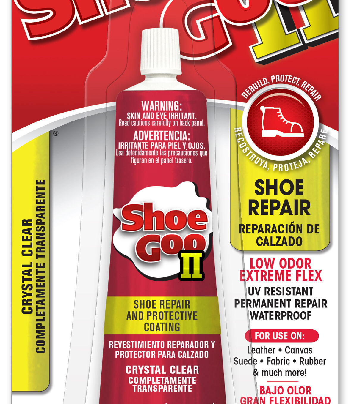 Shoe GOO ll, formulated using a premium polymer technology, offers virtually the same performance characteristics you love with Original Shoe GOO, now with LOW ODOR! It is crystal clear and offers superb UV and water resistance. Permanently repair/protect all types of footwear!