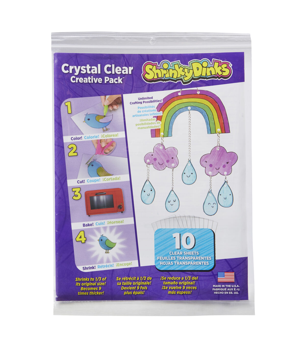 The Shrinky Dinks Sheet Creative Pack-Crystal Clear lets your kids make unique plastic pieces that look like glass. Just draw or trace an image on the sheet then color, bake and shrink. Make charms, keychains, ornaments, jewelry, toys or anything you can imagine. Create one-of-a-kind items or mass produce your original image for everyone. The pack includes ten 8 x 10-inch clear, transparent sheets and instructions for making and baking. Adult supervision is required during baking.