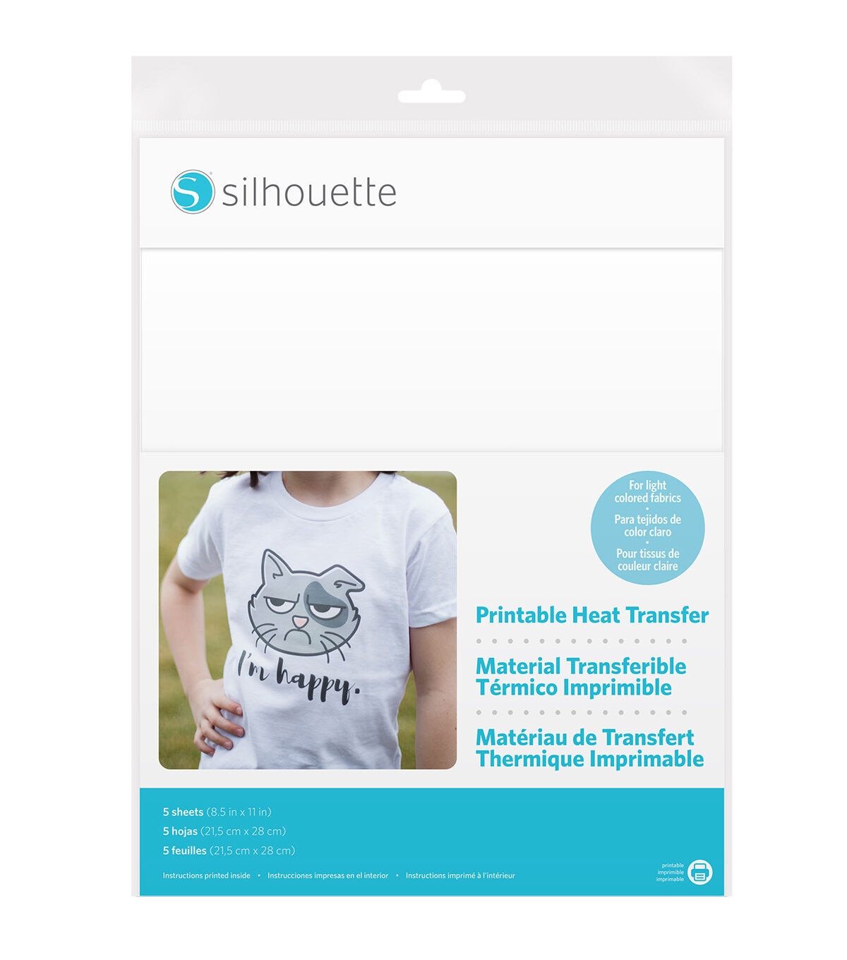 Use Printable Heat Transfer for light fabrics on lighter fabric surfaces. Print an image and cut out around the contour using the Silhouette cutting machine's Print & Cut feature. You can then iron your custom image onto a fabric surface, such as a t-shirt. This material turns semi-transparent when ironed and should only be used on white or very light fabrics.