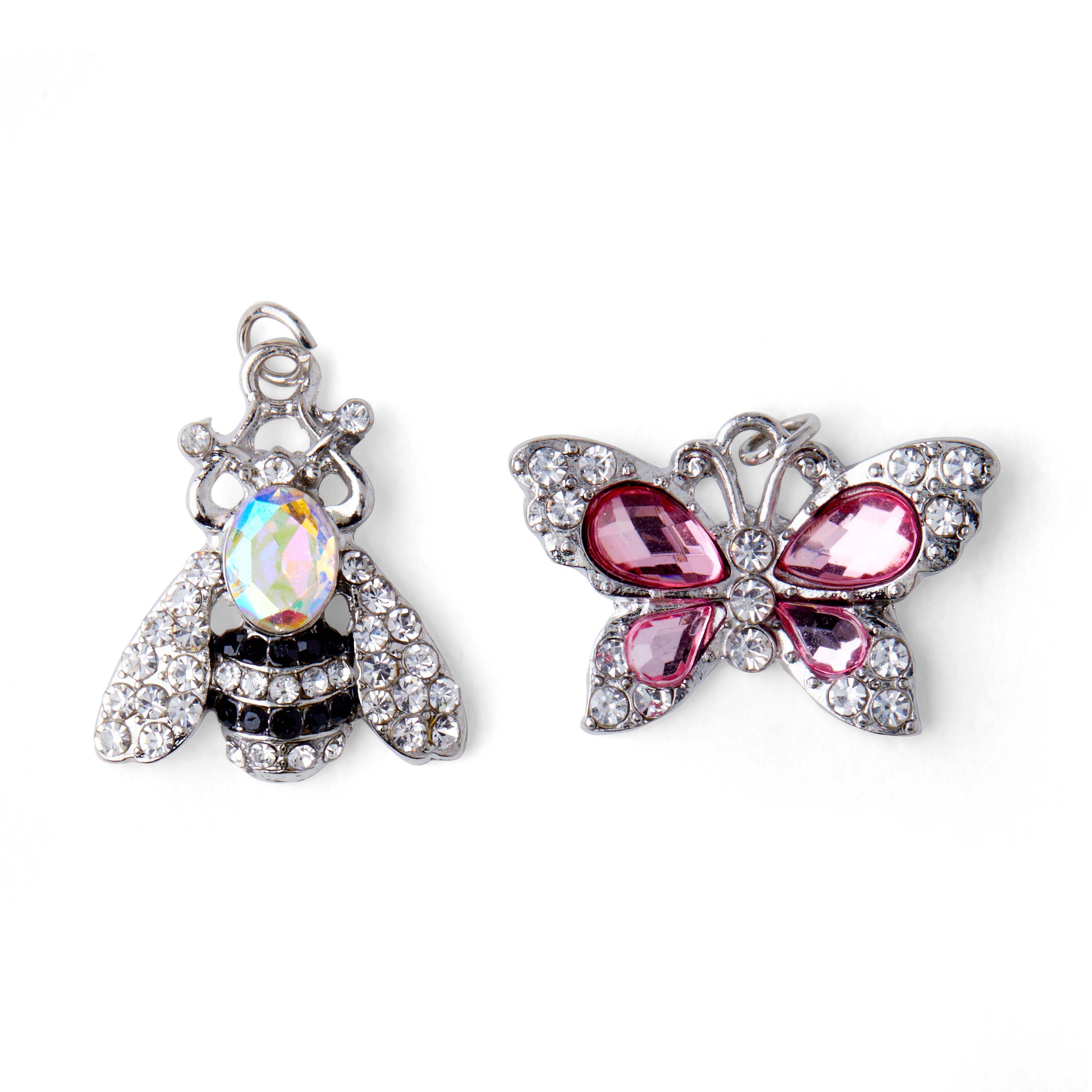 Use the hildie & jo Silver Bug & Butterfly Charms-Multi Stones in your next DIY project. This pack comes with two silver charms. It includes a bee-shaped charm, with an oval clear stone, with facets for a body and clear round stones at the end of the antenna. Its main body has clear and black stones in rows, while the wings are clear round stones, encased in silver. The second charm is shaped as a cute butterfly with its center made of three round stones. Its wings are silver with clear stones at the edges. There are four teardrop pink stones, one large at the top and one small at the bottom, on each wing. Each charm has a jump ring for easy attachment.