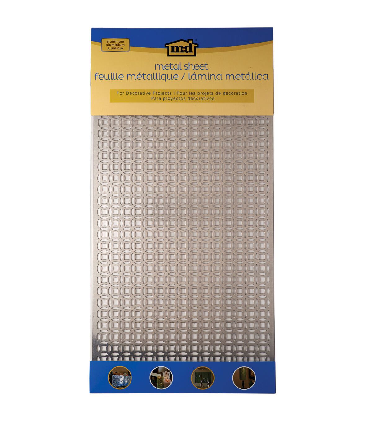 Silver Colored Metal Sheet. Create your own DIY projects! Perfect for lamp shades, a tool caddy, a jewelry organizer, candles and more! Cuts easily with tin snips! This package contains one 24x12 inch silver colored metal sheet. Comes in a variety of designs. Each sold separately. Made in USA.