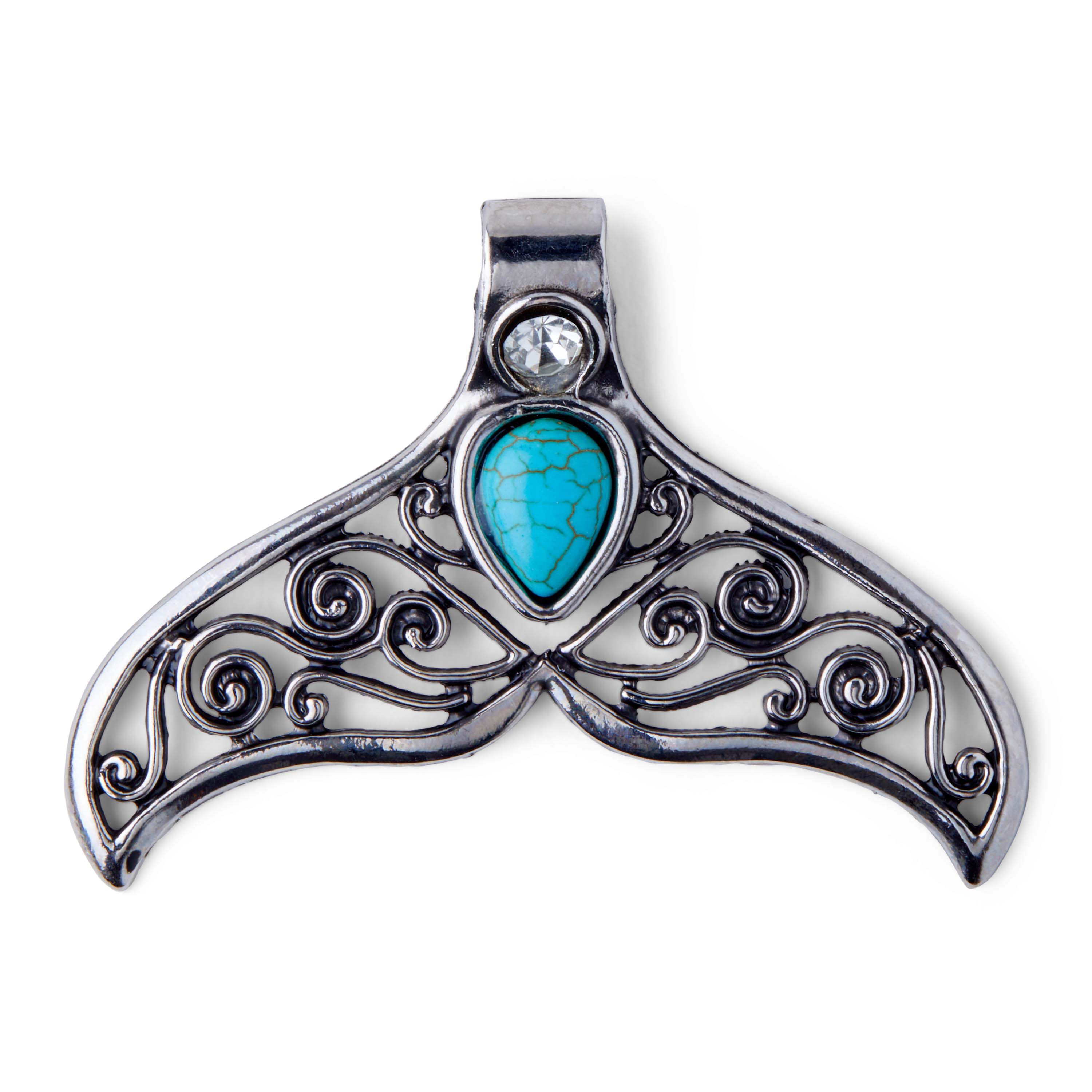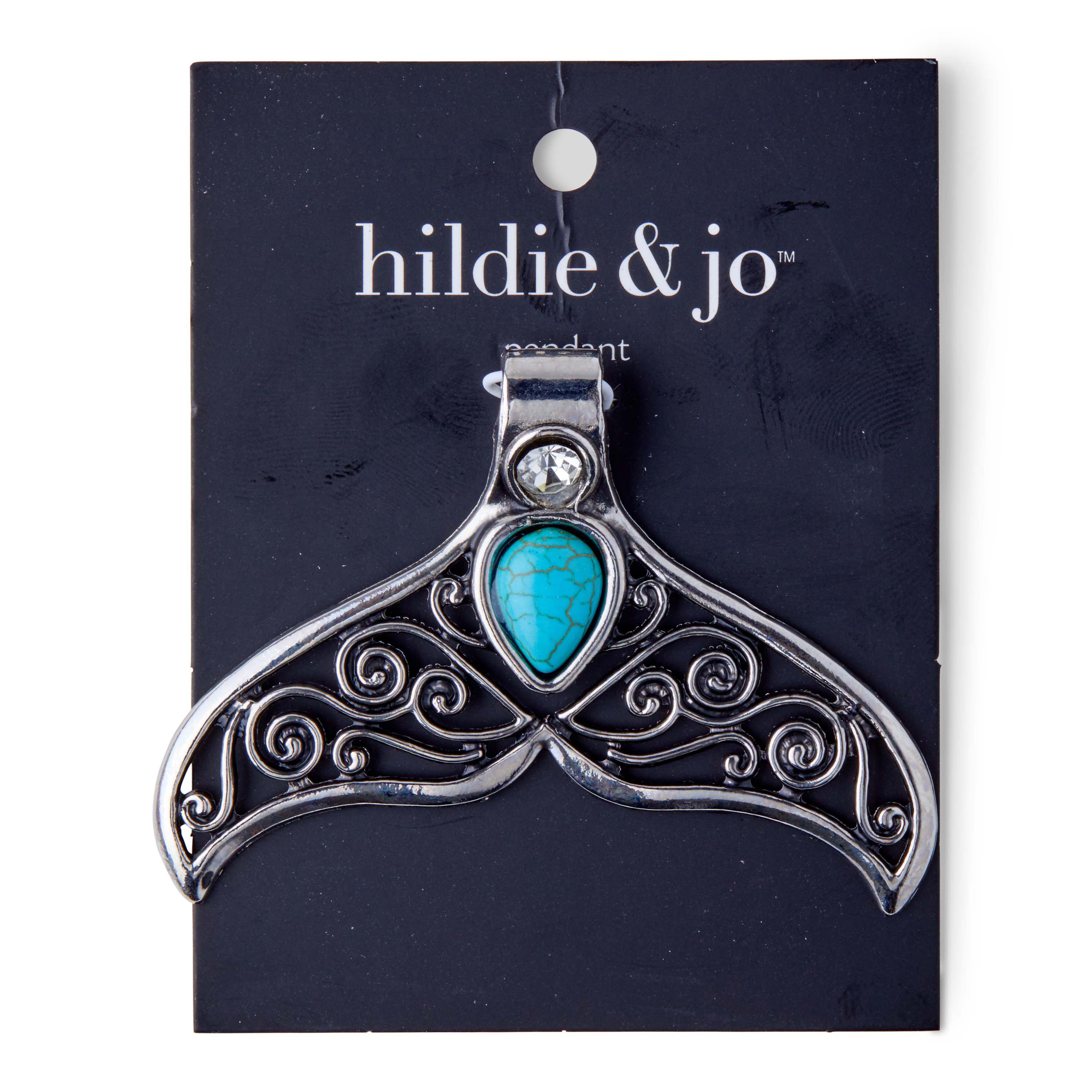 Adorn your necklace with this lovely hildie & jo Fish Tail Silver Pendant-Crystal & Turquoise Stone. The pendant is in the shape of a fishtail. With a bail that has a clear crystal at the top, below is a teardrop shape turquoise stone. Its tail is smooth silver with open cutouts on a scroll pattern. Add it to a chain for an eye-catching effect.