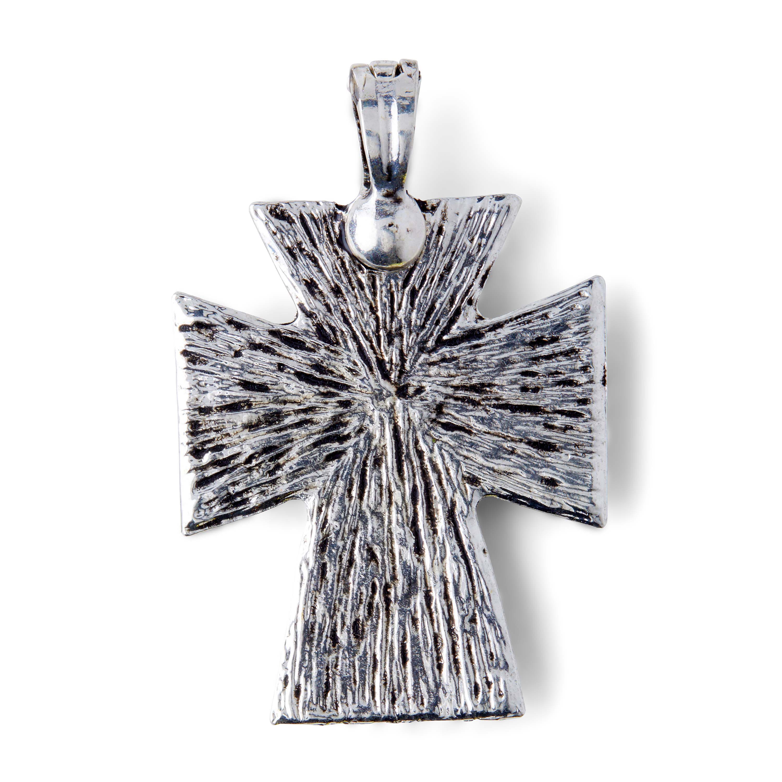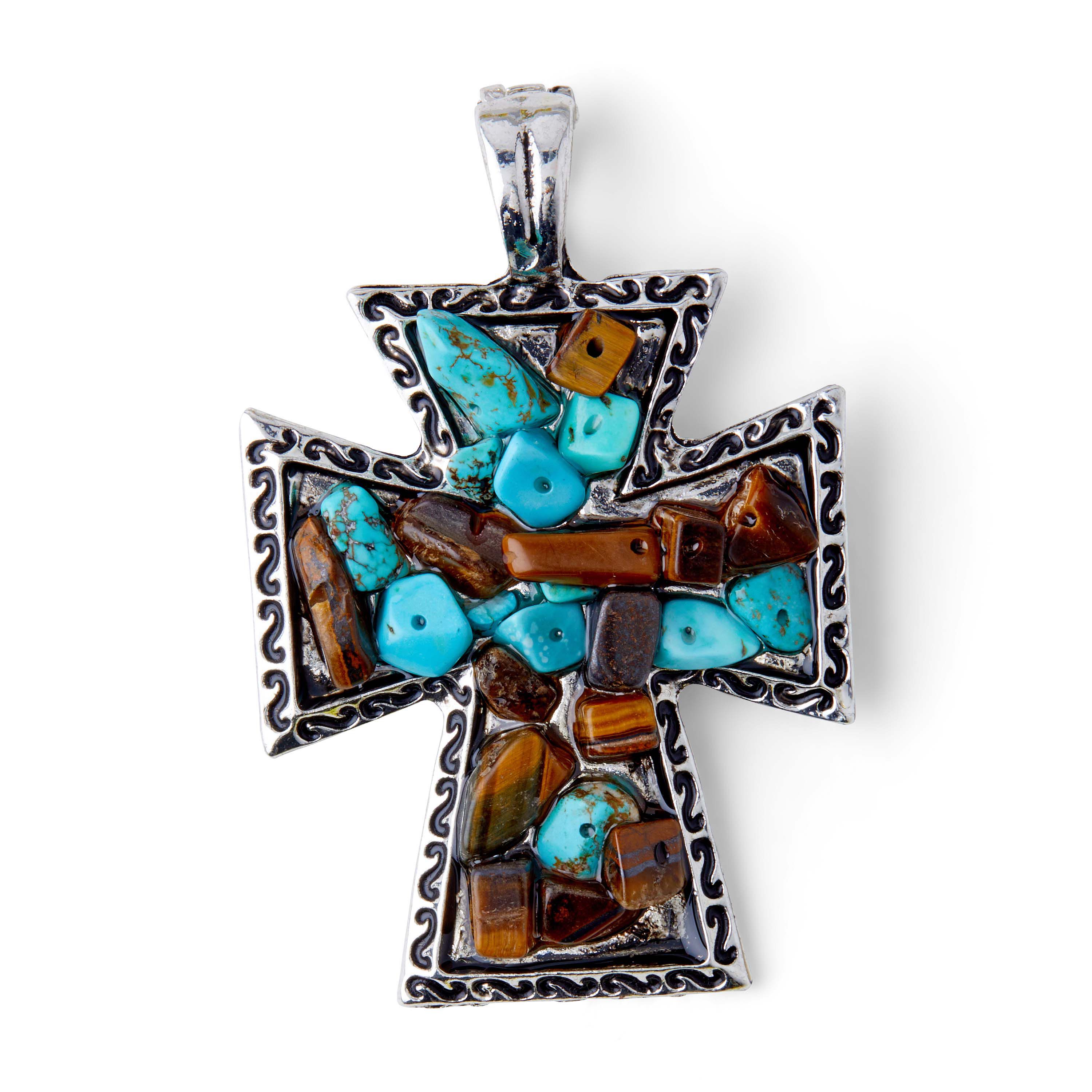 Add a rustic charm to your DIY jewelry projects with the hildie & jo Silver Metal Pendant-Turquoise Stones. This metal pendant features a silver finish, and a mix of turquoise and brown stones in the center. String it on a silver chain and gift it to a loved one.
