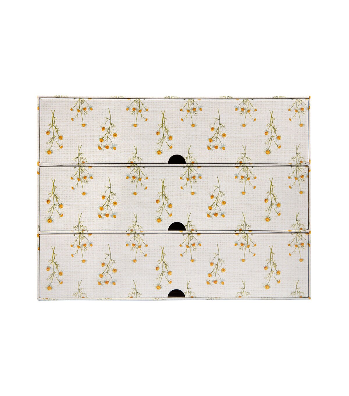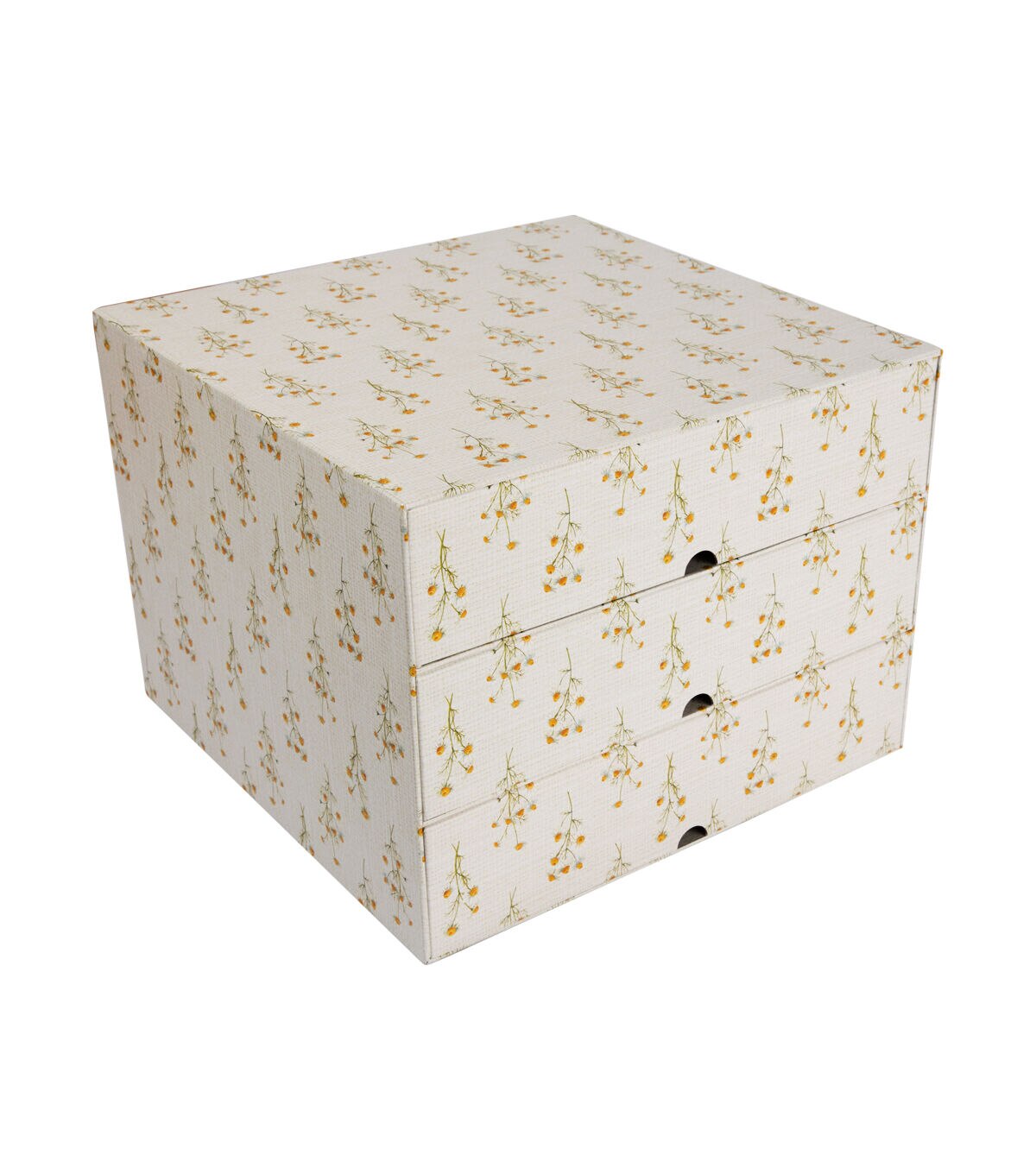 Functional and decorative, the Simple Life Three Drawer Photo Storage Box - Floral will add floral charm to your decor. This storage box flaunts an elegant print of flowers. It comes with three drawers and they are designed with semicircular cutouts to make opening them easy. You can use it to store photos, keepsakes, small ornaments and more.