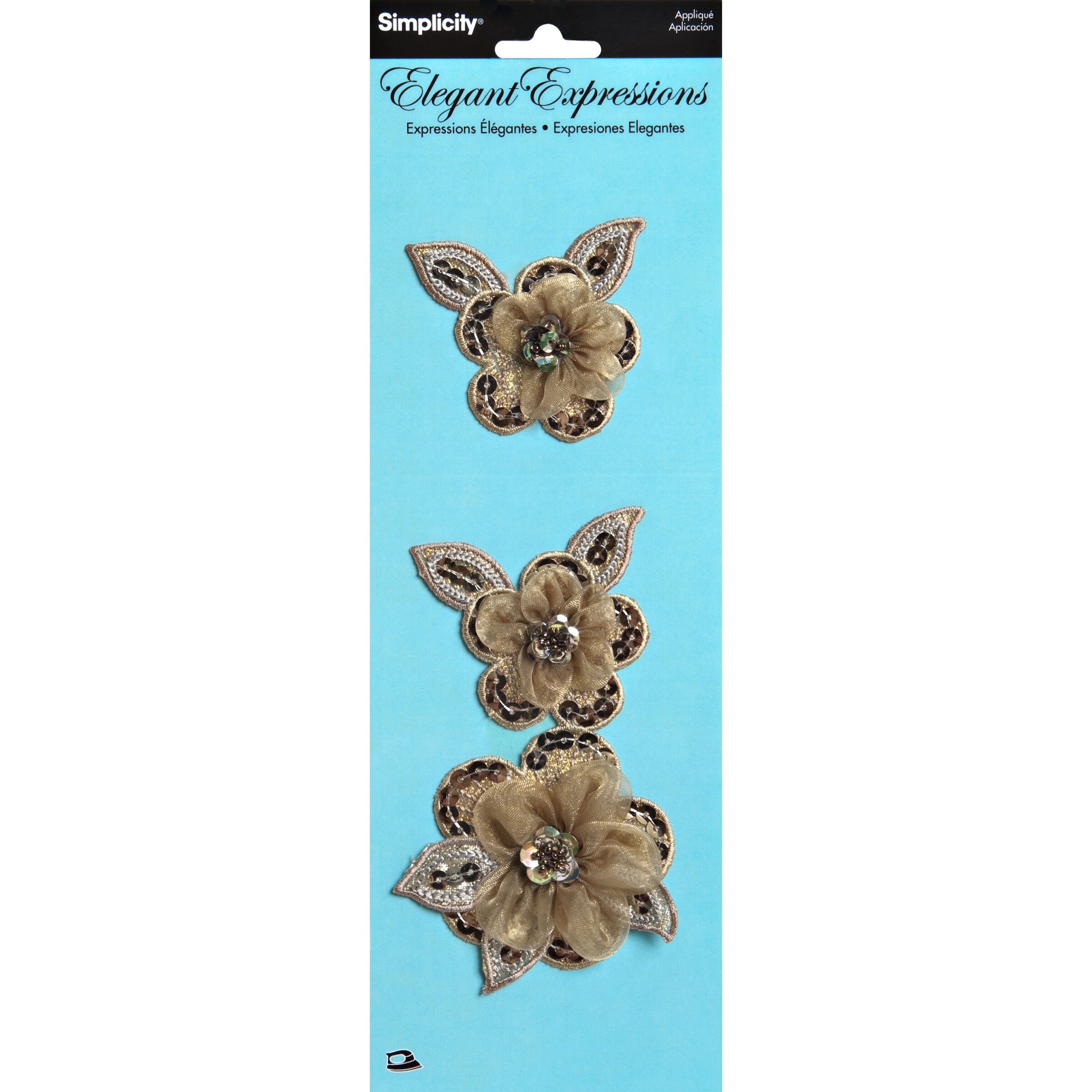 Simplicity Elegant Expressions gold floral appliques feature 3-dimensional organza flowers layered over sequin petals and leaves.