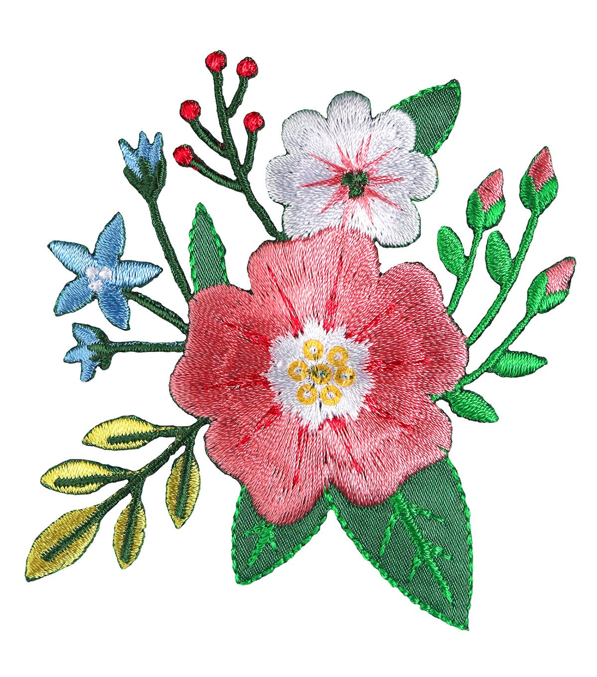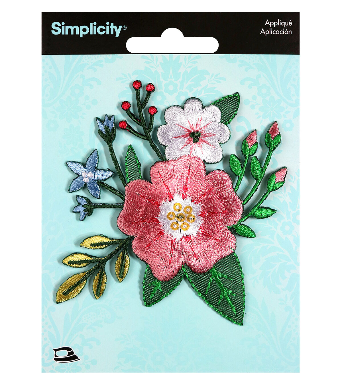 This beautiful stitched, multicolored, embroidered Simplicity Small Thick Stitch Flower Iron-on Applique-Multi flaunts a small bunch of flowers, buds and foliage. It will look great on apparel, totes, bags, pillows, hats and more. When ironing, use cloth to cover the easy iron-on applique. The flow instructions for ironing methods and time are given on the pack.
