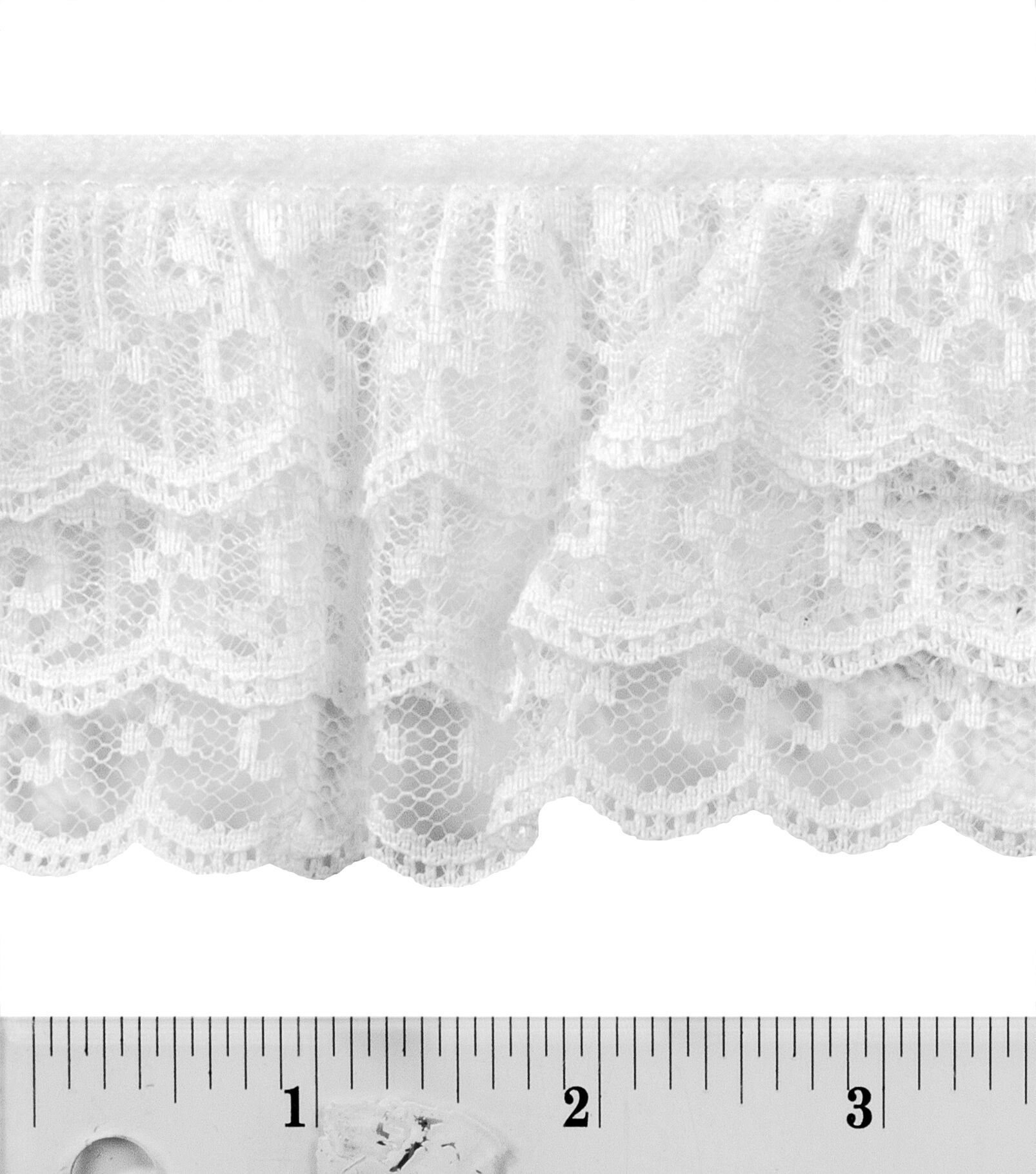 The Simplicity 3-tier Ruffled Lace Trim is designed with three layers of ruffled, scalloped lace. It is perfect for bridal wear, children’s party dresses, petticoats and costumes.