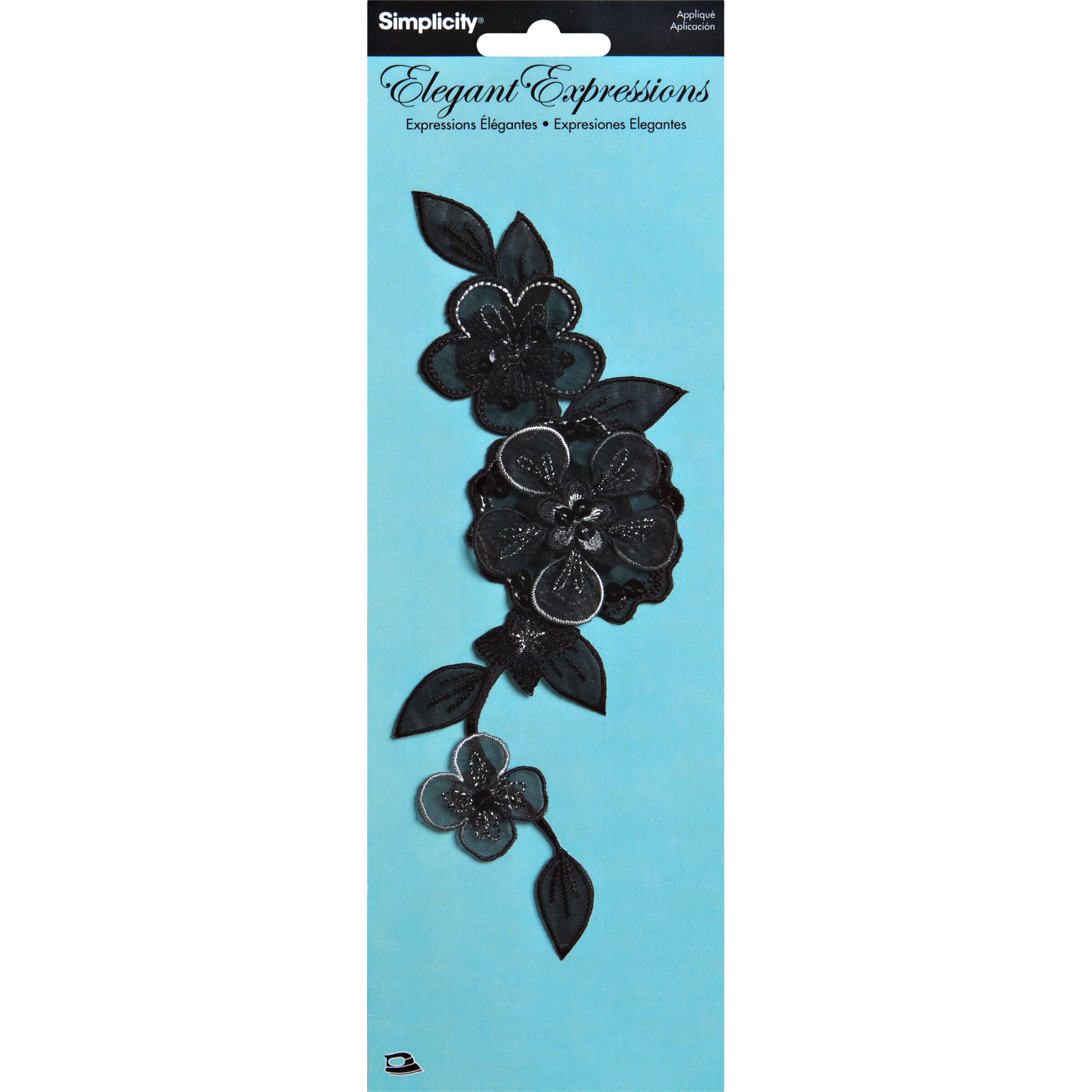 Simplicity Elegant Expressions sheer black iron on flower applique with embroidered & sequin accents adds a sophisticated touch to cardigans, evening wear & accessories.