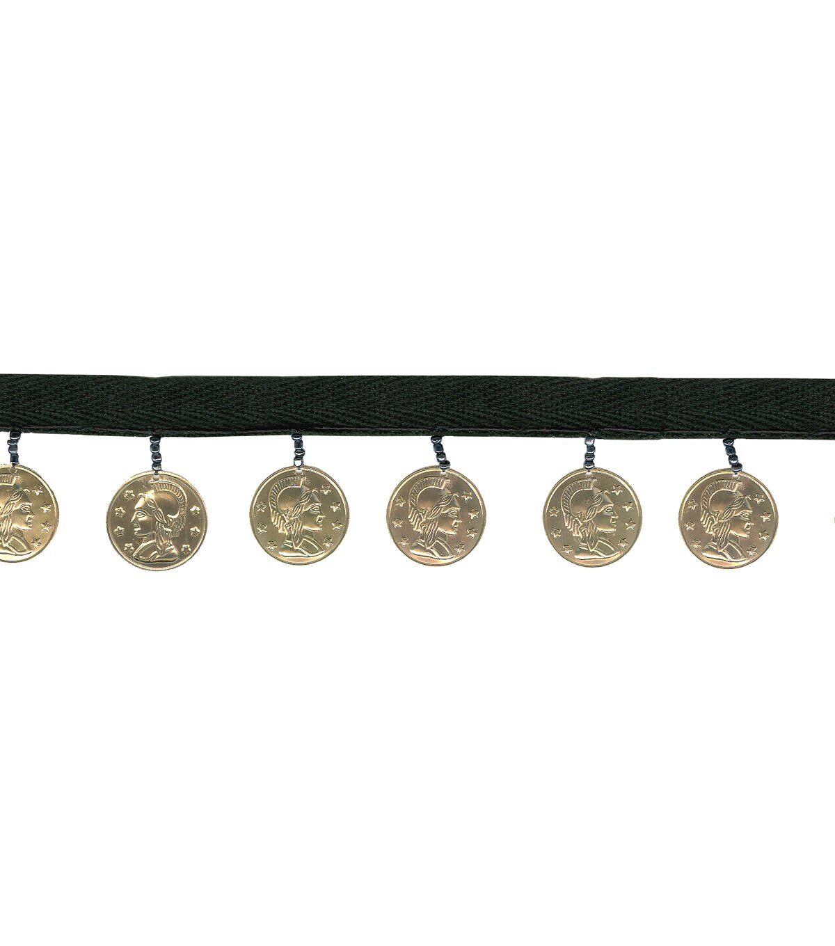 Embellish your dance costumes, party wear and more with the Simplicity Coin Band Apparel Trim-Black & Gold. This lovely twill apparel trim comes as a black band with dangling gold coins along its entire length. Sew or glue the apparel trim onto the fabric surface and enhance your home decor or fashion projects. You can also make funky headbands, bracelets, belts, neck pieces and more with this gorgeous gold coin apparel trim. The pack includes a 4-feet spool of 1.38-inch wide apparel trim.