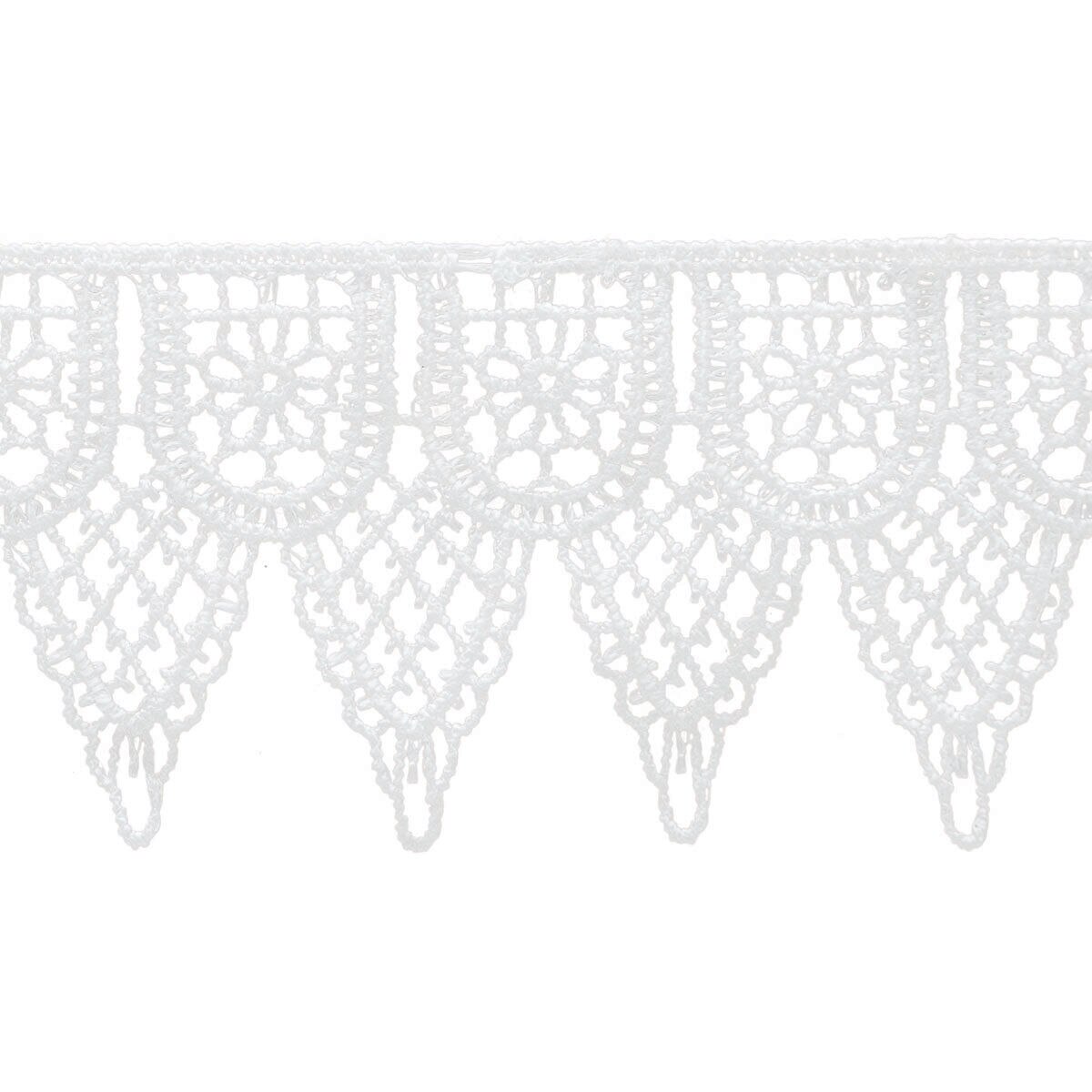 The Simplicity Double Scalloped Venice Trim-White will make a great addition to your sewing accessories and can be used for a variety of DIY fabric projects. You can use it to add elegance to dresses, cushion covers, tablecloths, curtains and more. This pack contains 10 yards of polyester trim.