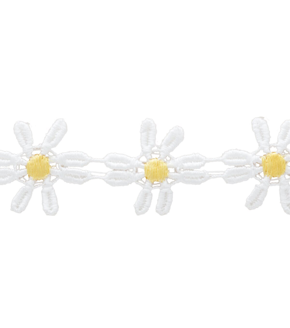 Add a stylish touch to your apparel collection with the Simplicity Venice Daisy Apparel Trim-White & Yellow. Stitch this decorative apparel trim on the edges of skirts, scarves, belts, dresses, table covers, napkins and more to add a charming floral touch. The package includes a 4-foot spool of apparel trim featuring a pretty design. This bright and attractive trim can be a great addition to your craft kit. Select from a range of color combinations that are available, each sold separately.