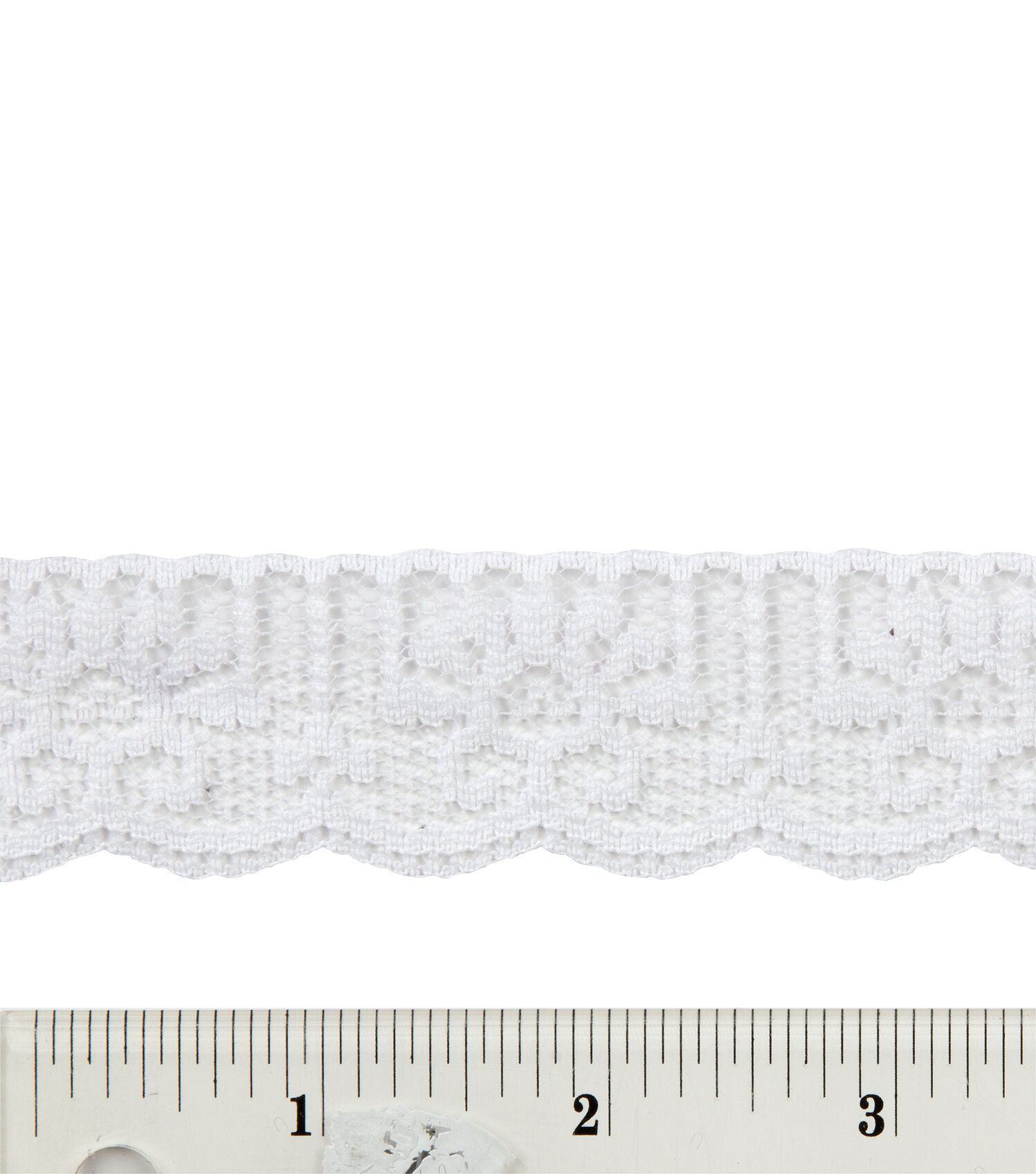 The Simplicity Vertical Lace Trim is designed with a geometric scalloped motif. It is great for embellishing apparel, bridal accessories, sleepwear and costumes.