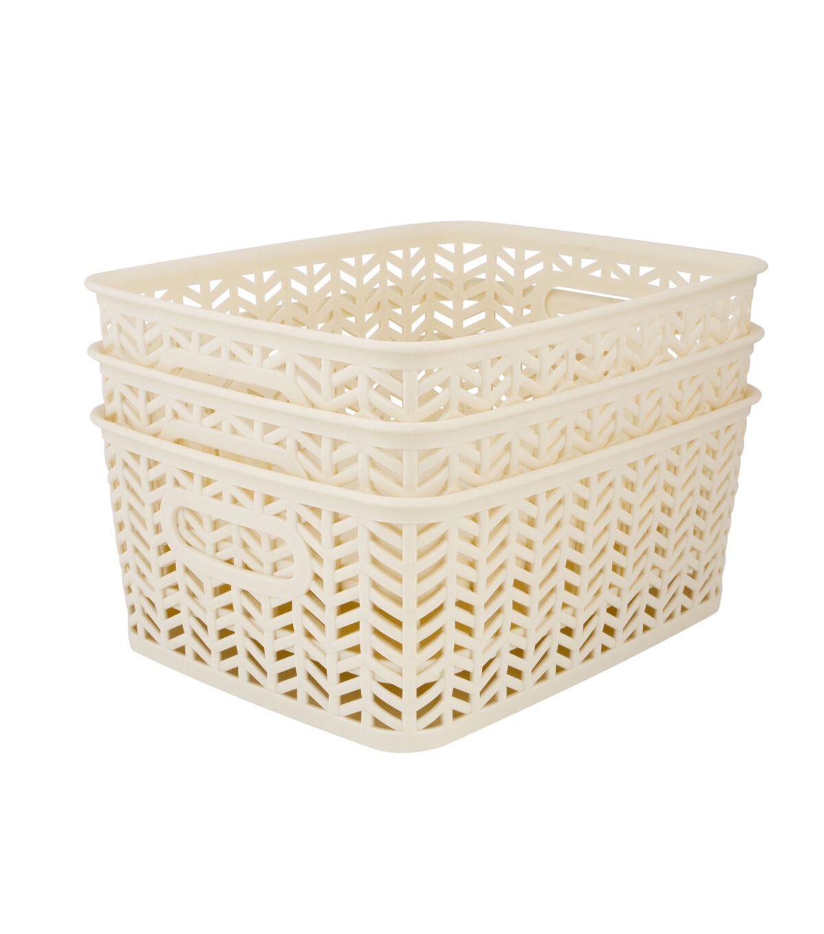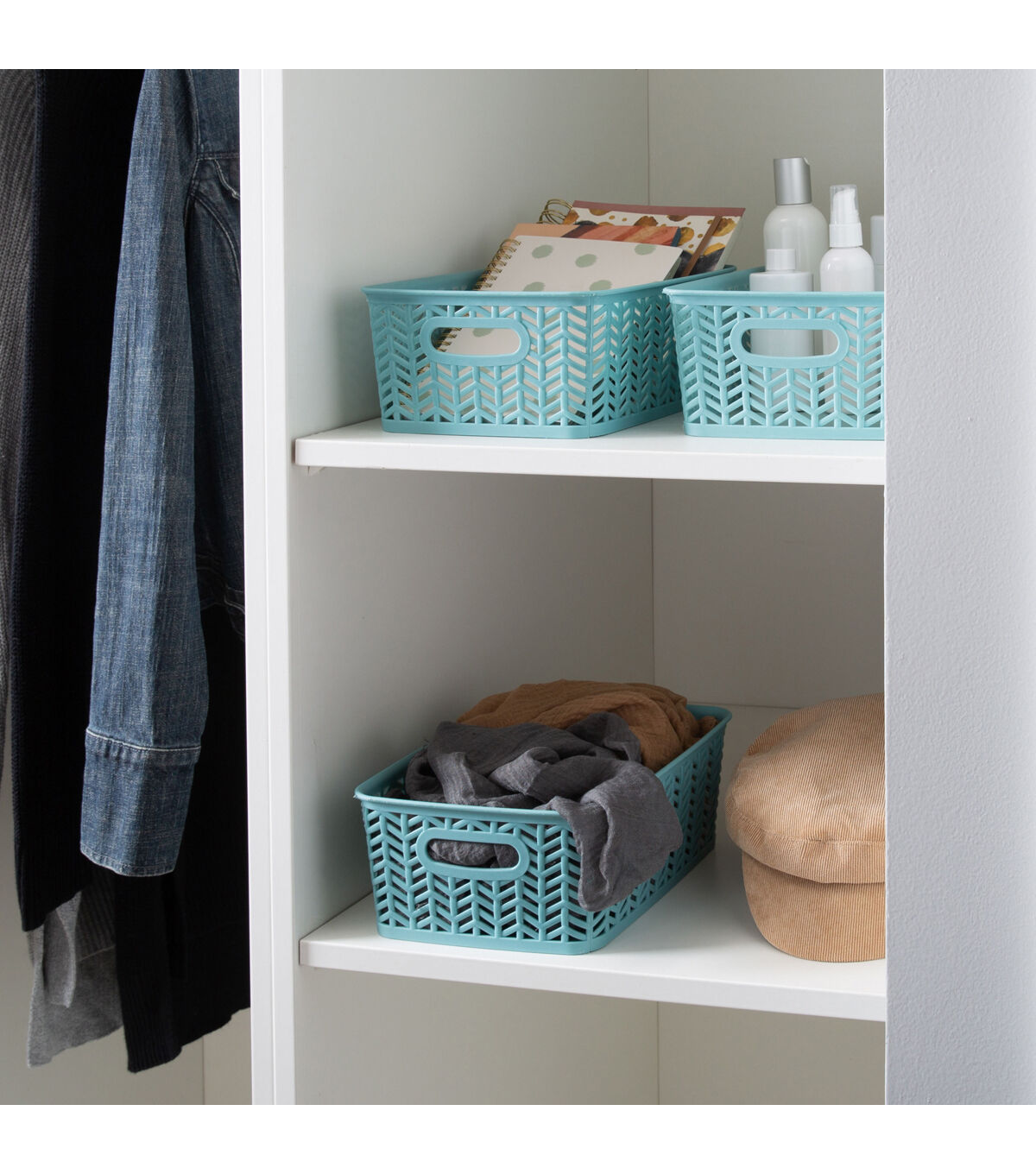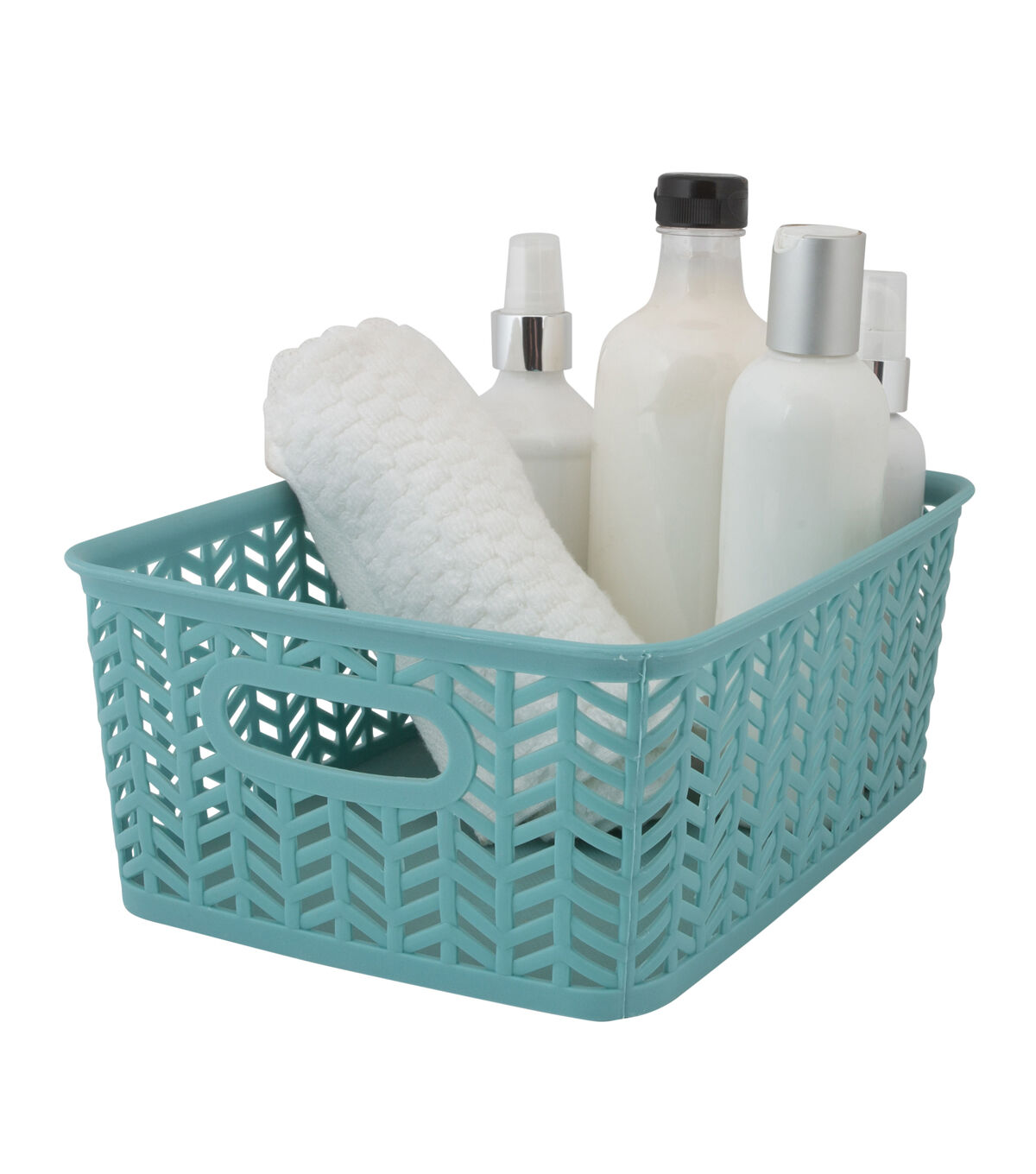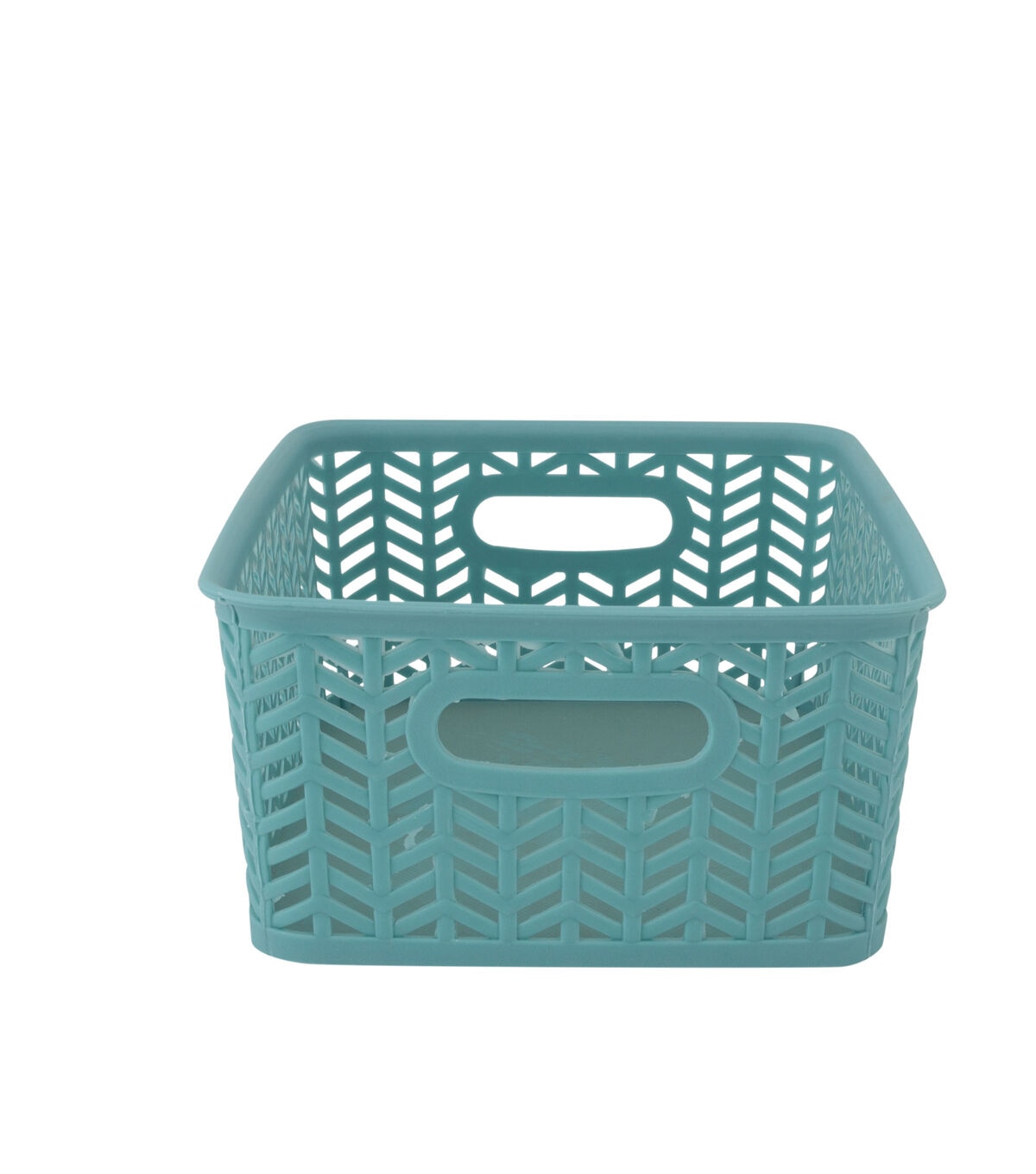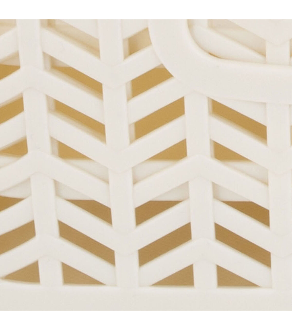Simplify's Herringbone Storage Bin has a unique wicker design and is made of sturdy polypropylene plastic. 2 sturdy open handles makes it easy to carry Bin around from one place to another. It has a lightweight design and holds a multitude of items, organizing and de-cluttering homes. Wide selection of colors to fit any setting.