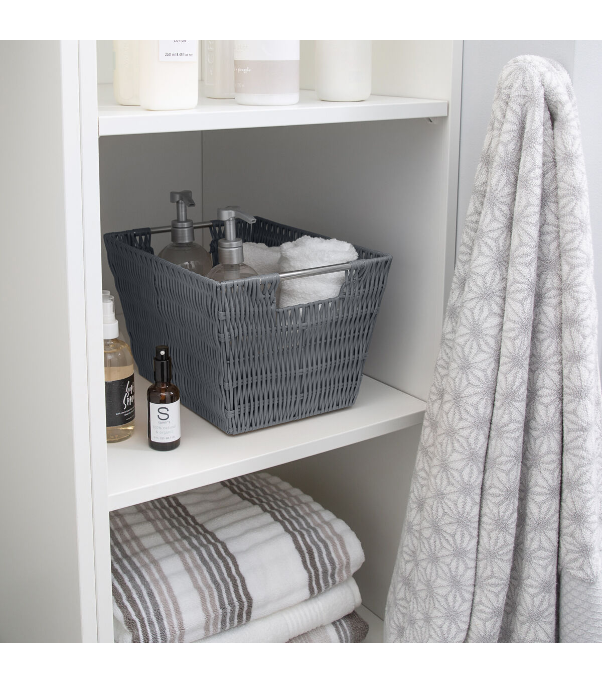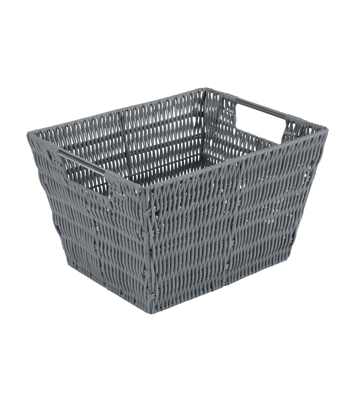 Organize and create storage in your home with the Simplify Rattan Tote Basket Collection. Simplify's Rattan Tote is a PE Basket with an iron frame and 2 sturdy stainless steel carry handles. It is strong and durable prolonging it's life, and it's lightweight design makes it easy to lift and carry. Fits any home decor with it's wide selection of colors. Store your household belongings and organize space with these stylish baskets. Stack them together in a corner of your craft area, home office or Dorm to keep your essentials close at hand in an organized manner.
