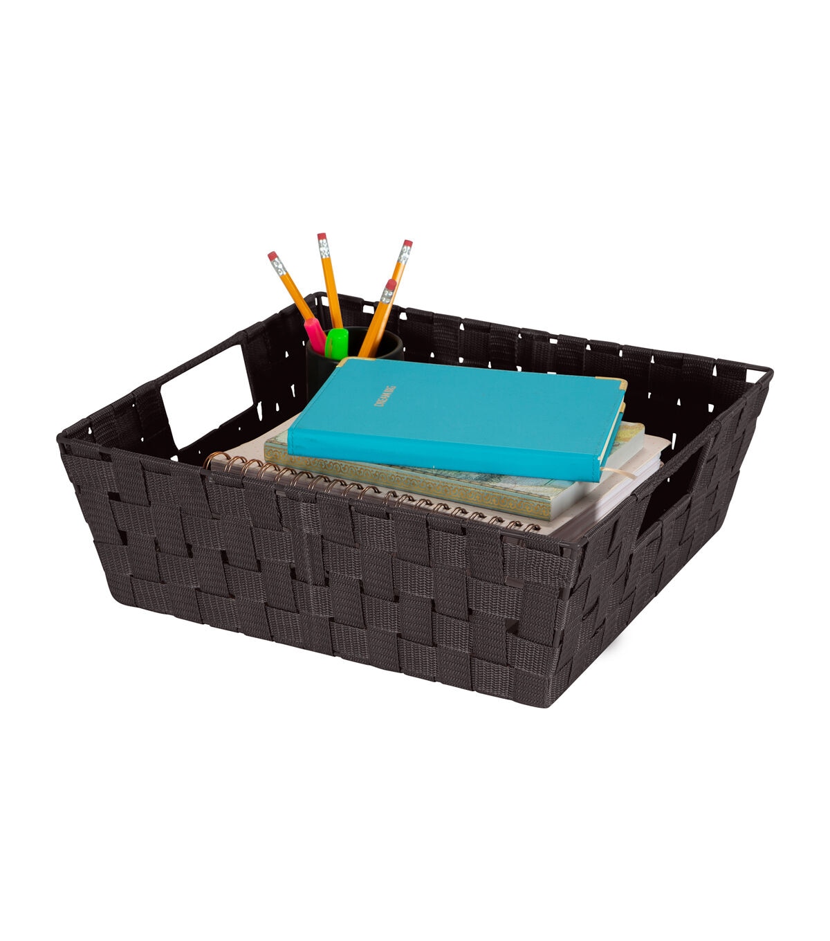 "This Simplify Woven Storage Bin is made of sturdy polypropylene with epoxy wire frame dual handles for easy carrying. Acts as a great storage accessory for all your home needs. Maintenance free."