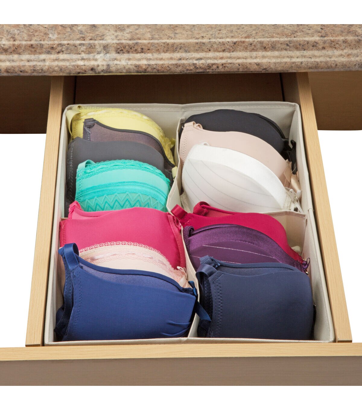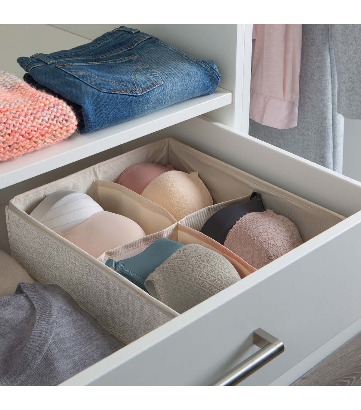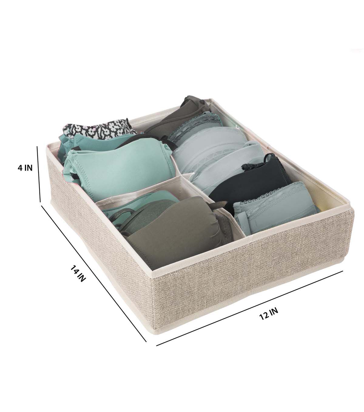 Get your drawers organized with the Simplify 4 compartment drawer organizer. Easily fitting in most standard size drawers, you can keep your smaller garments in order. Great for socks, lingerie, hosiery and accessories. Made of breathable non woven material and open top allows easy access to garments. No more cluttered drawers, simply organize.