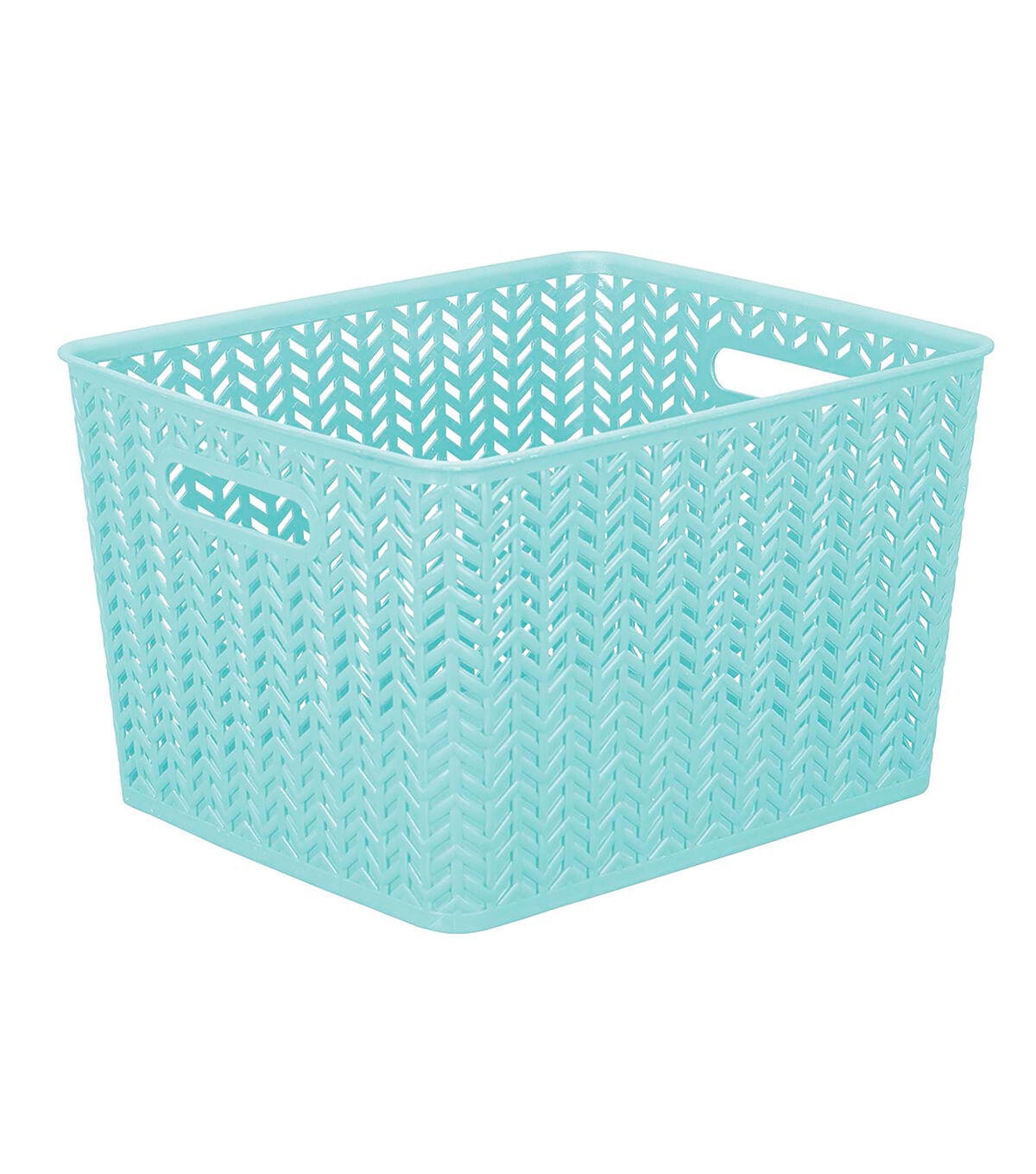 Simplify's Herringbone Storage Bin has a unique wicker design and is made of sturdy polypropylene plastic. 2 sturdy open handles makes it easy to carry Bin around from one place to another. It has a lightweight design and holds a multitude of items, organizing and de-cluttering homes. Wide selection of colors to fit any setting.