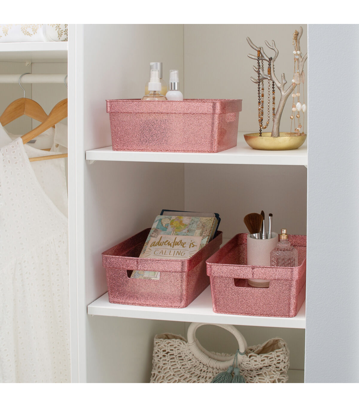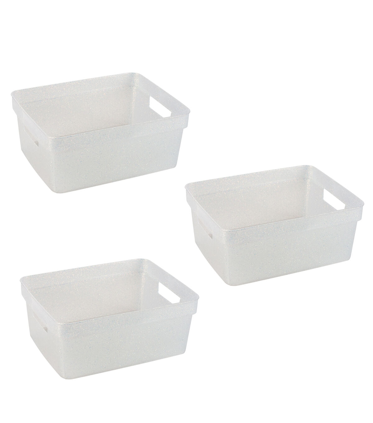 Organize and create storage in your home with the Simplify 3 Pack Small Glitter Totes. They are strong and durable, and the lightweight design makes it easy to lift and carry. The size makes these a great addition to a countertop, shelf, closet or in a deep draw. They are perfect for storing toys, office supplies, cleaning supplies, accessories and so much more! Your space with look neat and organized with the set of matching totes.