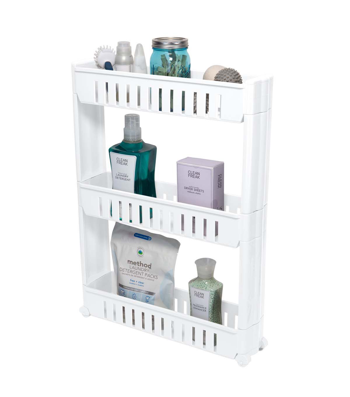 Maximize your storage space even in the smallest spaces with the Simplify 3 tier slide out cart. The slim design allows this cart to fit between your washer and dryer, appliances, side of cabinets and other small spaces. Designed with 3 tiers of shelving you can store your detergent, cleaning products, bathroom accessories, kitchen accessories and lots more. Ideal for kitchens, bathrooms and laundry rooms the cart conveniently slides in and out of where stored on its 4 wheels.