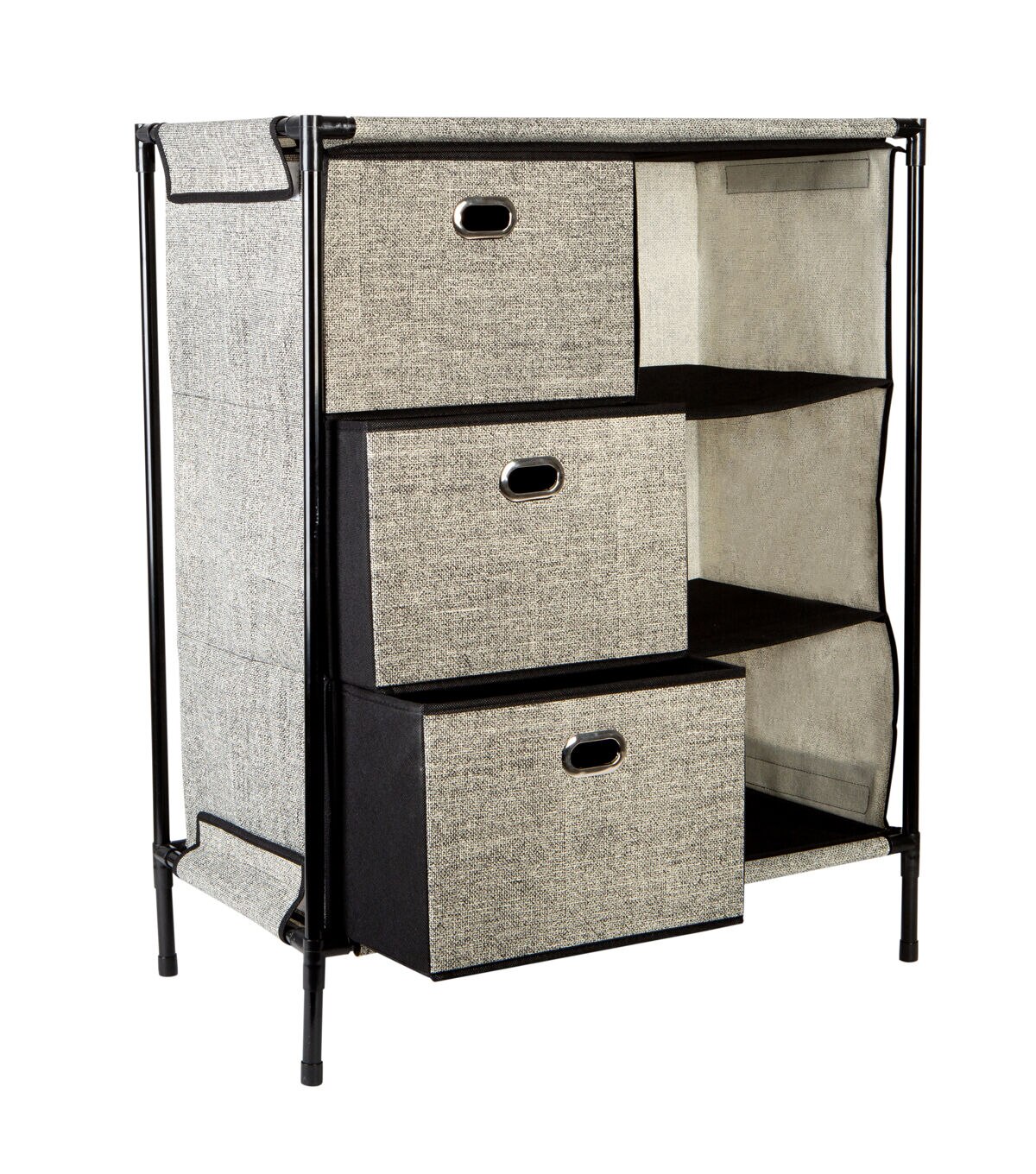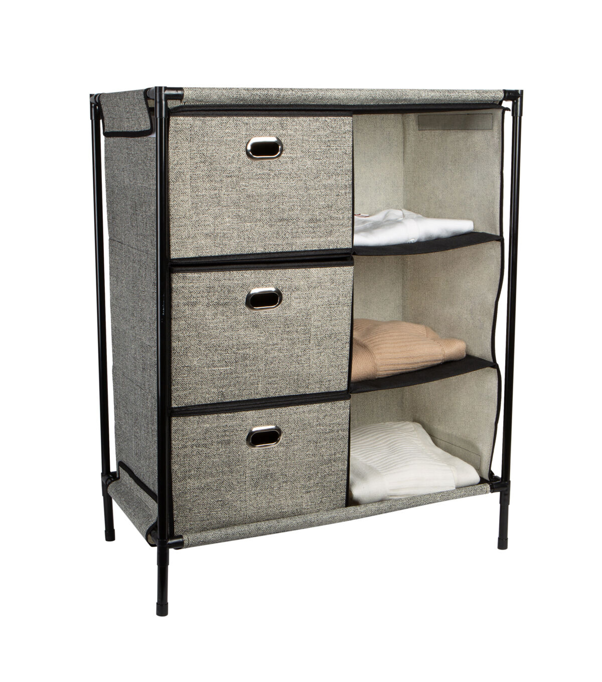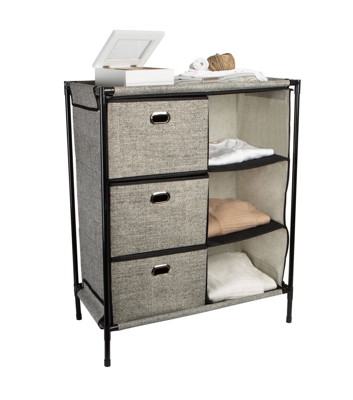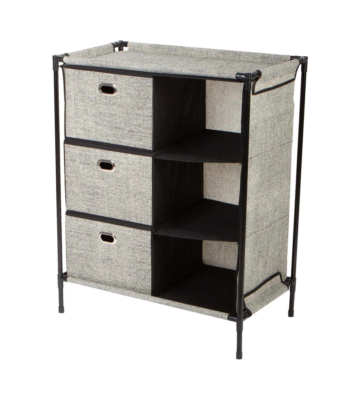 Add extra draw space anywhere with the Simplify Storage Chest. Designed with 3 non-woven drawers and 3 open design shelves. This is the perfect addition to any room in the house. A durable steel frame allows this item to be sturdy when in use and gives it a stackable design.