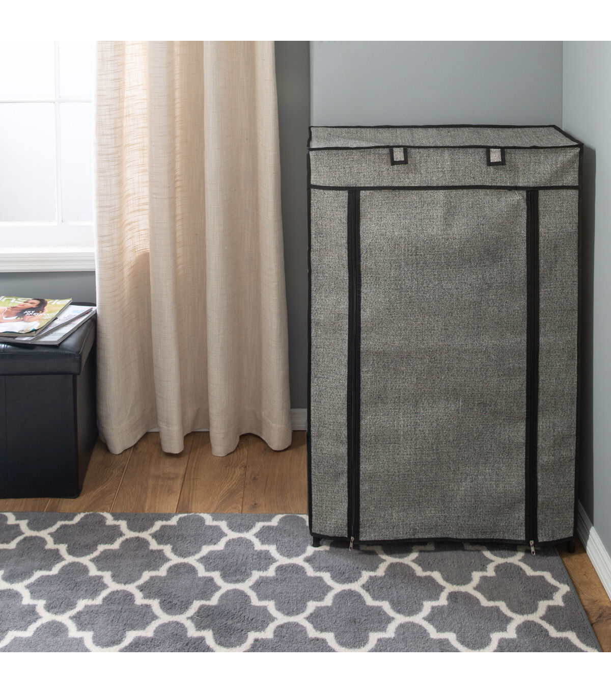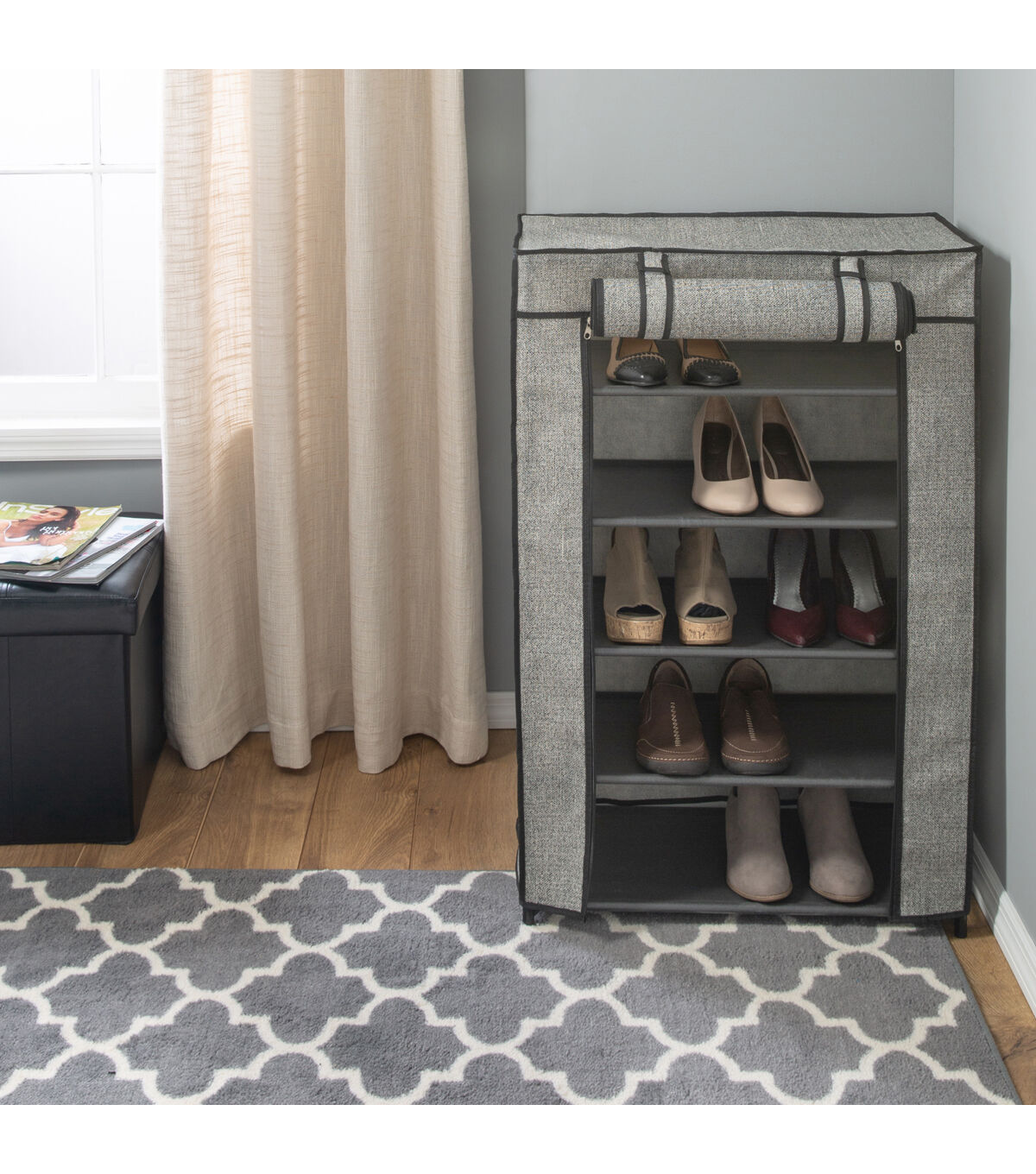 Out of room in your closet? Organize all those fabulous shoes in the Simplify 5 tier shoe organizer. Designed to hold up to 15 pairs of shoes and comes complete with a non woven breathable roll-up cover. Made of a sturdy metal frame and durable shelves this shoe organizer can hold any type of shoe such as sneakers, heels flats or boots. The free standing shoe rack can go in your closet or in any room or hallway. Your home just got neater with the use of this 8 tier shoe rack!