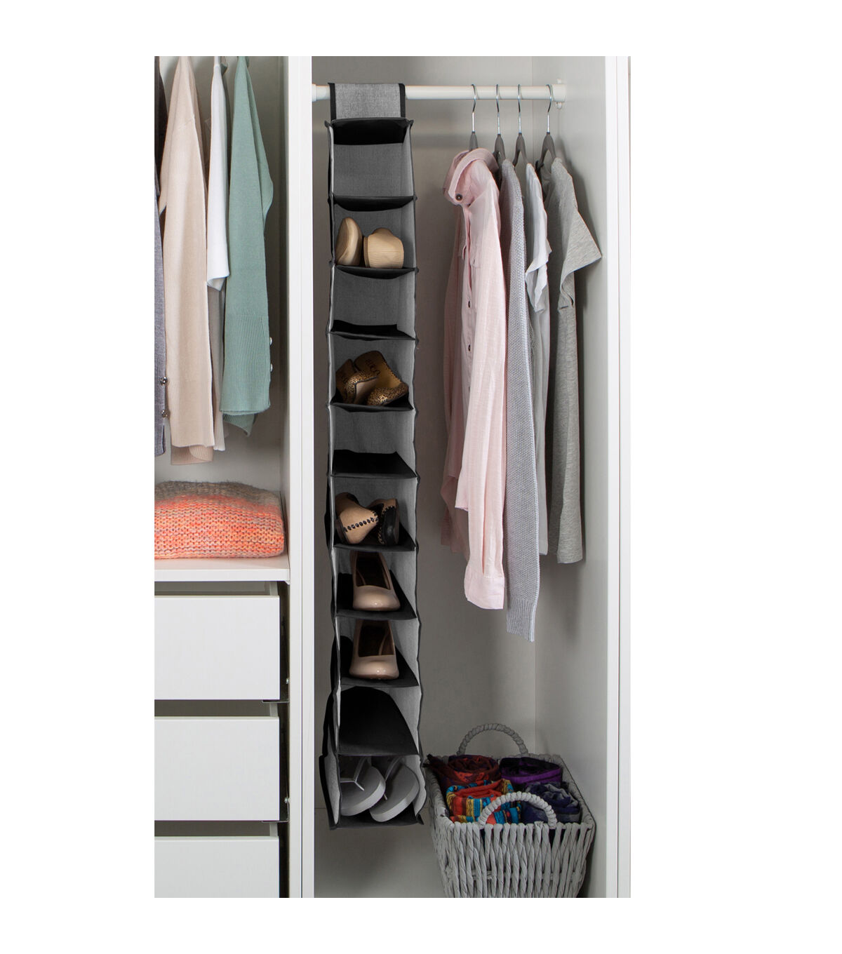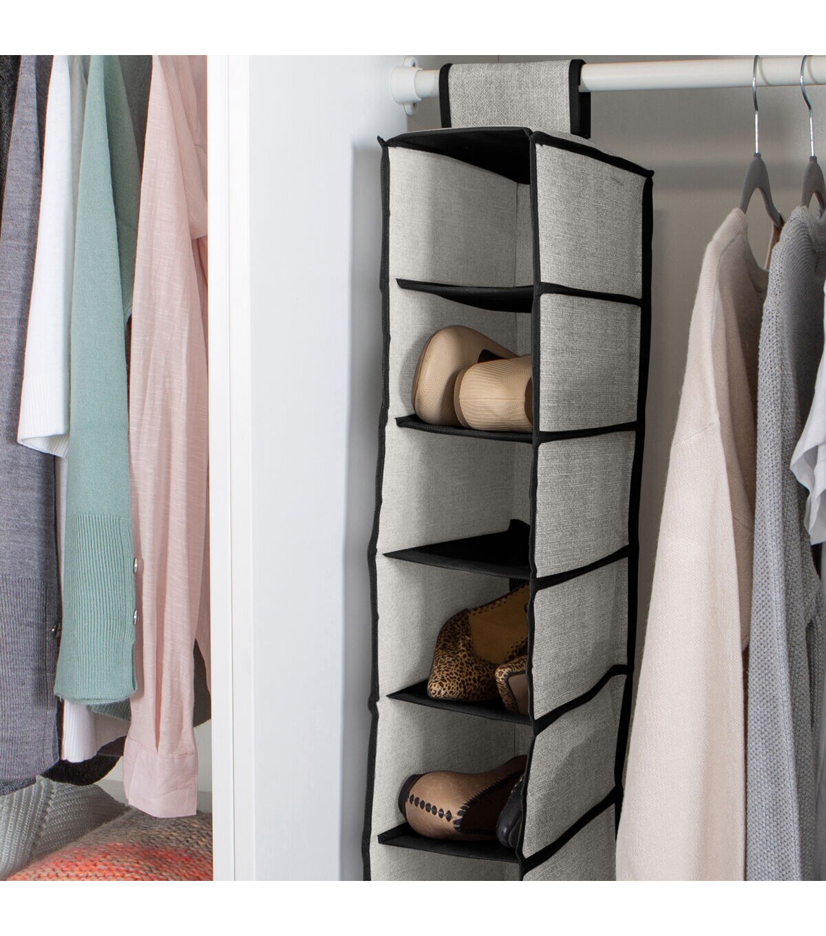 Simplify's 10 Shelf Non-woven Organizer is made of 100% Polypropylene Nonwoven breathable Material that acts as instant organization for your closet or room. Contains 10 cardboard lined shelves to prevent bowing and to allow easy access to all of your shoes and accessories. Sturdy, durable fabric and cardboard liner helps maintain shape of the closet organizer. Easy installation hangs into any closet rods with it's strong Velcro closure, and when not in use, simply fold it up and put in storage, saving space.