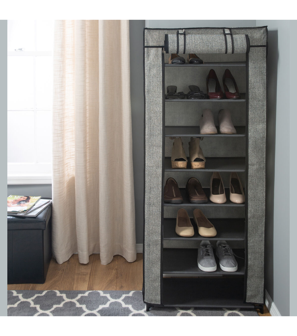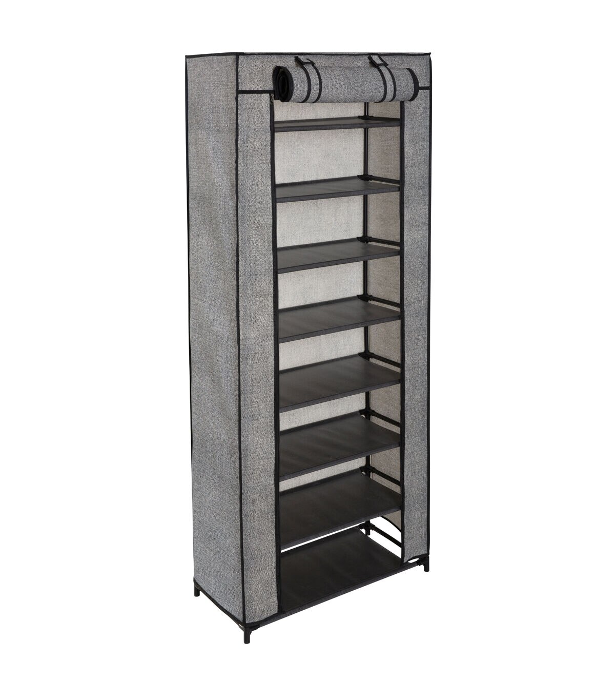 Out of room in your closet? Organize all those fabulous shoes in the Simplify 8 tier shoe organizer. Designed to hold up to 24 pairs of shoes and comes complete with a non woven breathable roll-up cover. Made of a sturdy metal frame and durable shelves this shoe organizer can hold any type of shoe such as sneakers, heels flats or boots. The free standing shoe rack can go in your closet or in any room or hallway. Your home just got neater with the use of this 8 tier shoe rack!