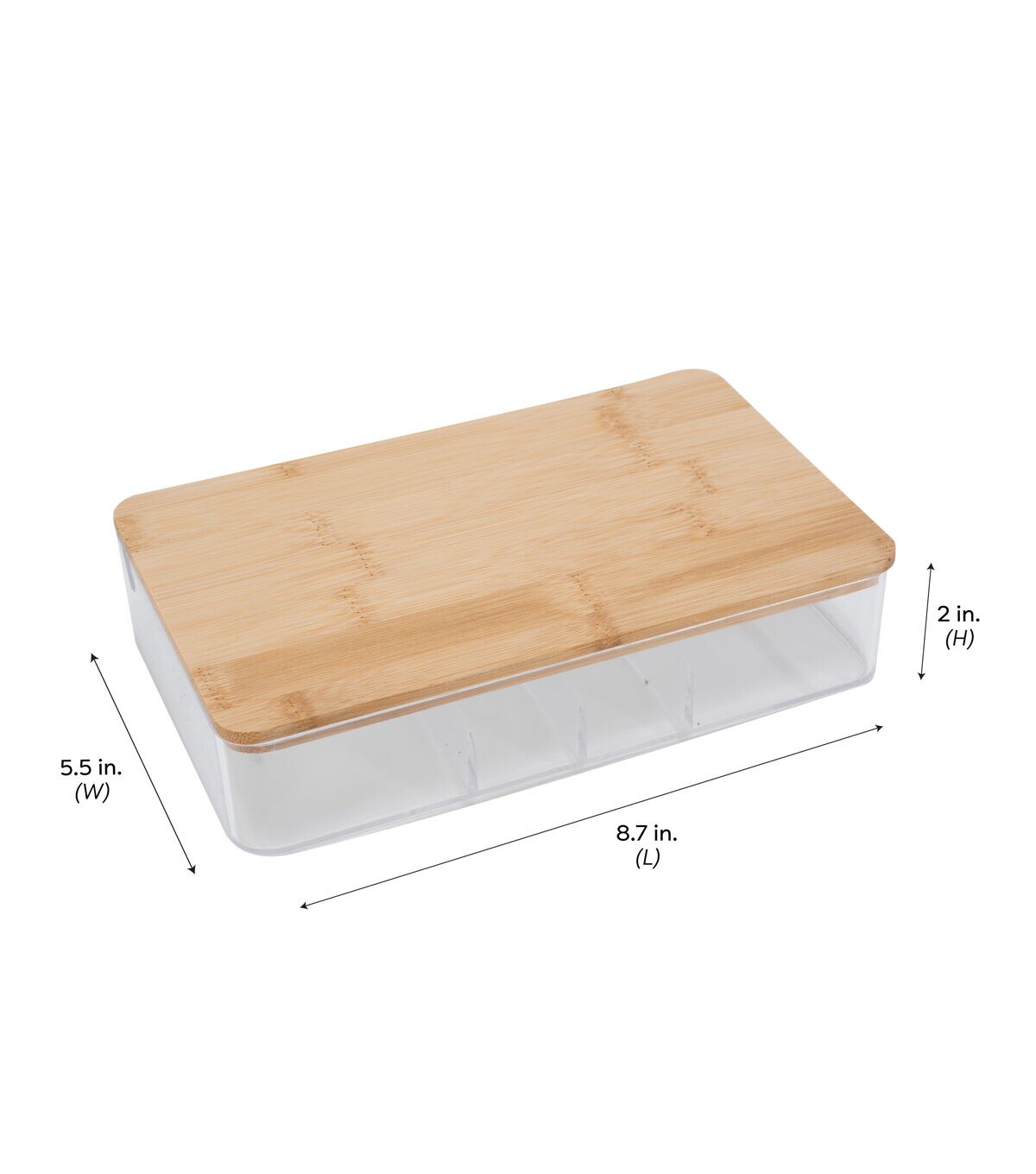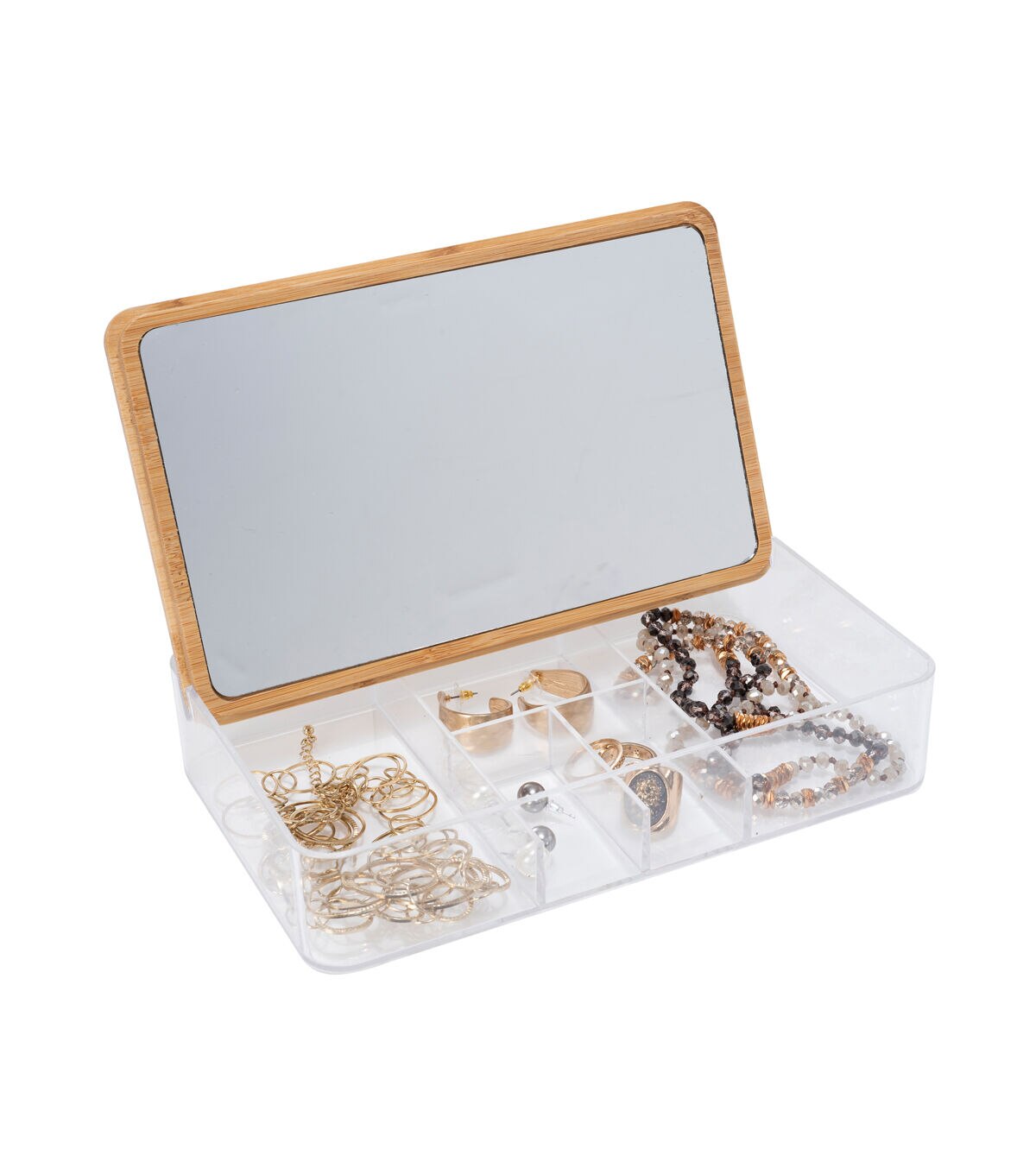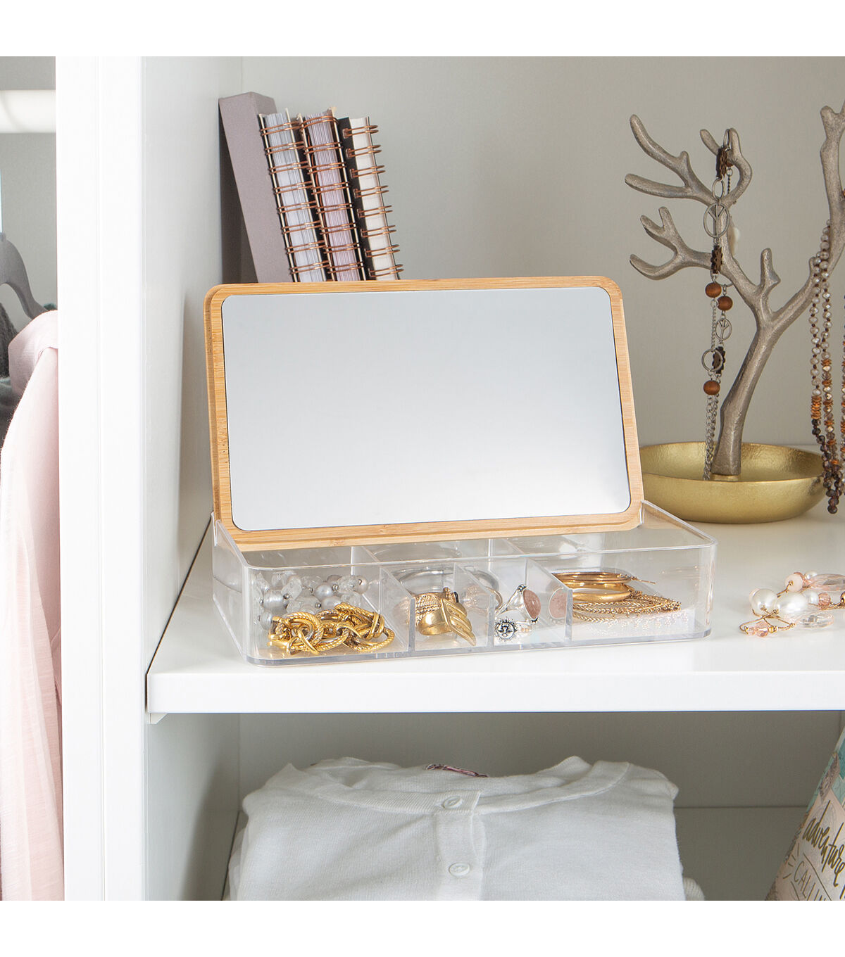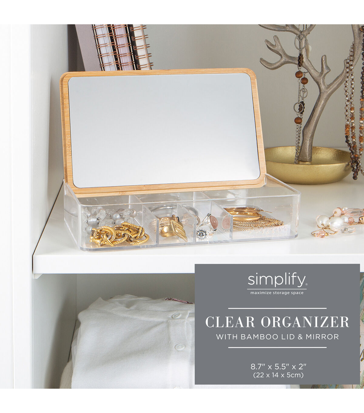 Organize your jewelry and accessories with the Simplify clear organizer with bamboo lid. A perfectly designed box that contains 5 separate compartments that helps keep items separated and organized and prevents jewelry from being tangled. A fashionable bamboo lid that has a nice size mirror on the opposite side that can be propped on top of the box to create a vanity. The clear box allows you to easily see what is stored inside without having to open. The stylish organizer makes this a great addition for your dresser, vanity or desk.