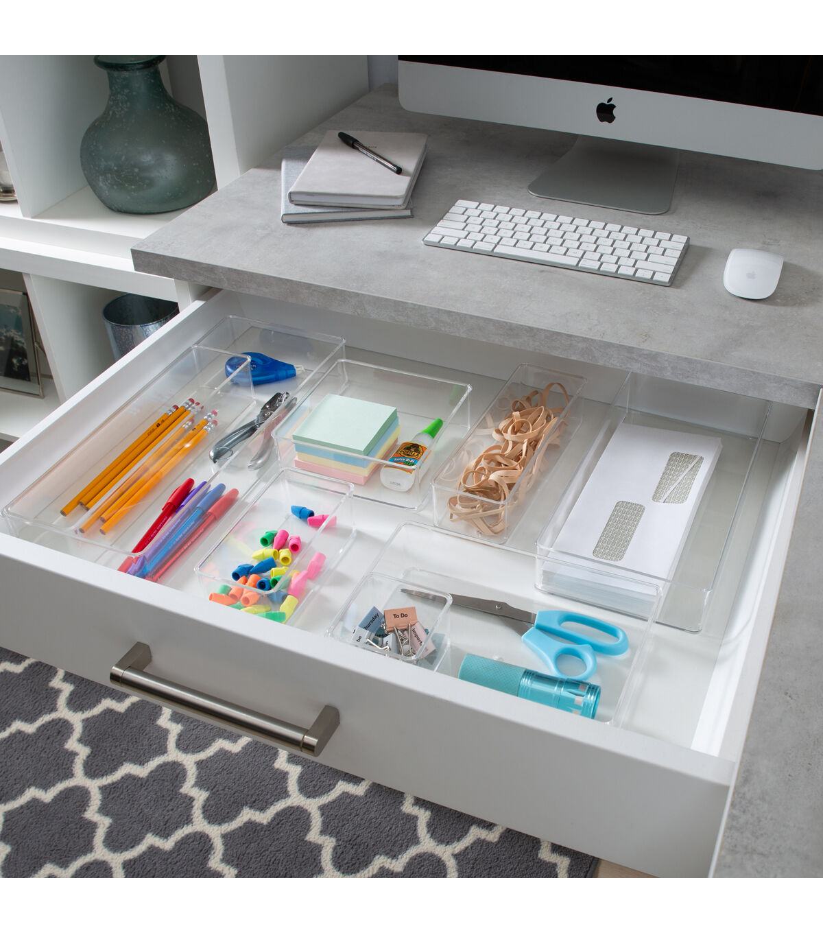 Organize your bathroom vanity or desk drawer with this Simplify Medium Narrow Drawer Organizer. It is the perfect size for desk accessories such as pens, pencils, and markers. It is also good for holding jewelry and cosmetics and brushes. The clear design makes items inside visible and easy to find. You can keep this transparent organizer bin on your desktop or countertop surface because it fits with any room’s décor. Organize the little things in life with the Simplify Drawer Organizer.