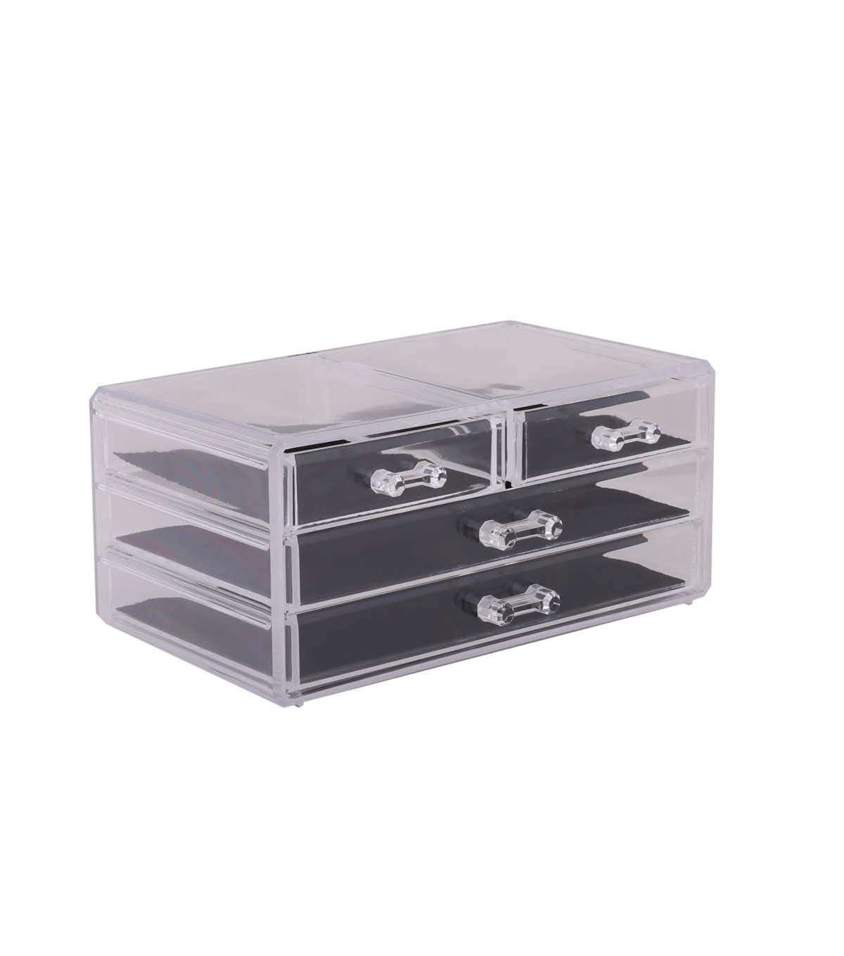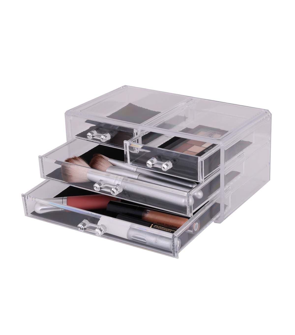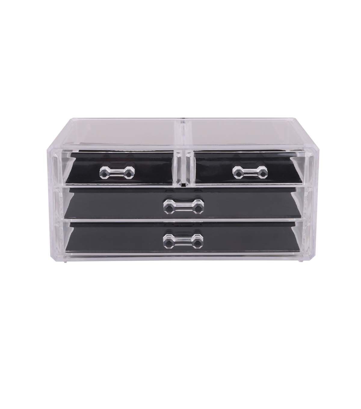 Looking for a way to keep your cosmetics and jewelry organized and within reach? Simplify's 3 Tier 4 Drawer Cosmetic and Jewelry Chest is the perfect solution. Whether you're getting ready for work or a night out, this compact organizer will keep your beauty essentials at your fingertips. The clear/see-through design adds a touch of elegance to your vanity or dresser space.