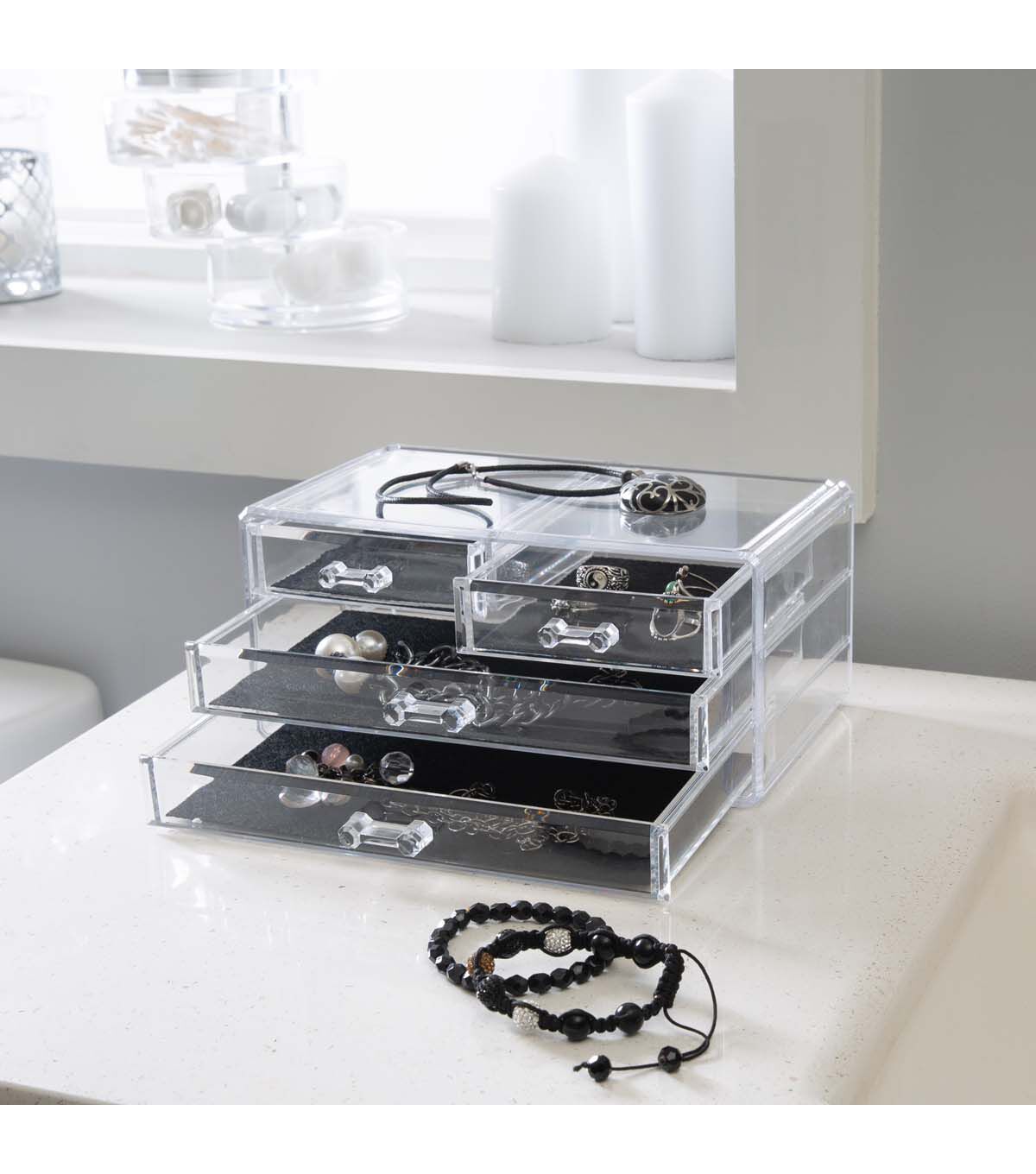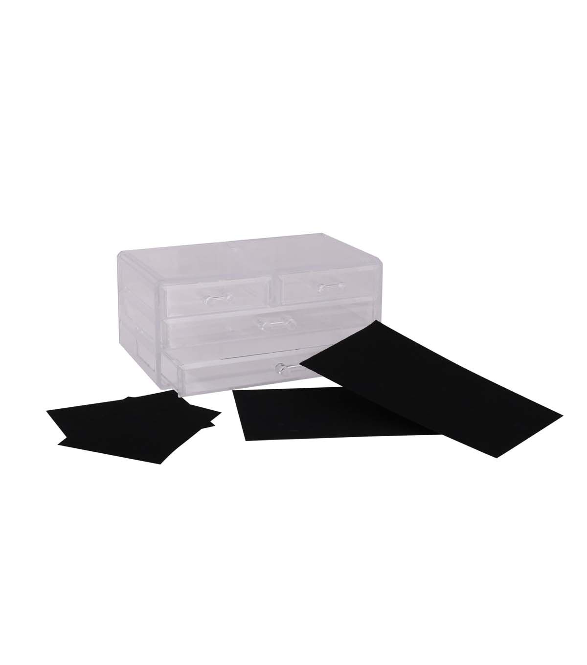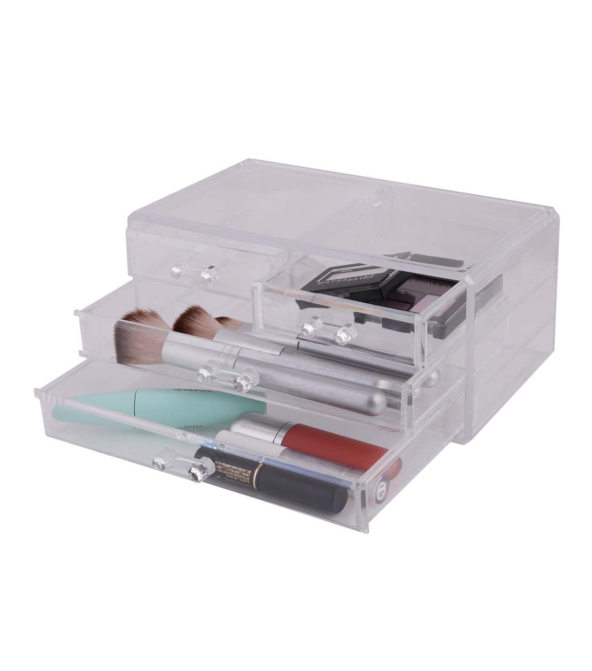 Looking for a way to keep your cosmetics and jewelry organized and within reach? Simplify's 3 Tier 4 Drawer Cosmetic and Jewelry Chest is the perfect solution. Whether you're getting ready for work or a night out, this compact organizer will keep your beauty essentials at your fingertips. The clear/see-through design adds a touch of elegance to your vanity or dresser space.