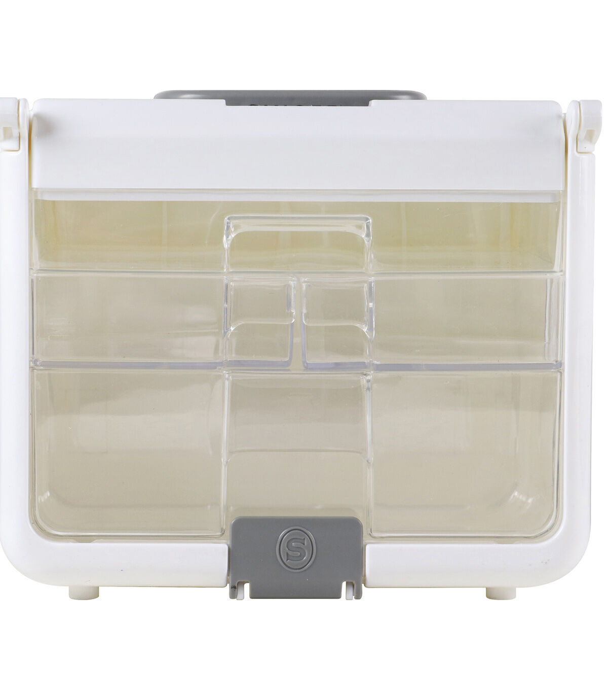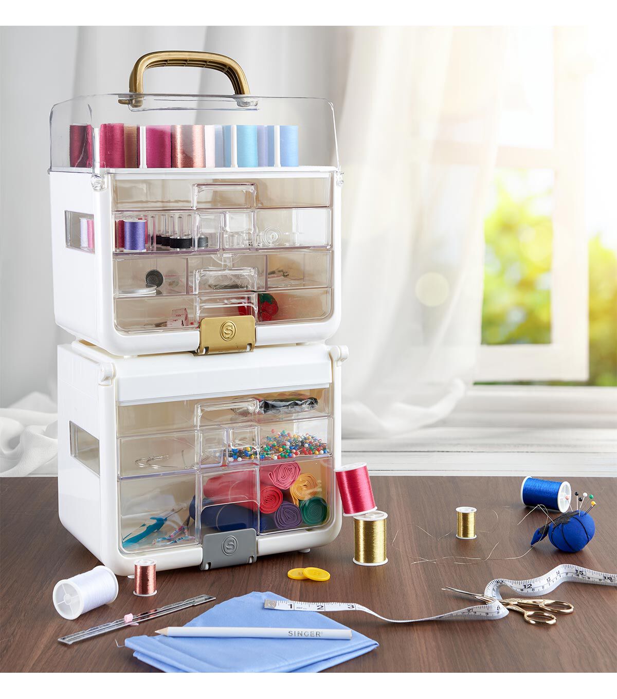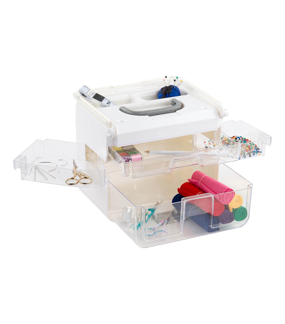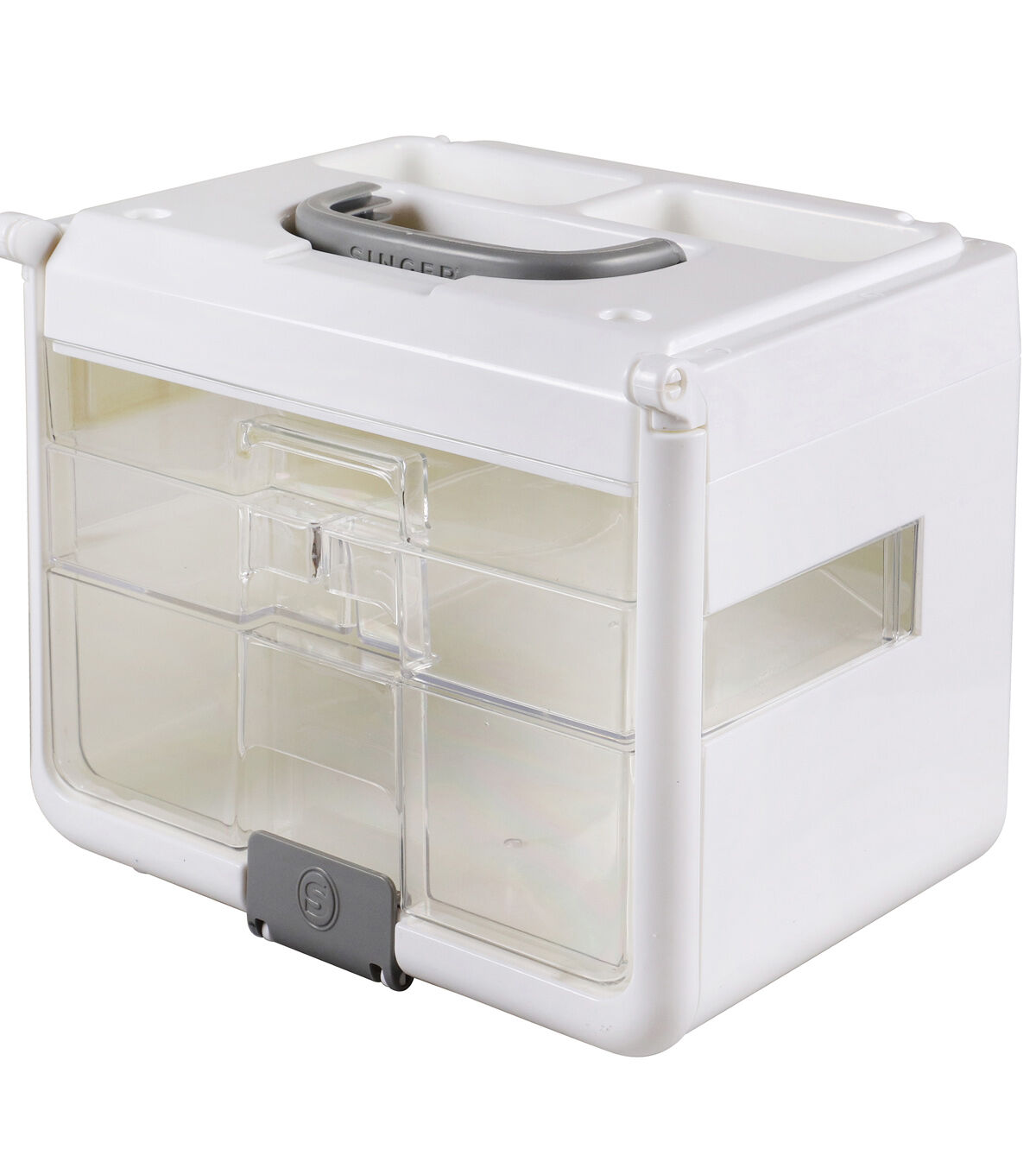 Store and organize your sewing and crafting essentials in the Singer Sew-It-Goes Stackable Storage Case. This high-quality stackable storage case is made of durable, translucent plastic and secured with a snap-lock latch to keep all your contents secure. It is compatible with the Sew-It-Goes sewing kit. With an easy-open, collapsible handle, the sewing supplies organizer can be used on the go and is easy to store. Measuring 9.75 x 7 inches and standing 8-inch tall, this high-quality storage case provides plenty of room for thread spools, needles and lots more. Its removable and swingout drawers are made of clear plastic, letting you see where all your supplies are at a glance. The customizable drawers make it easy to organize, secure and transport your sewing supplies for projects at home or when traveling. You can also use it to organize a variety of other items such as bobbins, colored beads, art supplies, scrapbooking essentials, beauty products or costume jewelry.