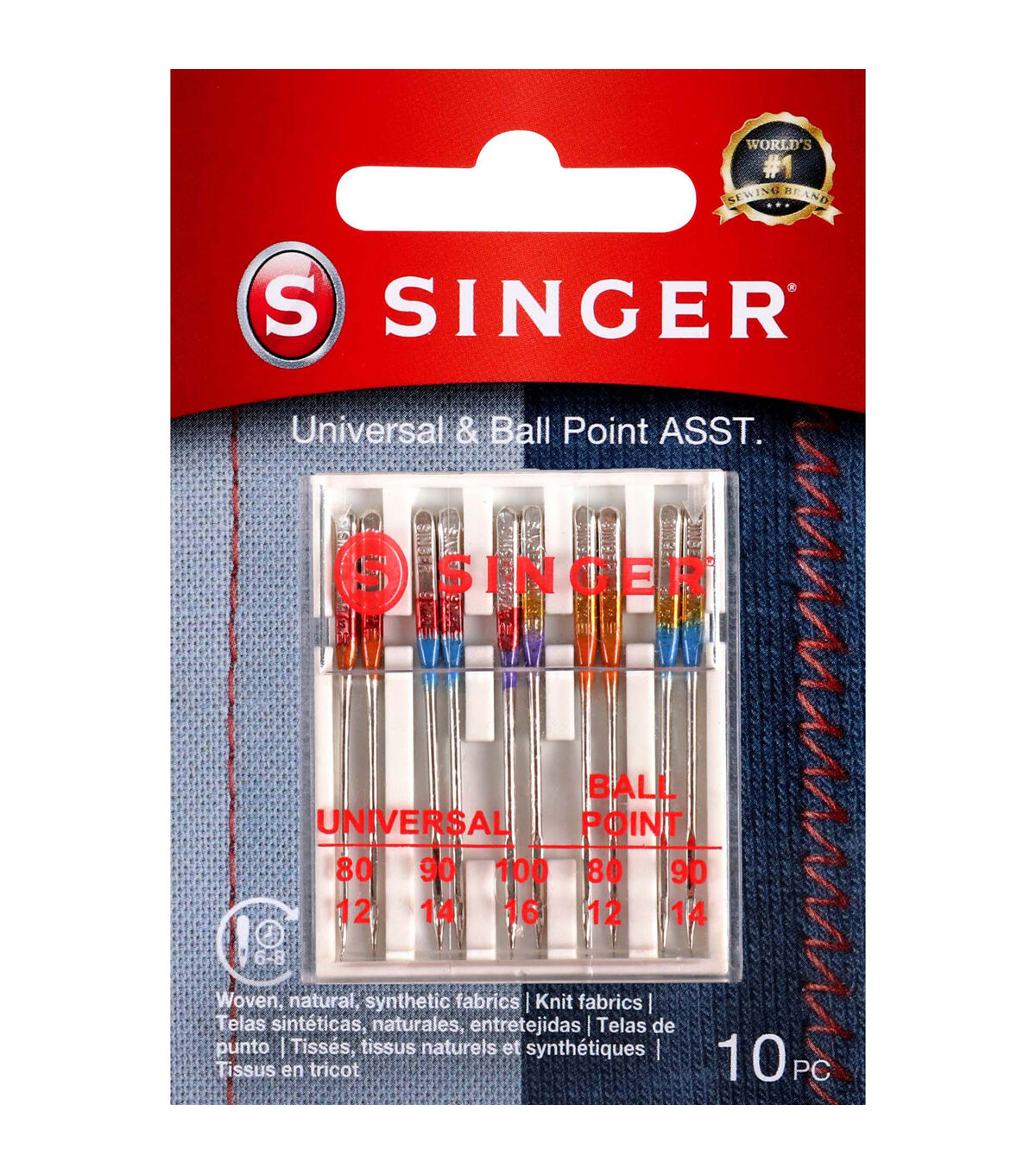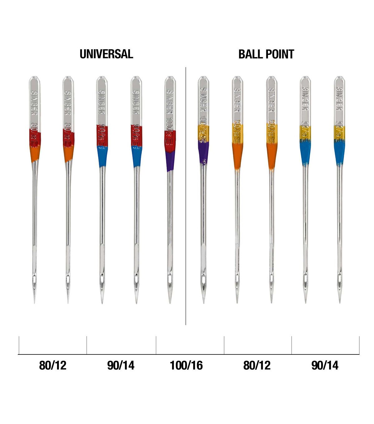 - The pack of 10 SINGER Regular and Ball point Sewing Machine Needles is a great starter kit offering the beginner sewing enthusiast two standard types of needles in varied sizes. Ball point needles are best used on knit fabrics, and regular point needles work best on woven fabrics. Machine needles are color coded to their sizes, which include: 2 orange size 80/12 to use on lightweight fabrics, 2 blue size 90/14 to use on medium weight fabrics, and 1 purple size 100/16 to use on heavyweight fabrics in both universal and ball point machine needles. The 10 machine needles come in a convenient plastic transparent case with individual storage slots and sizes marked on the clear cover. SINGER sewing machine needles can be used on SINGER, Brother, Kenmore, Bernina, Janome, Juki and other quality household domestic sewing machines. Dometic machines needles are not compatible with industry sewing machines.