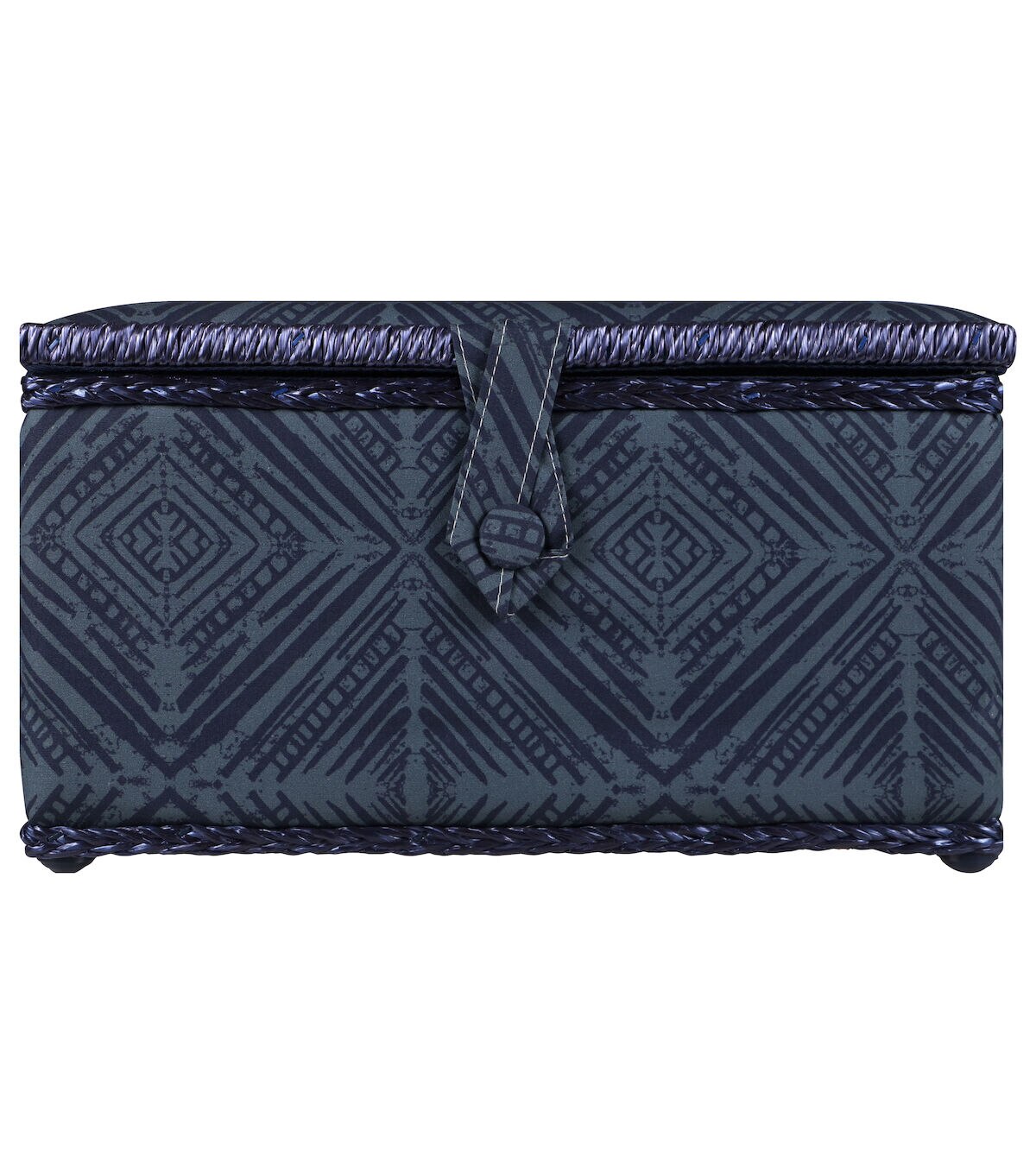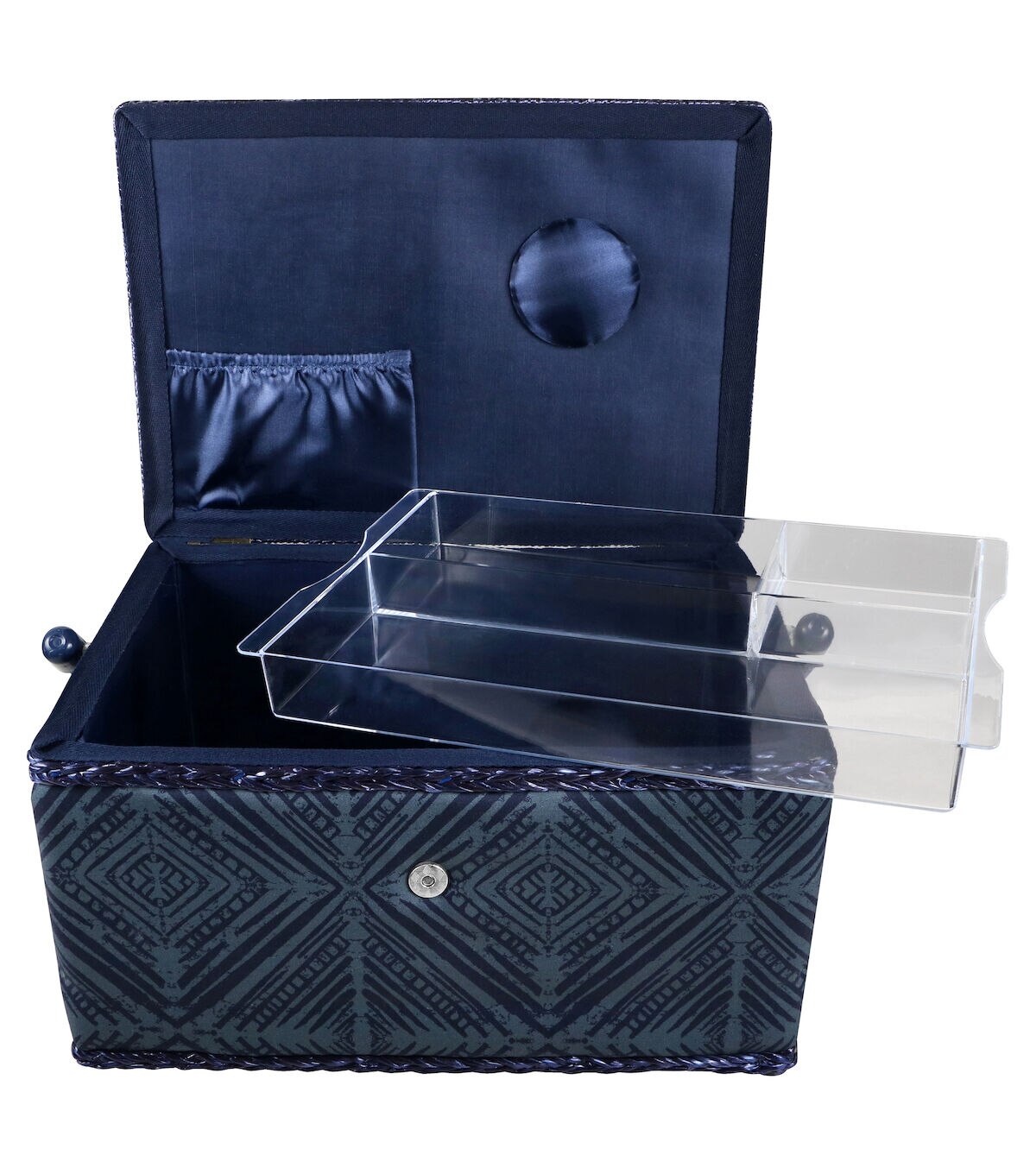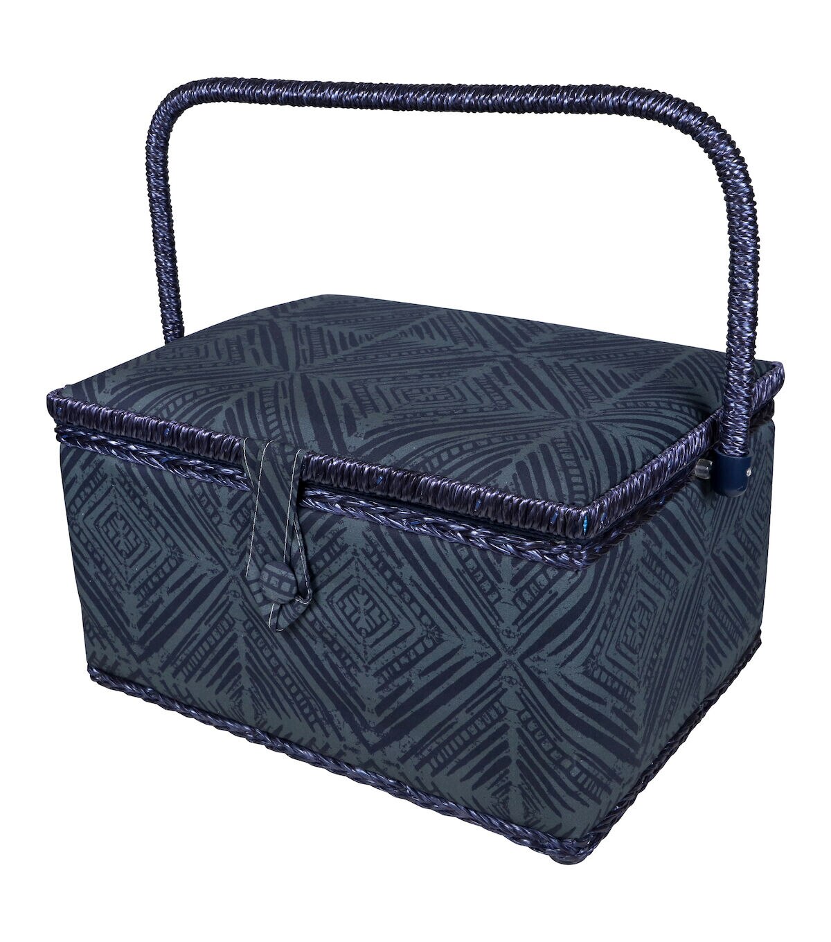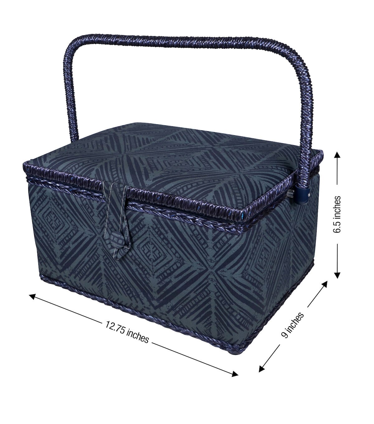 - Decorative sewing basket provides ample storage for all your sewing and crafting essentials featuring a teal geometric printed travel case with a navy blue satin polyester interior