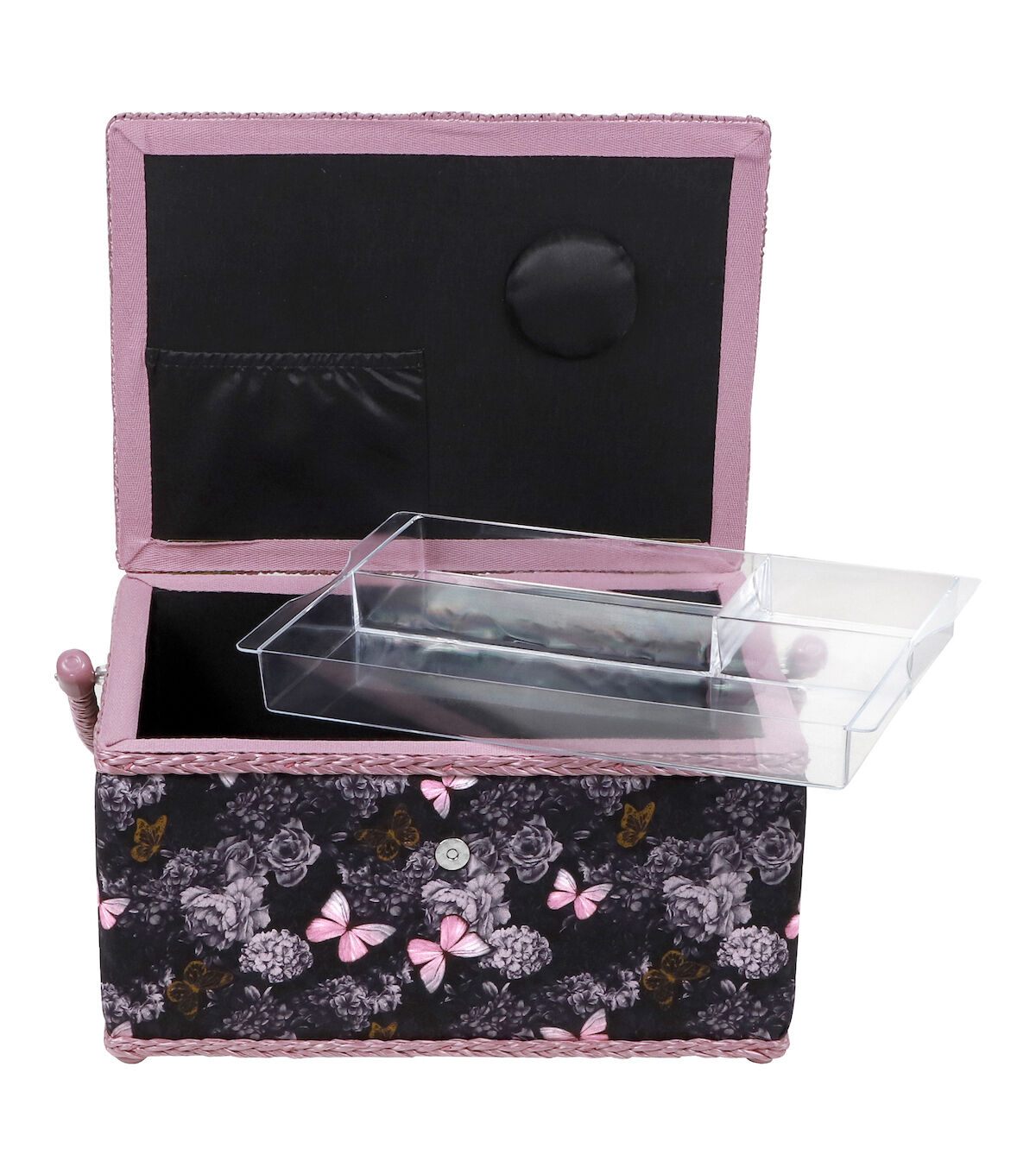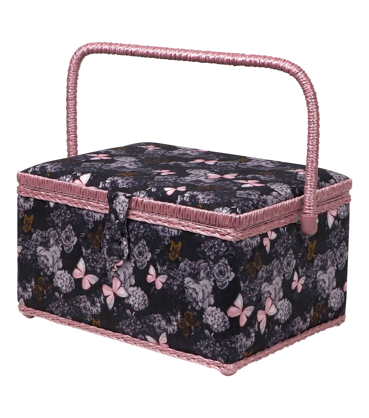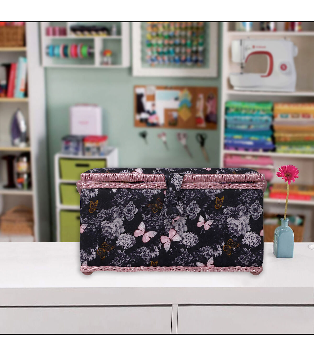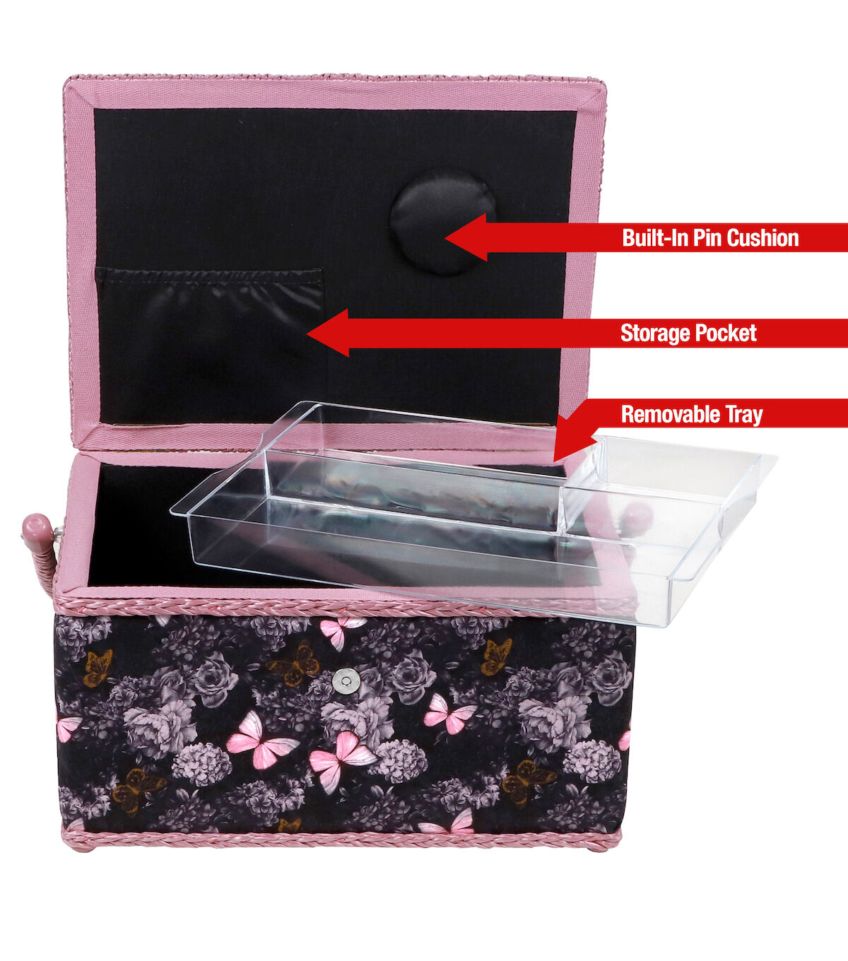 - Decorative sewing basket provides ample storage for all your sewing essentials featuring a black and purple floral with butterfly print and inner black lining