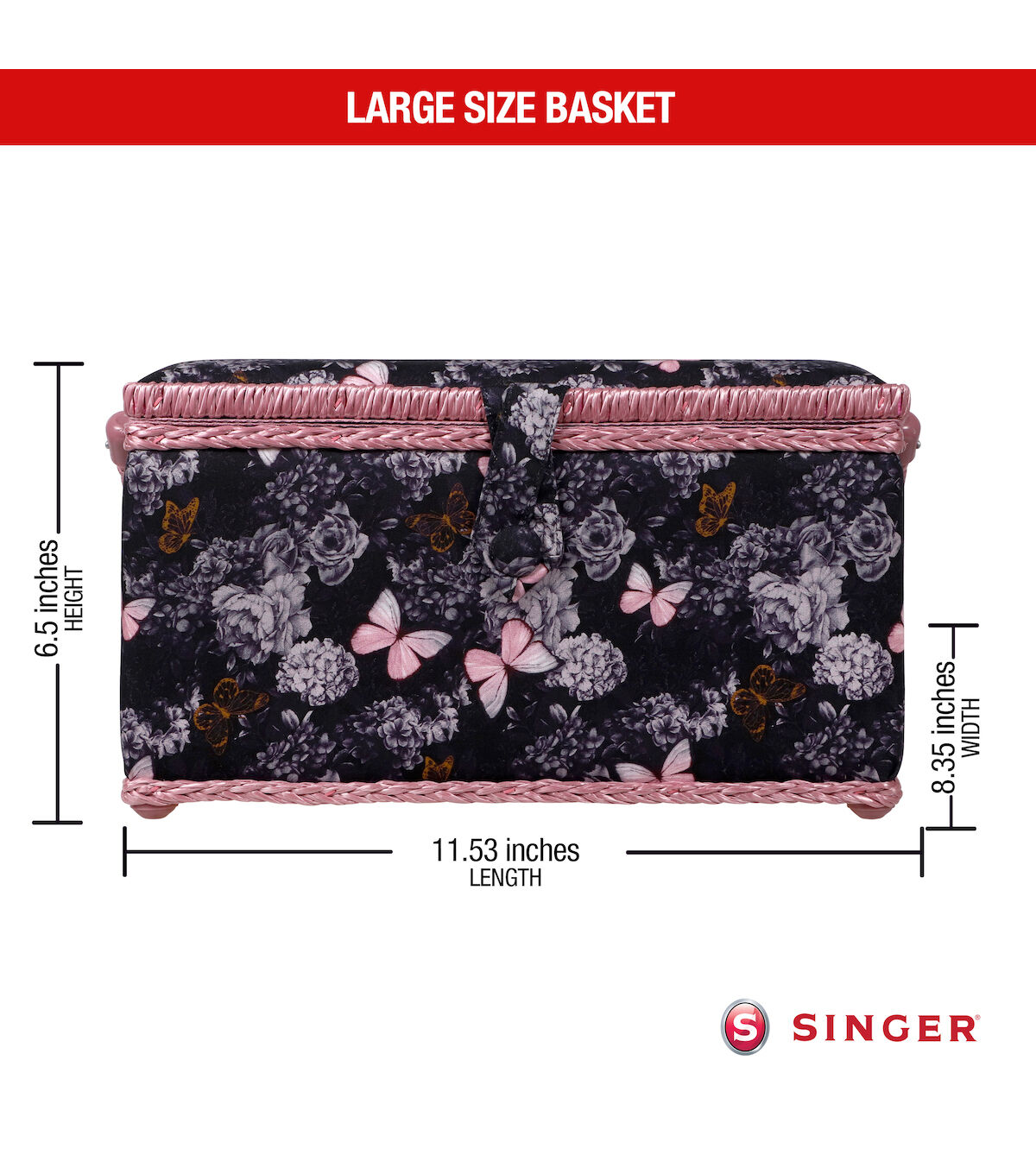 Whether you're a beginner or a seasoned pro, the SINGER Large Sewing Basket in Black & Purple Floral with Butterfly Print is the perfect sewing kit for you. Measuring 11.53" wide by 8.35" deep and standing 6.5" high, this sewing basket is large enough to fit all your sewing essentials, including sewing needles, thread, bobbins, and an assortment of sewing accessories and tools. The basket is covered in a high quality, wrinkle-free fabric in a black and purple floral print featuring pink and gold butterflies, making it both stylish and functional. Its sturdy frame and matching collapsible handle make the sewing kit easy to store and an ideal travel case to carry your essentials for sewing projects on the go.