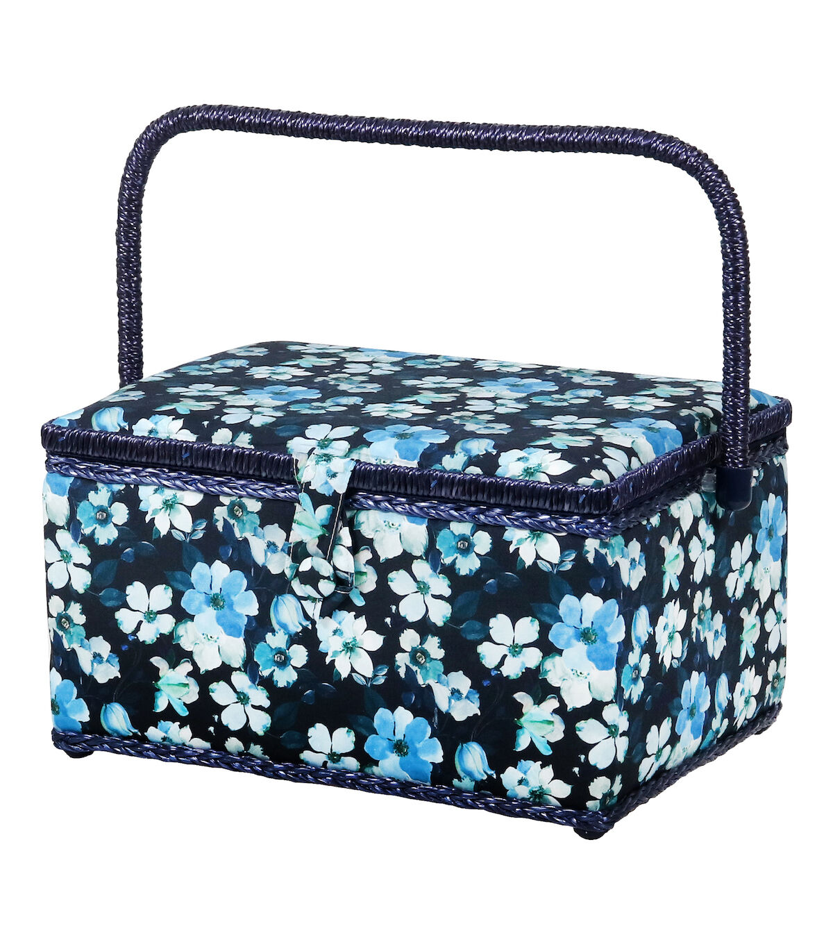 - Decorative sewing basket provides ample storage for all your sewing and crafting essentials featuring an exclusive blue pansies printed travel case with a blue satin polyester interior