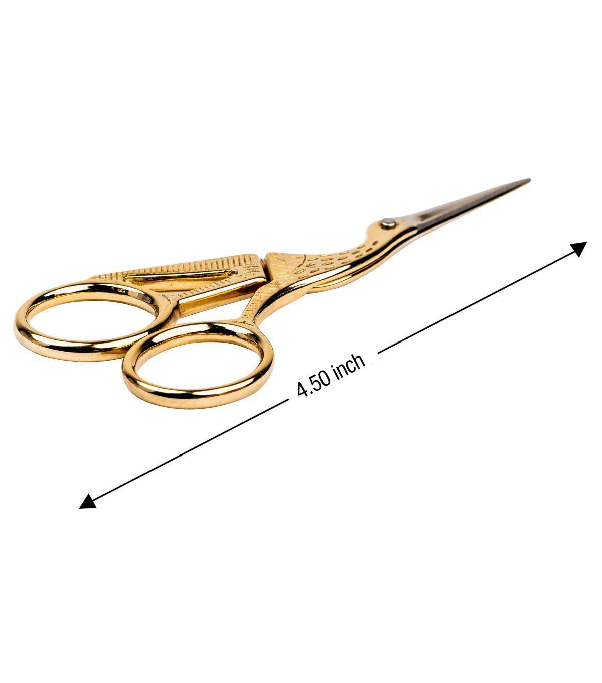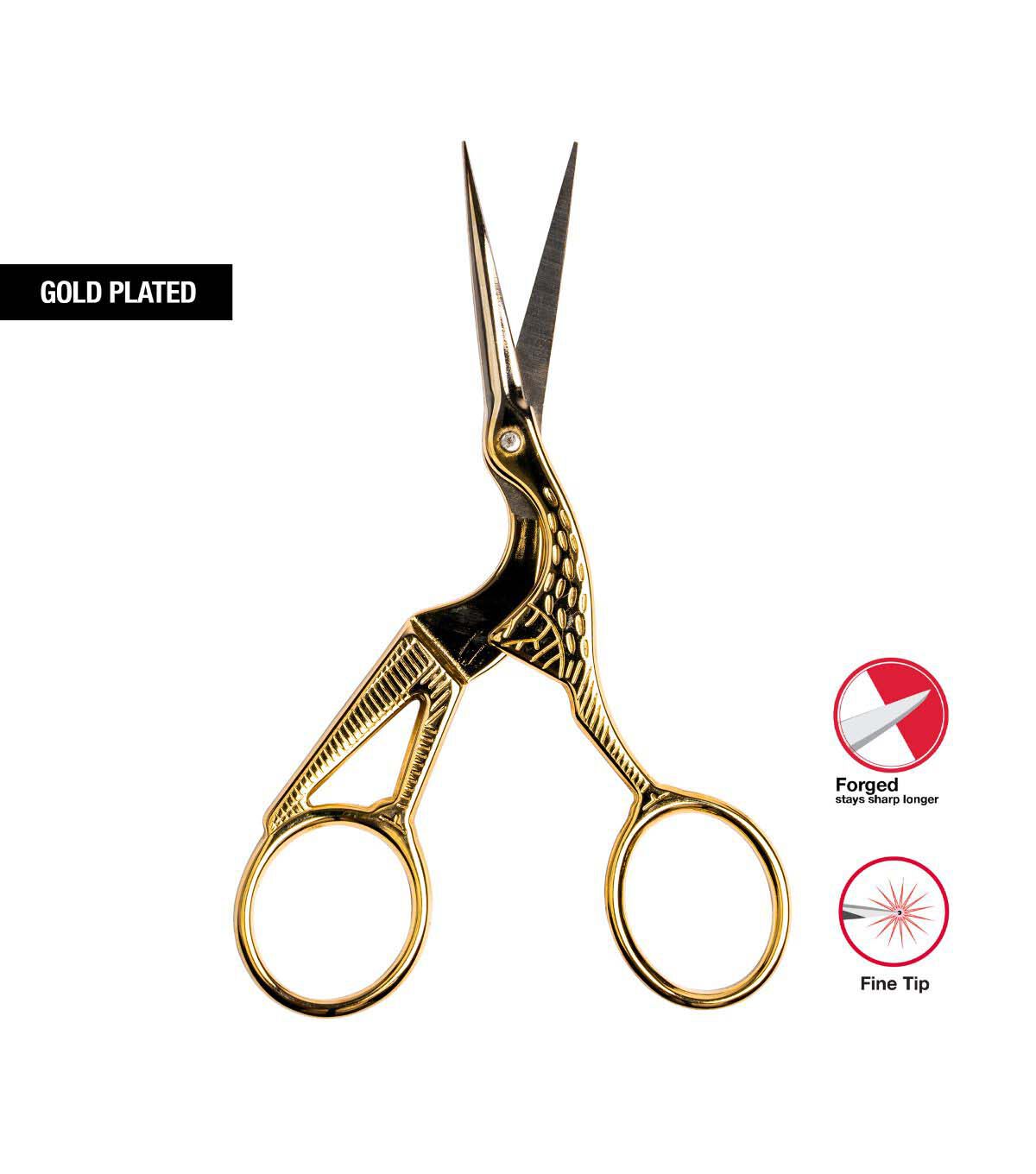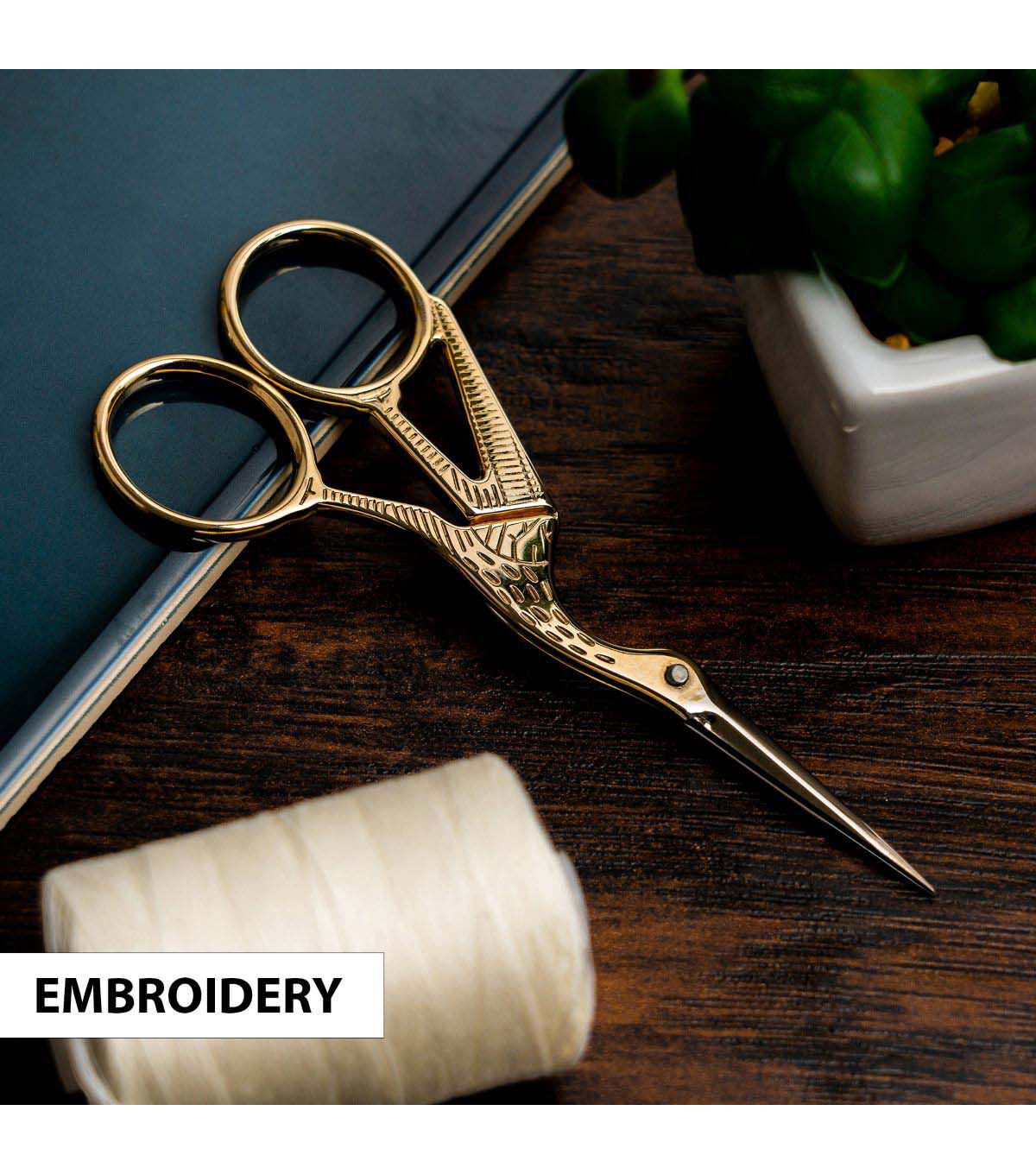 - 4" stork embroidery scissors feature a gold plated stork design handles with a fine tip blade for tasks that require precision cutting for embroidery, cross-stitch, quilting, sewing, crafting, and more