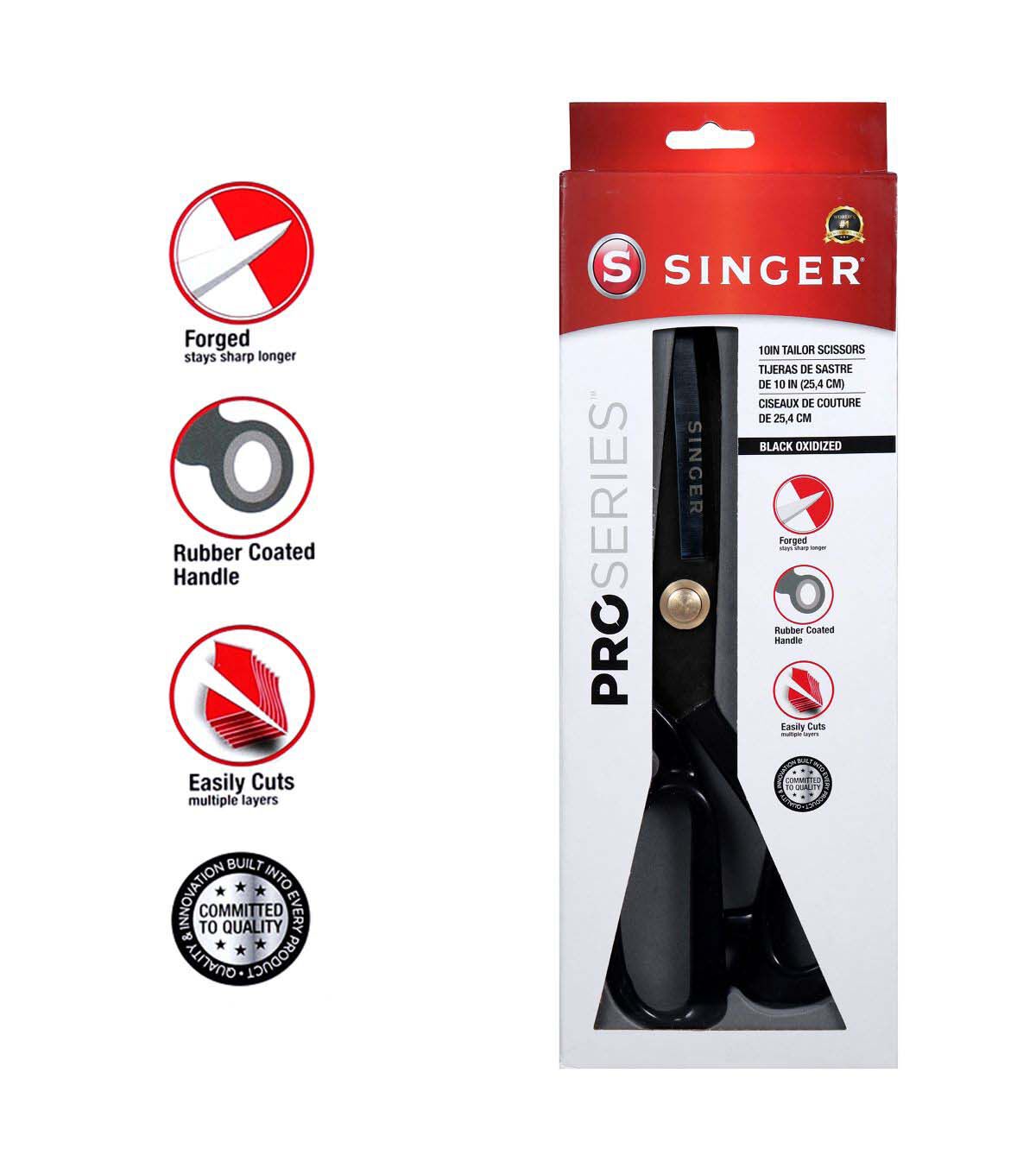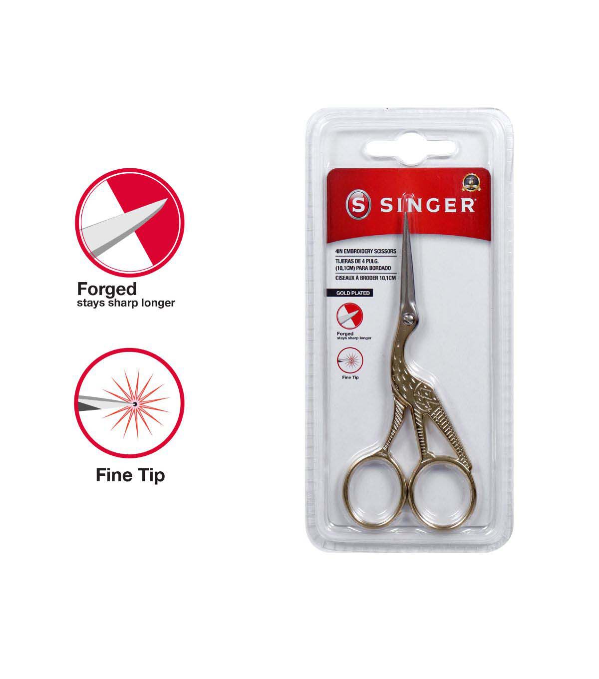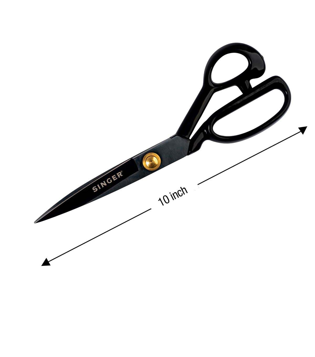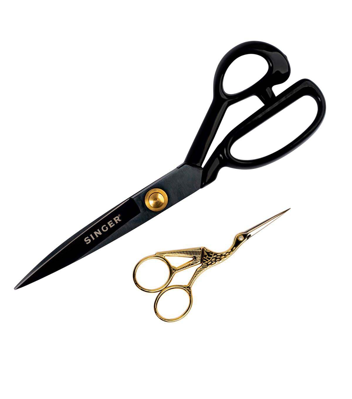 The SINGER Sewing Scissors Set includes the 10 inch ProSeries Tailor Scissors and 4 inch gold plated Stork Scissors. Whether used for dressmaking or needlework, this set is designed to cover all your fabric and thread cutting needs. The SINGER ProSeries Heavy Duty scissors measure 10 inches in length and feature razor-sharp blades designed to easily cut through multiple layers of fabric with extraordinary precision, saving you time on large sewing projects without sacrificing precise cuts. The blades have an oxidized black matte finish to give them a sleek, professional look. The SINGER Forged Embroidery Scissors measure 4 inches in length and feature fine tip blades for detailed cutting work. The gold plated, stork-shaped design adds a touch of elegance and makes these scissors a beautiful addition to any sewing kit. For best performance, oil joints regularly and keep scissors clean and moisture free.