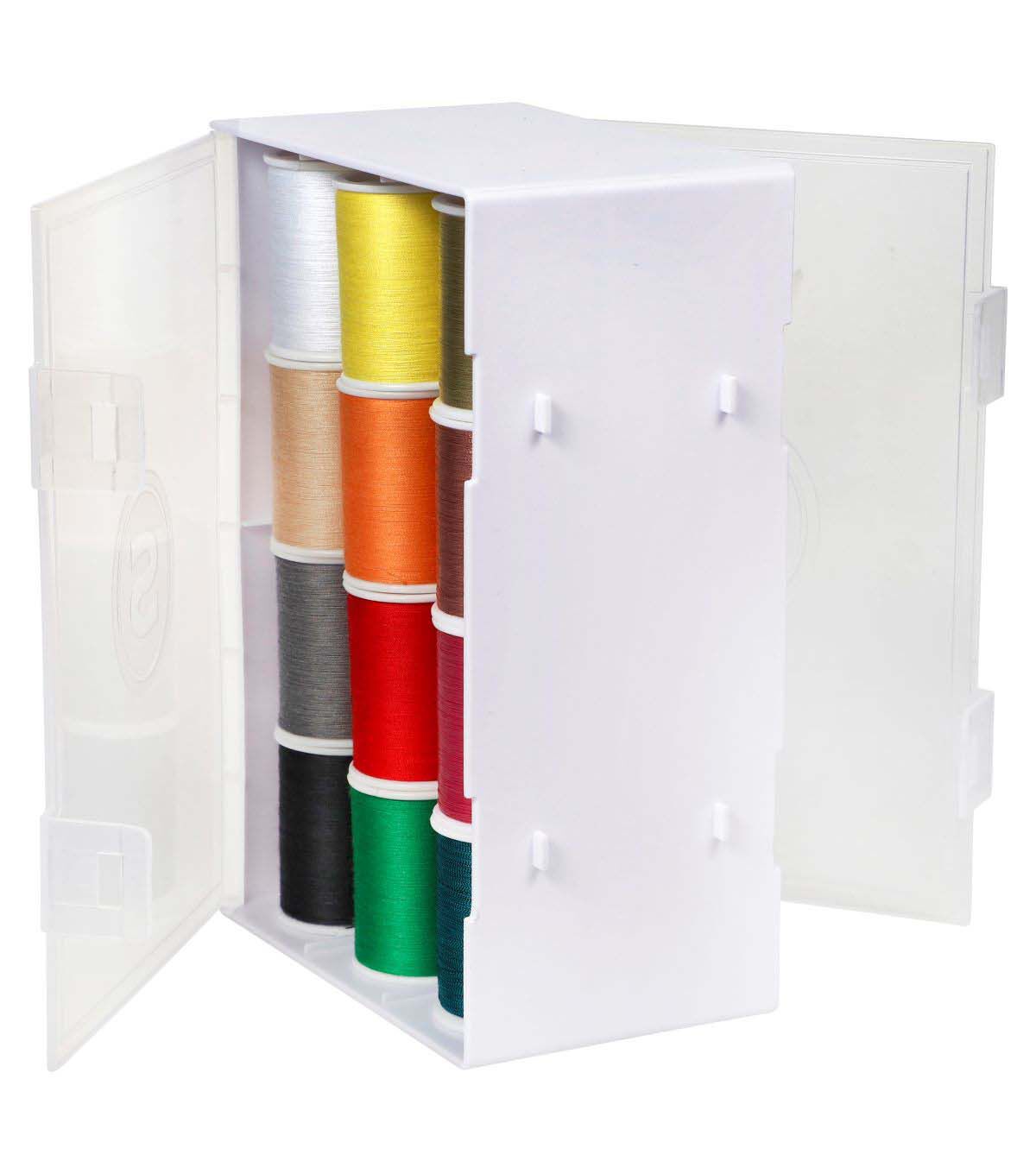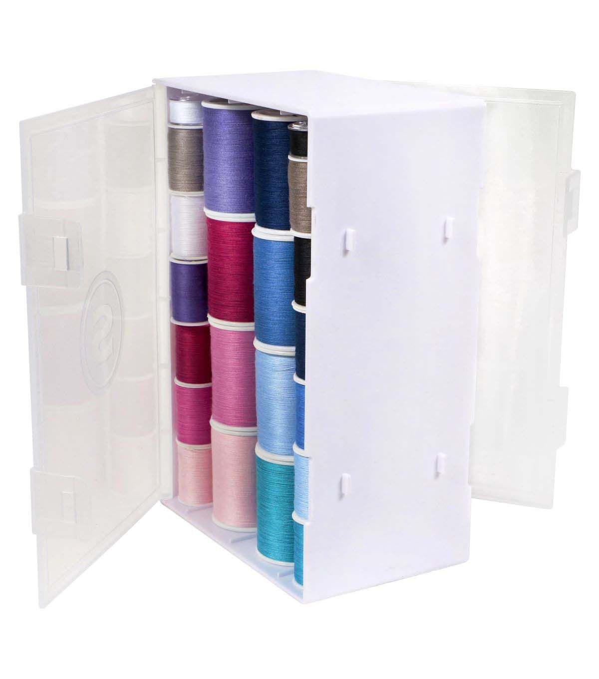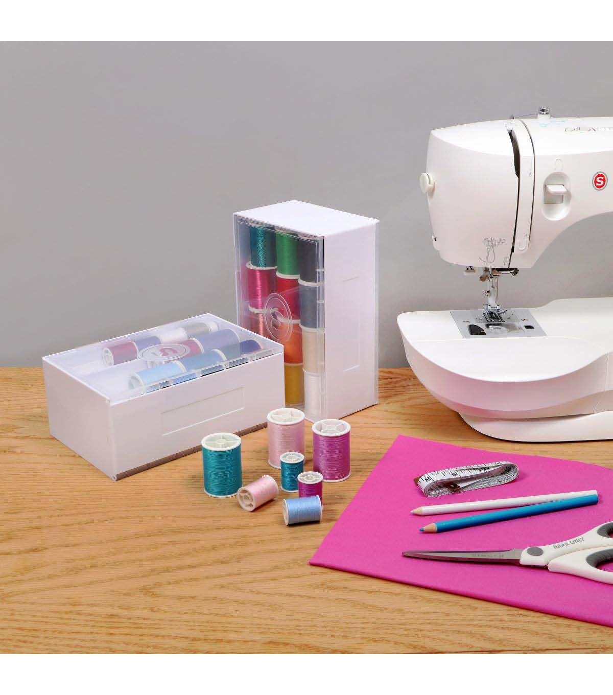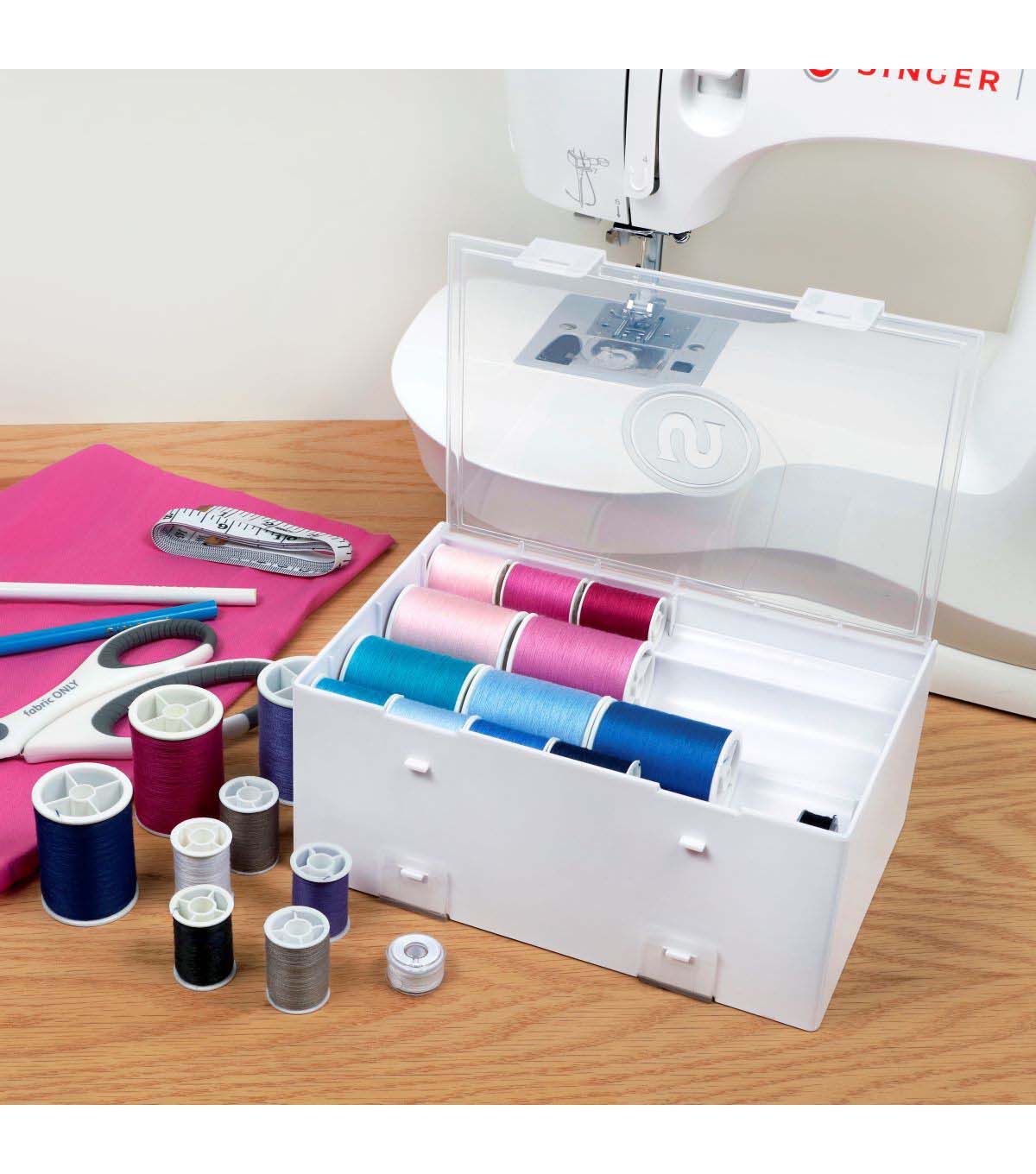 Introducing the perfect blend of organization and innovation with the SINGER Thread Spool Organizer. This thread spool organizer innovatively offers separate channel spaces on each side, accommodating a total of 32 thread spools each. This includes space for 20 large spools across both sides and an additional section dedicated to up to 12 small thread spools or European-sized spools and bobbins. With the spools laying flat in their concave channels, selecting your desired thread becomes effortless, letting you jump straight into your creative process. The clear, double-sided lids offer a clear view of your neatly organized threads, but they also protect them from dust and other elements. With secure latches, you can be confident that every spool is safely stored. Space isn't compromised with these sewing supply organizers. Whether you prefer them stacked horizontally or aligned vertically, these organizers adapt to your workspace needs. And with the added touch of a recessed label slot, you can categorize your threads by color, type, or project, streamlining your crafting sessions.