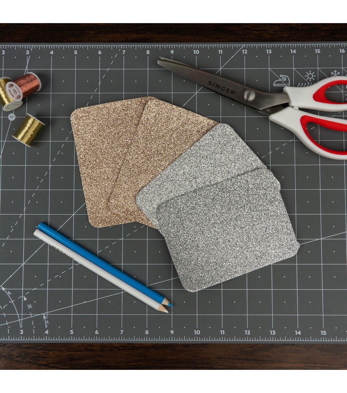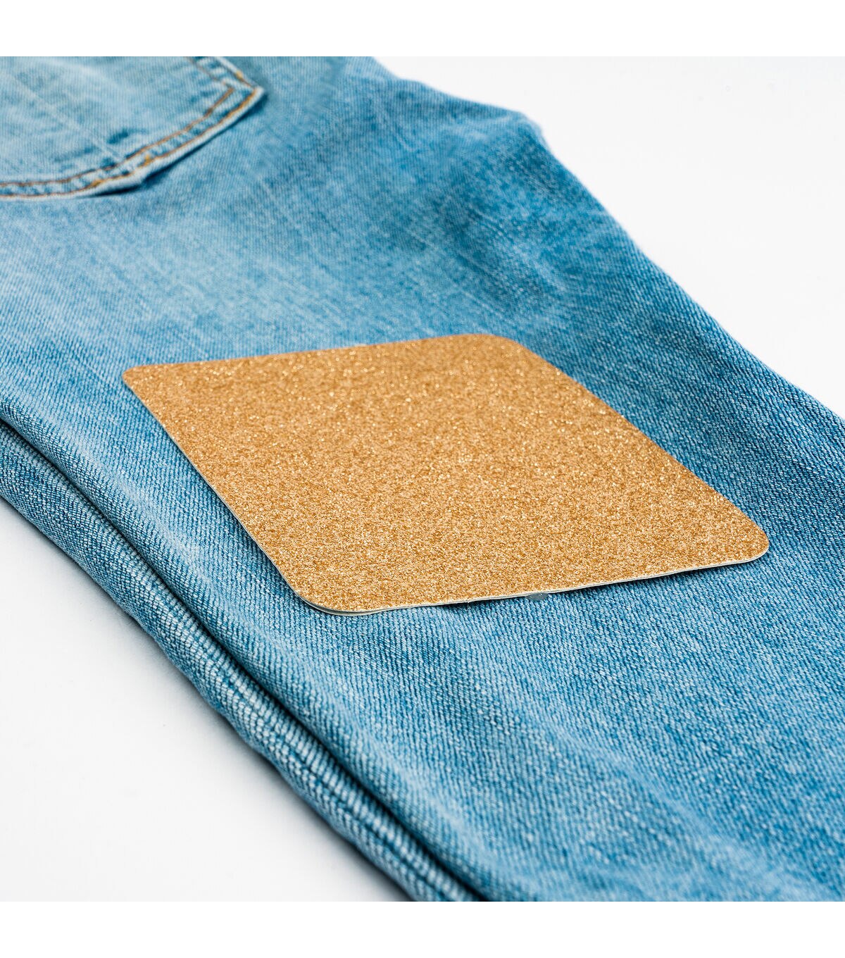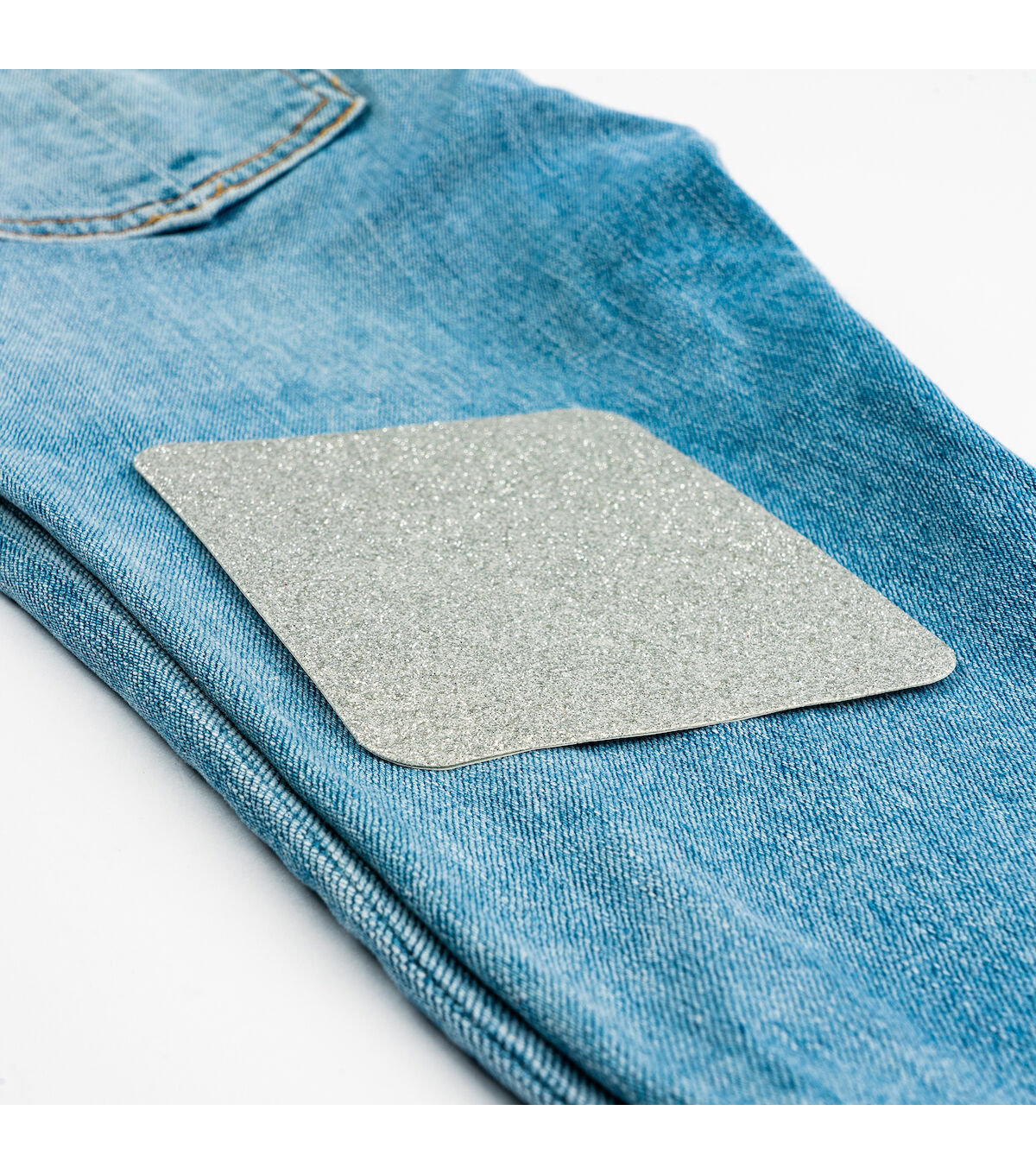 The Singer Iron-on Glitter Patches - Gold & Silver are easy solutions to both apparel repairs and clothing embellishments. Each pack contains four patches, two in gold and two in silver with each patch made from a sturdy polyester-cotton blend material with a glittery polyurethane resin finish. Patches measure 3.75 x 5 inches, which is large enough to be cut into custom shapes and used for embellishing your next fashion or home decor project. They can also be used to repair a ripped knee in your favorite jeans. You can easily iron it onto fabric wherever you need it without the need for stitching. All you need to do is preheat the iron for five minutes on high or on the cotton setting. Never use steam or exceed safe ironing temperature. Heat and smooth the fabric to be repaired first by running the iron over the area, and then placing the patch with the adhesive side down. Press firmly and evenly for 45 seconds, repeating around the edges to ensure that the patch adheres well. After cooling, test the edges to make sure the patch is sealed all the way around. If needed, or if lifting occurs after washing, repeat the steps above.