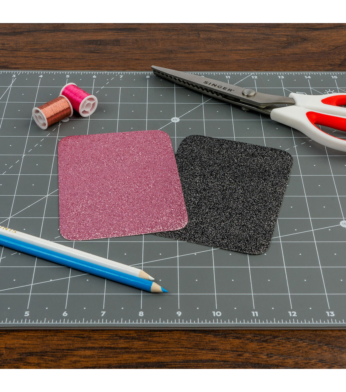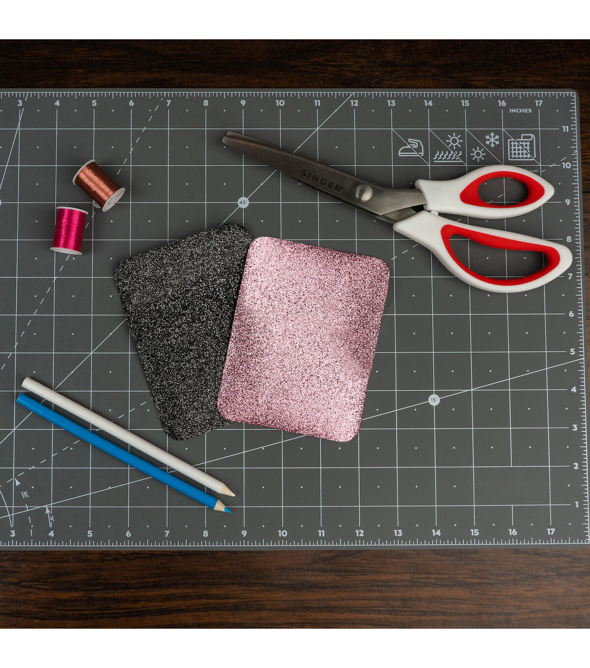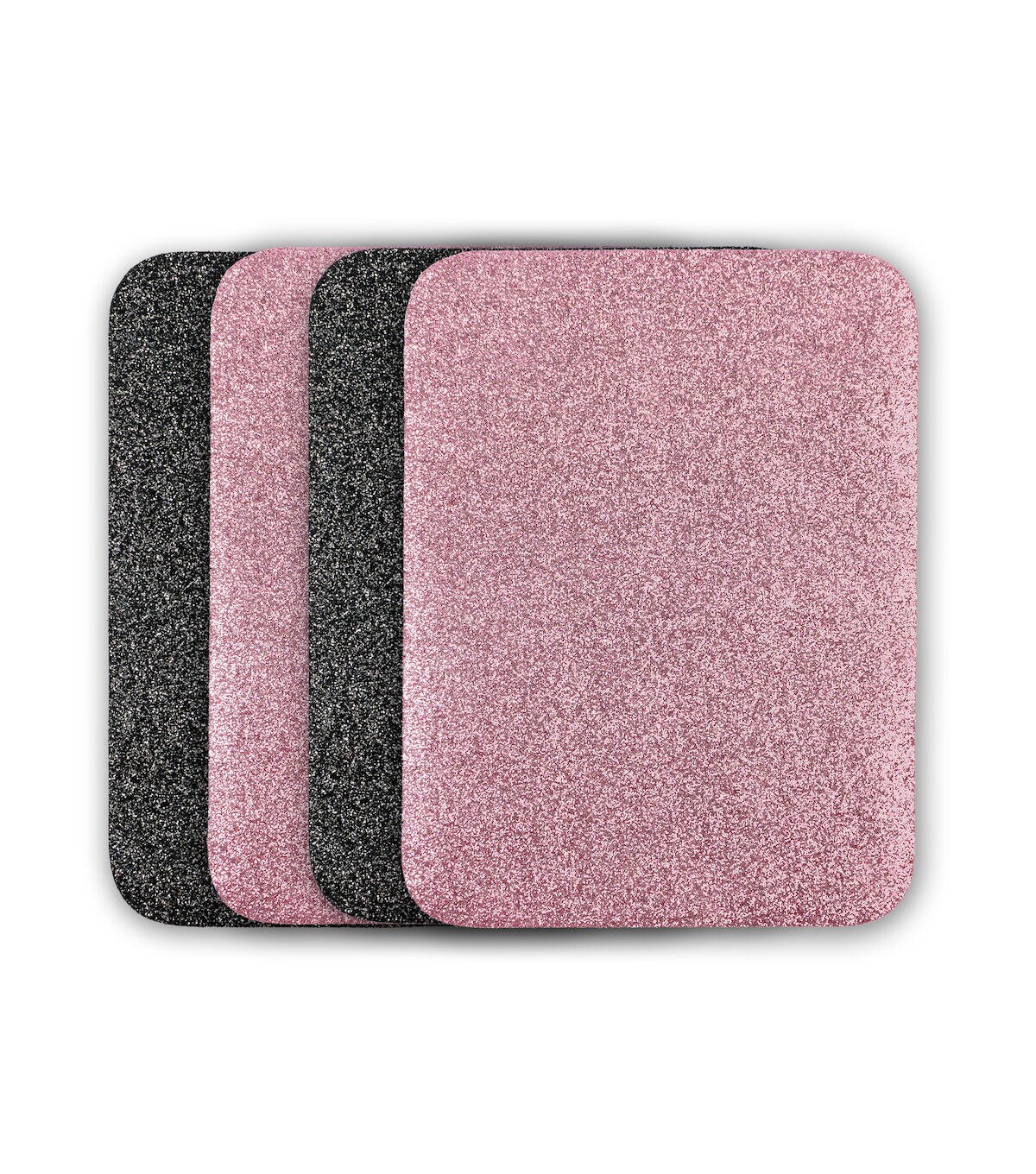 The Singer Iron-on Glitter Patches - Rose Gold & Black are easy solutions to both apparel repairs and clothing embellishments. Each pack contains four patches, two in rose gold and two sporting a black-hued glitter finish, with each patch made from a sturdy polyester-cotton blend material with a glittery polyurethane resin finish. Patches measure 3.75 x 5 inches, which is large enough to be cut into custom shapes and used for embellishing your next fashion or home decor project. They can also be used to repair a ripped knee in your favorite jeans. You can easily iron it onto fabric wherever you need it without the need for stitching. All you need to do is preheat the iron for five minutes on high or on the cotton setting. Never use steam or exceed safe ironing temperature. Heat and smooth the fabric to be repaired first by running the iron over the area, and then placing the patch with the adhesive side down. Press firmly and evenly for 45 seconds, repeating around the edges to ensure that the patch adheres well. After cooling, test the edges to make sure the patch is sealed all the way around. If needed, or if lifting occurs after washing, repeat the steps above.
