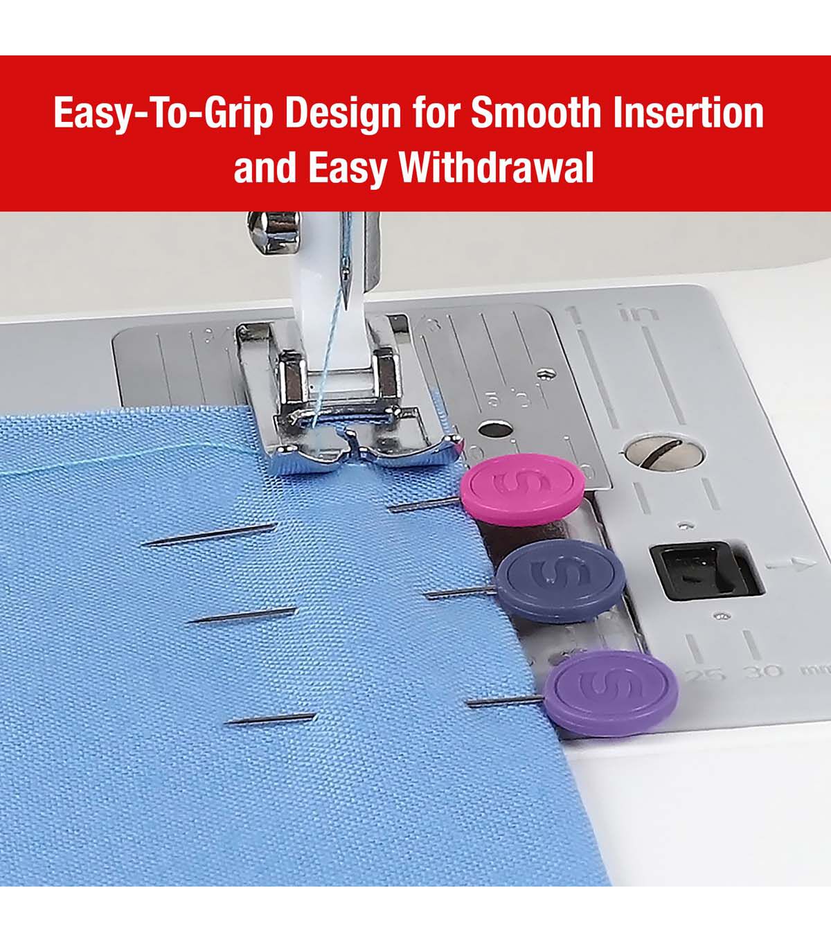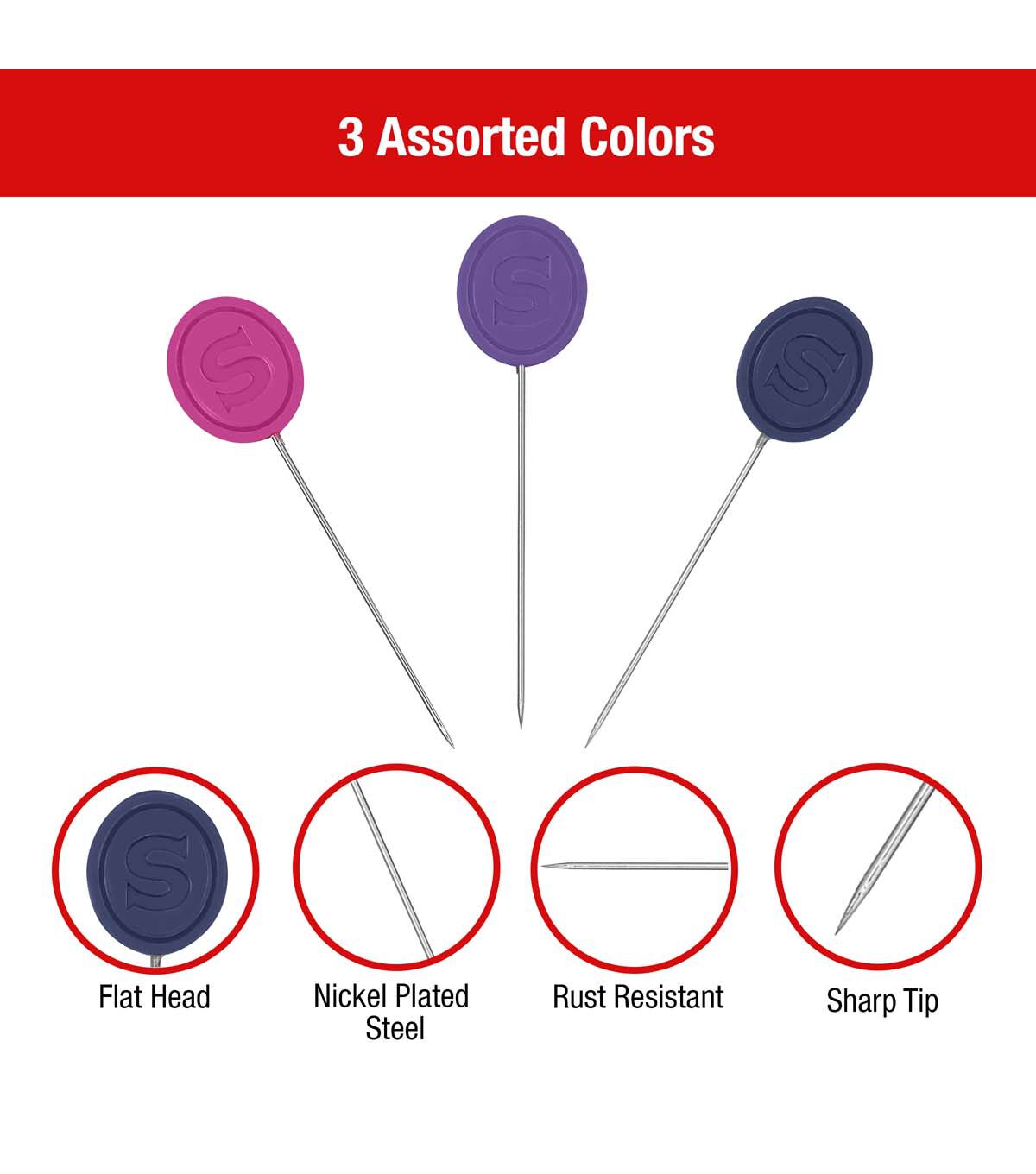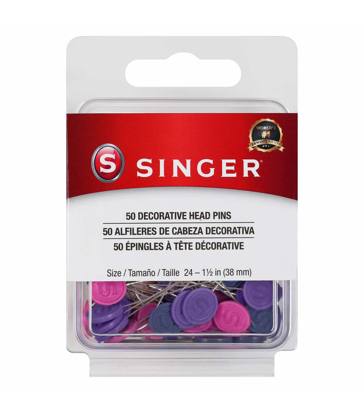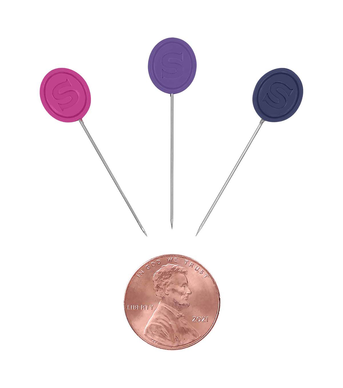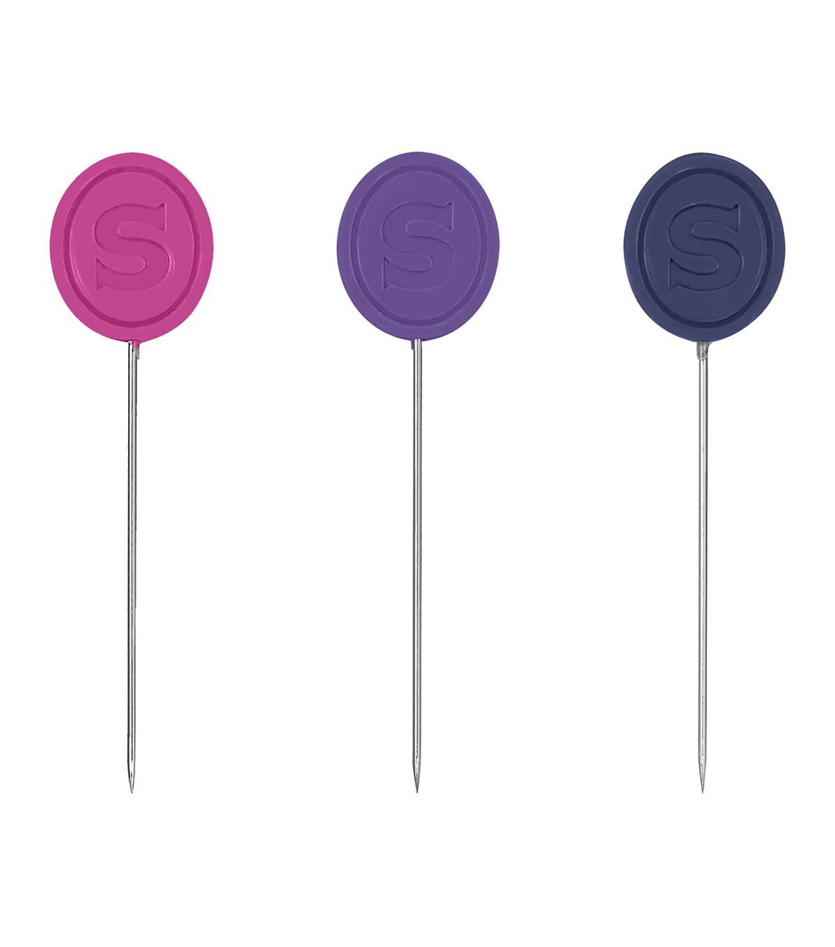 Experience an upgrade in your sewing essentials with the SINGER 50ct Decorative Head Pins. Distinct from standard pins, these cute sewing pins are thoughtfully designed for both seasoned professionals and hobbyists who appreciate quality and functionality in every tool they use. This comprehensive set of 50 colorful pins ensures you're equipped for projects large and small. Designed in easily distinguishable colors—pink, blue, and purple—they stand out on various fabric types, reducing the time you might spend searching for a misplaced pin. The flat head design proudly displays the iconic SINGER embossing – a testament to quality and legacy while providing an easy grip and improving efficiency, especially when working on intricate designs or multiple layers. Constructed from robust nickel-plated steel, these pins promise durability. The nickel-plated finish makes these sewing pins rust-resistant, ensuring that they remain a staple in your sewing kit for years. Measuring at 1 1/2 inches (38mm), they are versatile enough for a range of tasks, from securing patterns to holding fabric layers in quilting.
