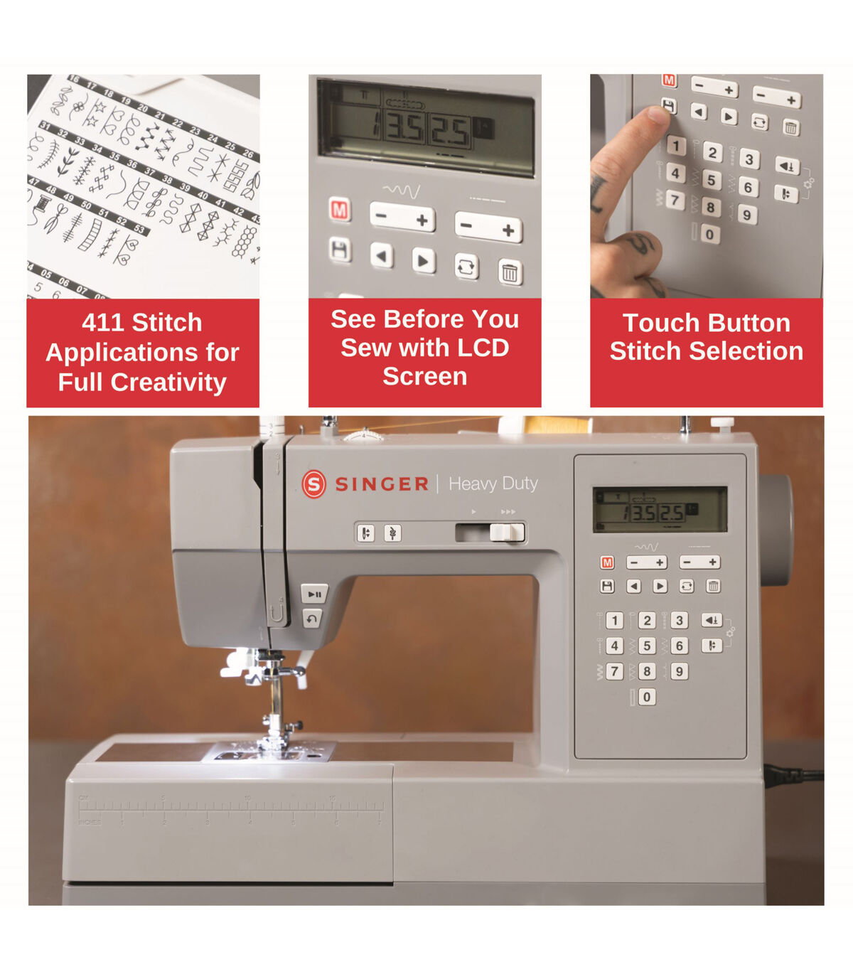 - 411 Stitch Applications- Enjoy a wide range of sewing techniques for creativity and customization. Choose basic, stretch and decorative stitches.